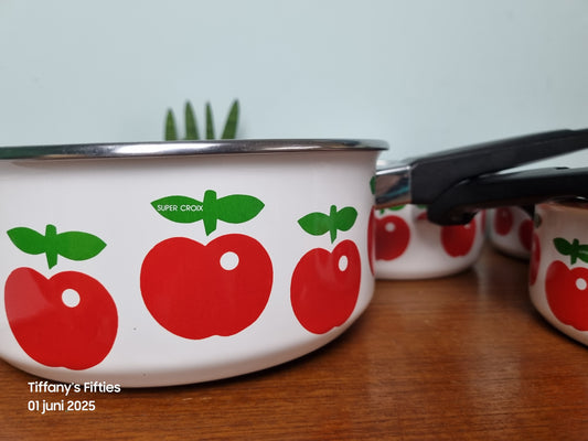 UitverkochtVintage pannenset – emaille met rood appeldecor