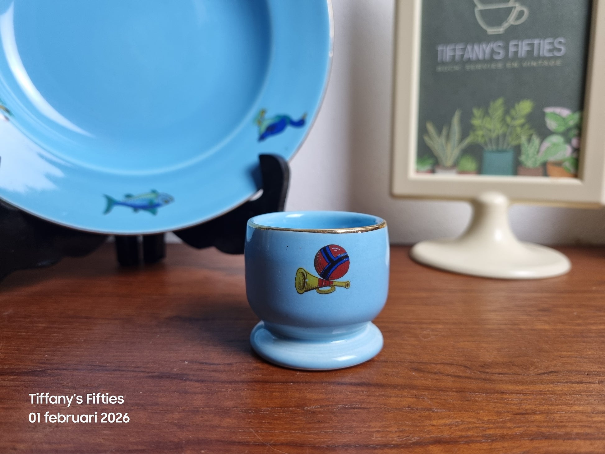 Diep bordje en eierdop van Boch La Louvière, kinderservies. Gemaakt uit lichtblauw geglazuurd aardewerk met gouden rand en kleurrijke, decals van dieren zoals een haan, vlinder, ezel, eend, muis, en een meisje in rode jurk, typerend voor het vrolijke en speelse design van Boch kinderservies uit de jaren '50-'60.