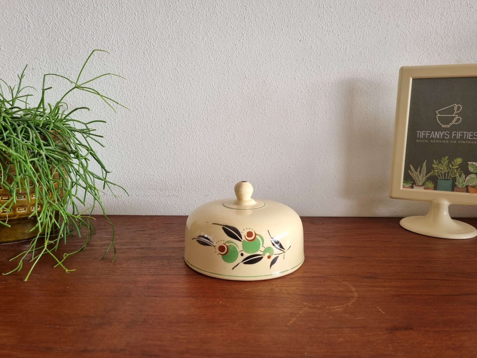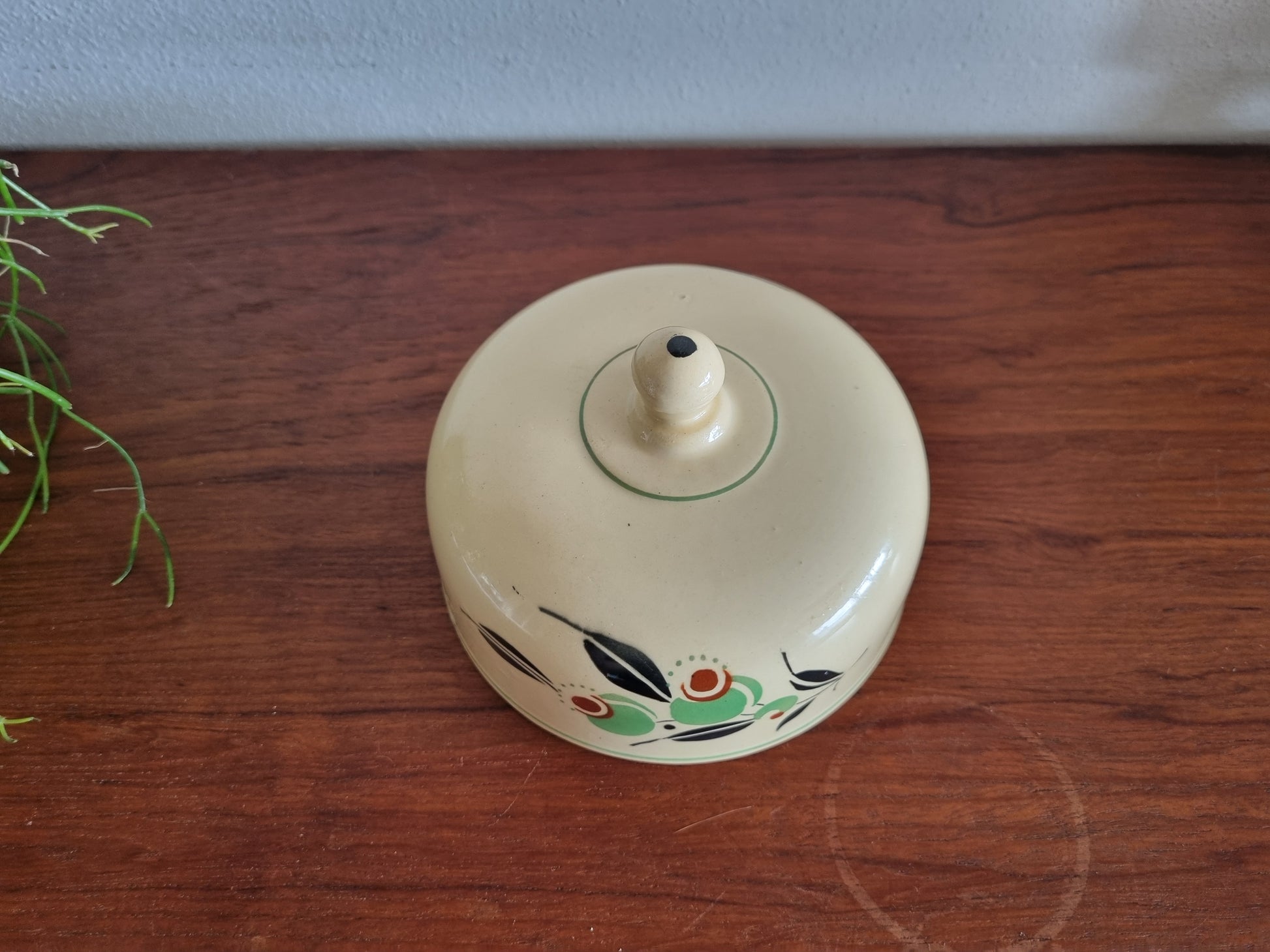 Deksel van botervloot van Boch Frères, decor Olivier. Uitgevoerd in crèmekleurig aardewerk met handgeschilderde olijfgroene en oranje motieven, afgewisseld met zwarte bladeren en een fijne groene rand.