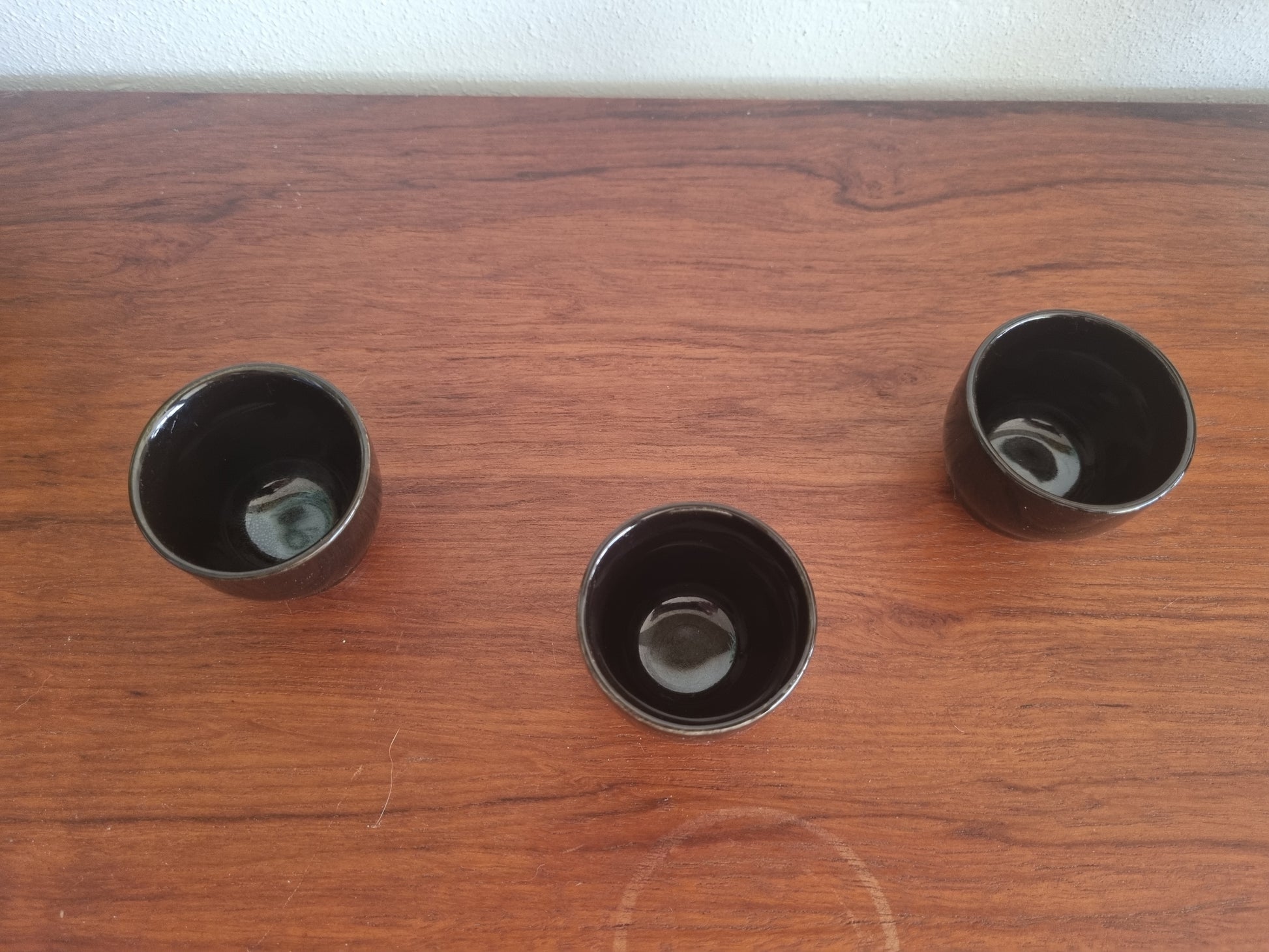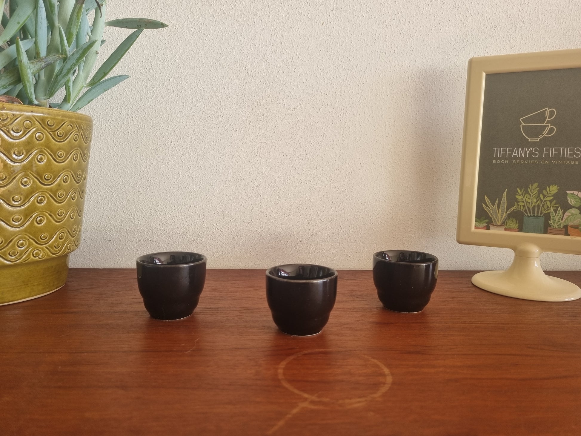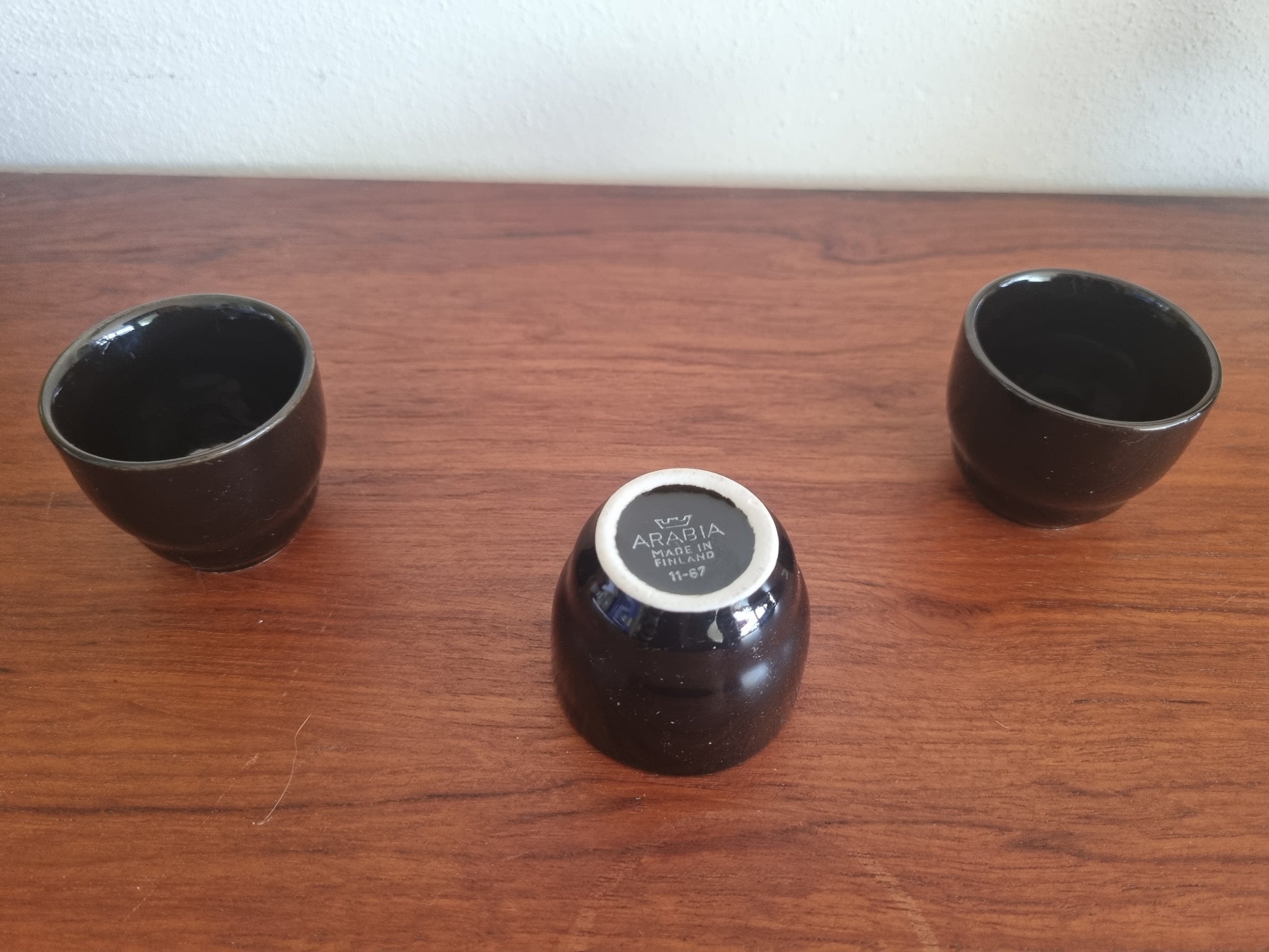 Eierdopjes van Arabia Finland in donkerbruin geglazuurd steengoed met een sobere, Scandinavische vormgeving.