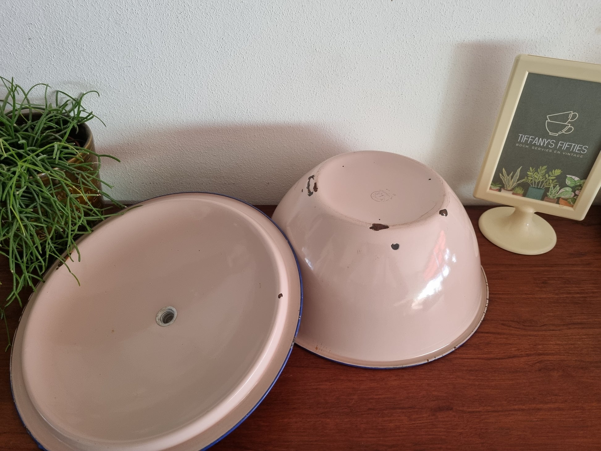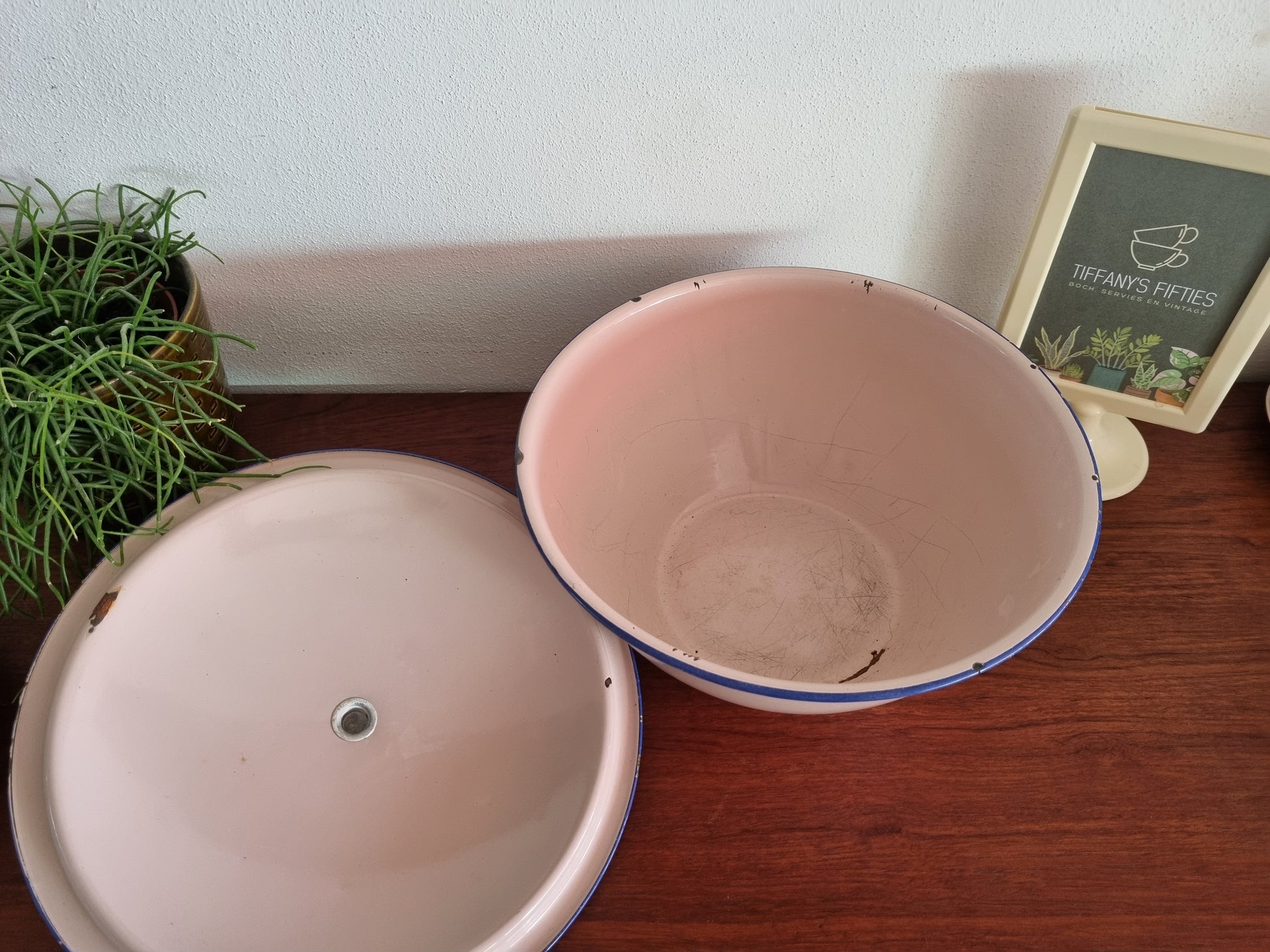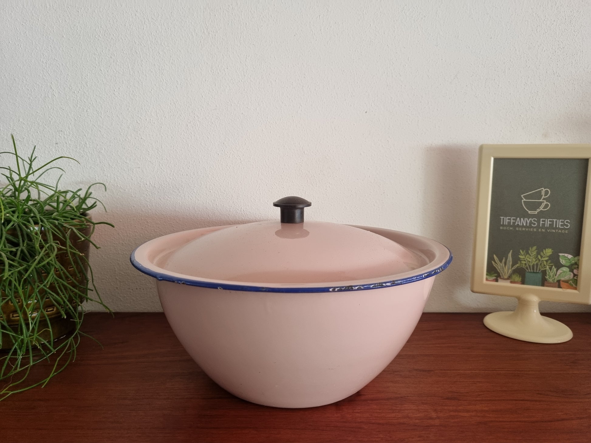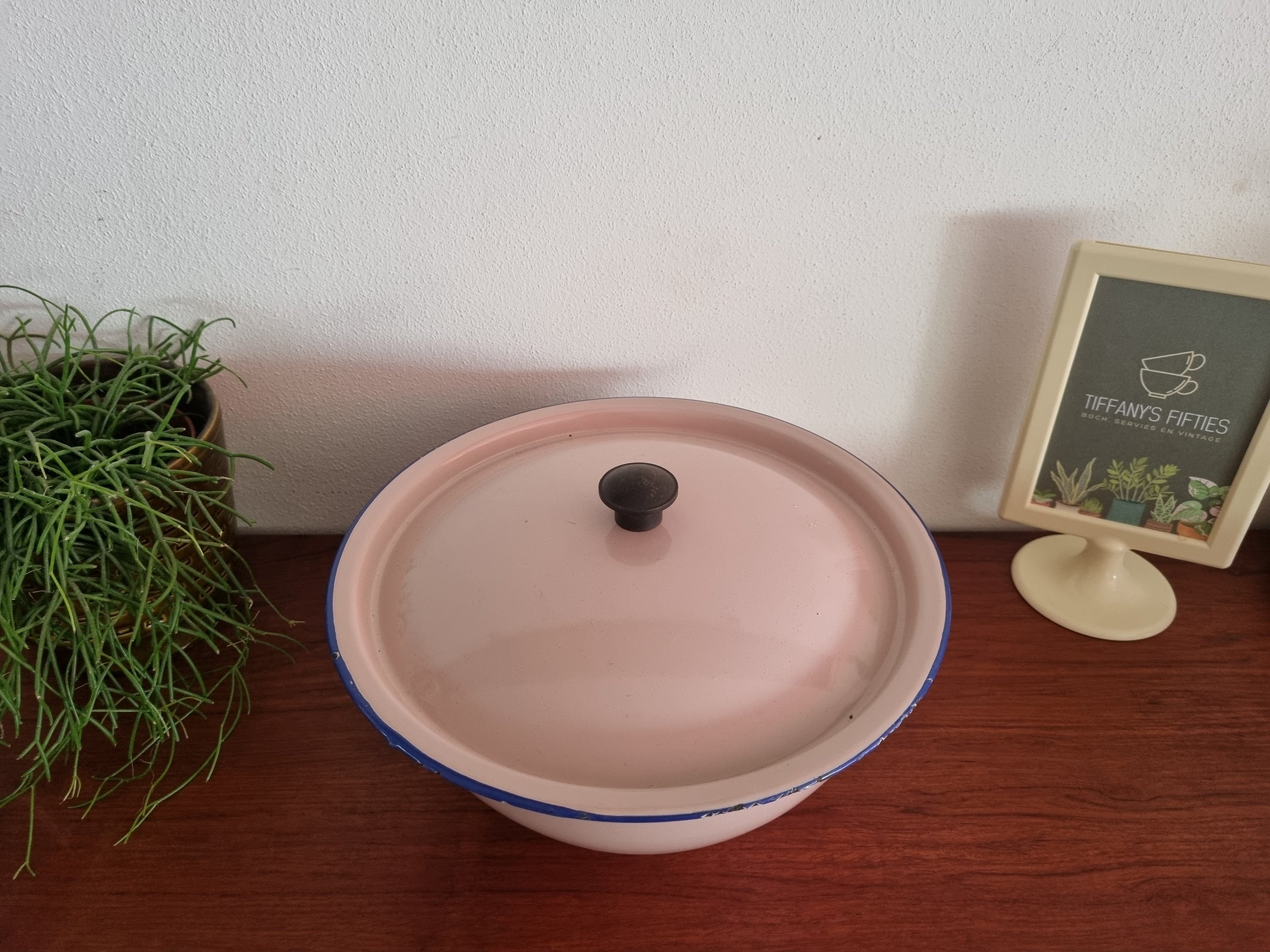 Emaille kom met deksel in zachtroze, voorzien van een donkerblauwe rand en zwart handvat op het deksel. De kom heeft een typische bolle vorm en combineert functionaliteit met charmante retro-uitstraling.