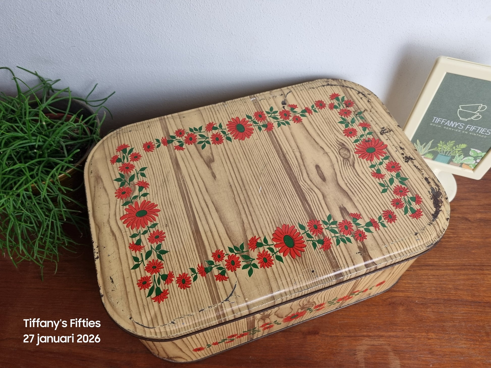 Grote vintage blikdoos / naaidoos met houtnerfdecor en een vrolijke bloemenrand in rood en groen. De doos heeft een afgeronde rechthoekige vorm en is uitgevoerd in bedrukt metaal, typisch voor de jaren 50–60. Het bloemendecor rondom en op het deksel geeft dit stuk een warme, huiselijke retro uitstraling.