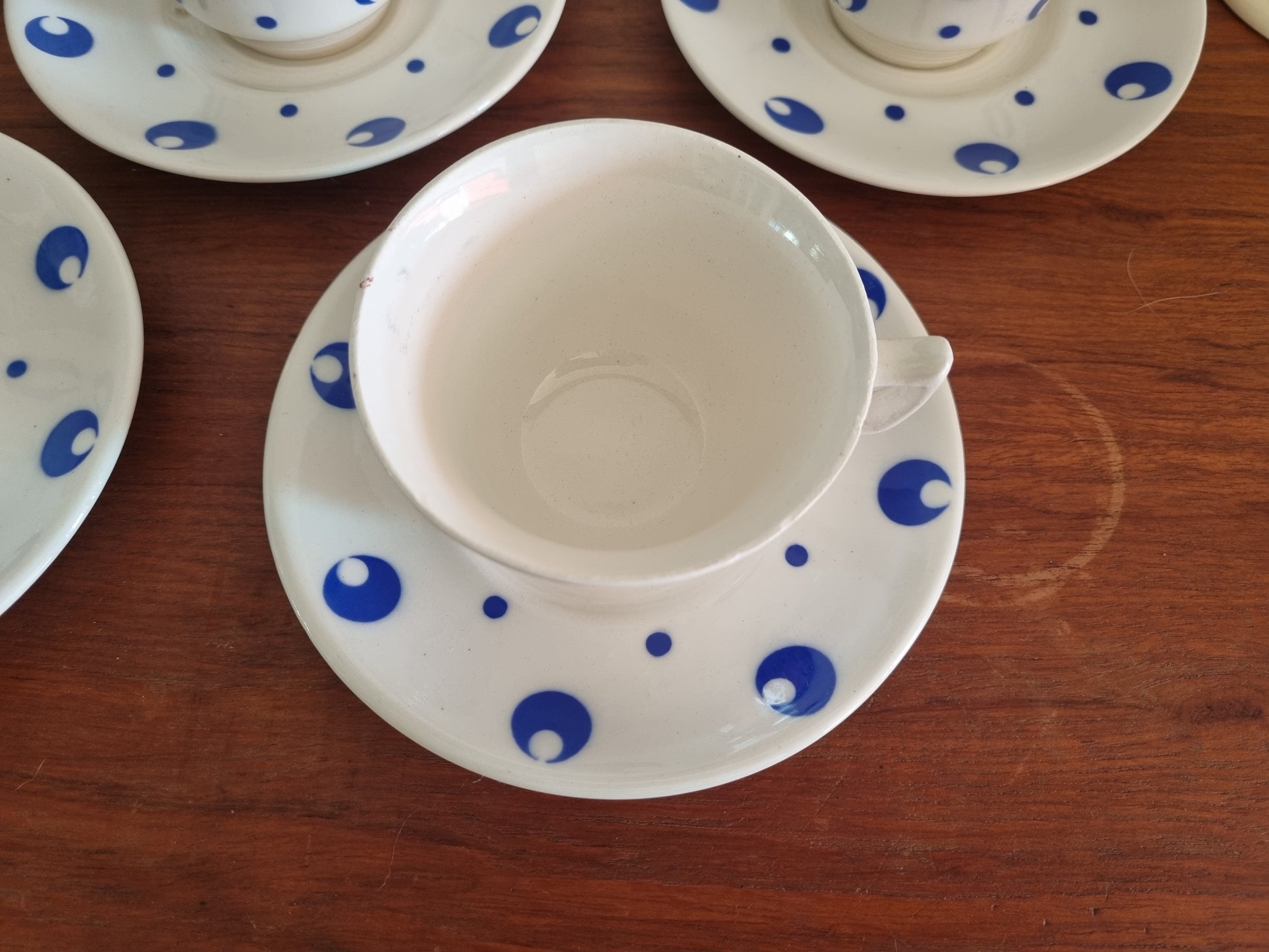 Kop en schotel van Boch La Louvière, model Amsterdam, met een speels blauw decor van stippen en halve manen op wit aardewerk. Een vrolijk en modern ontwerp dat perfect de retrostijl van de jaren ’60 weerspiegelt.