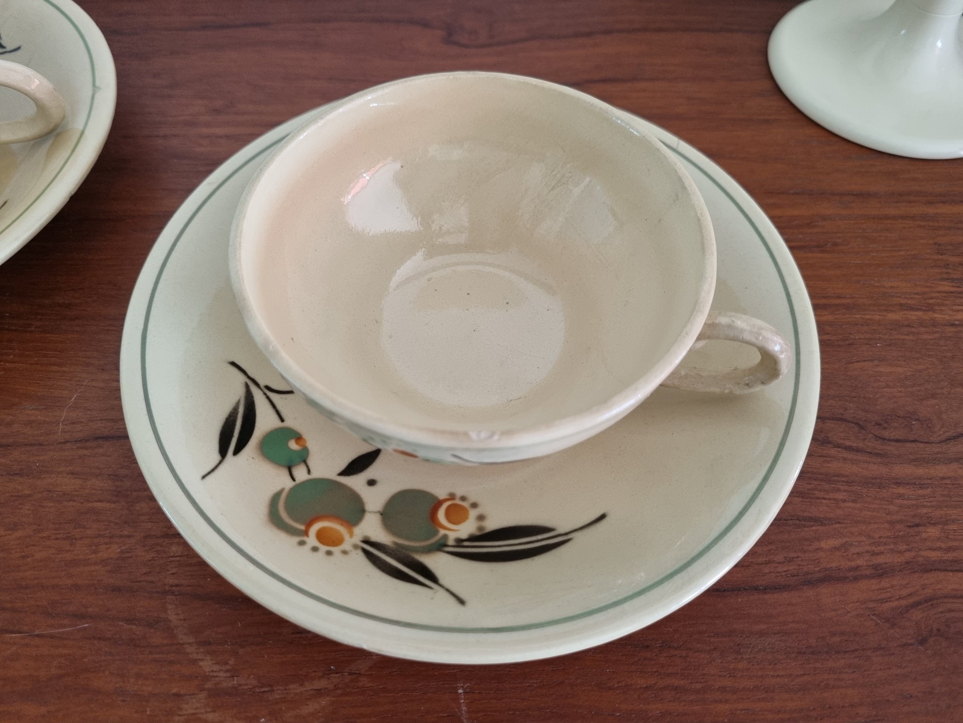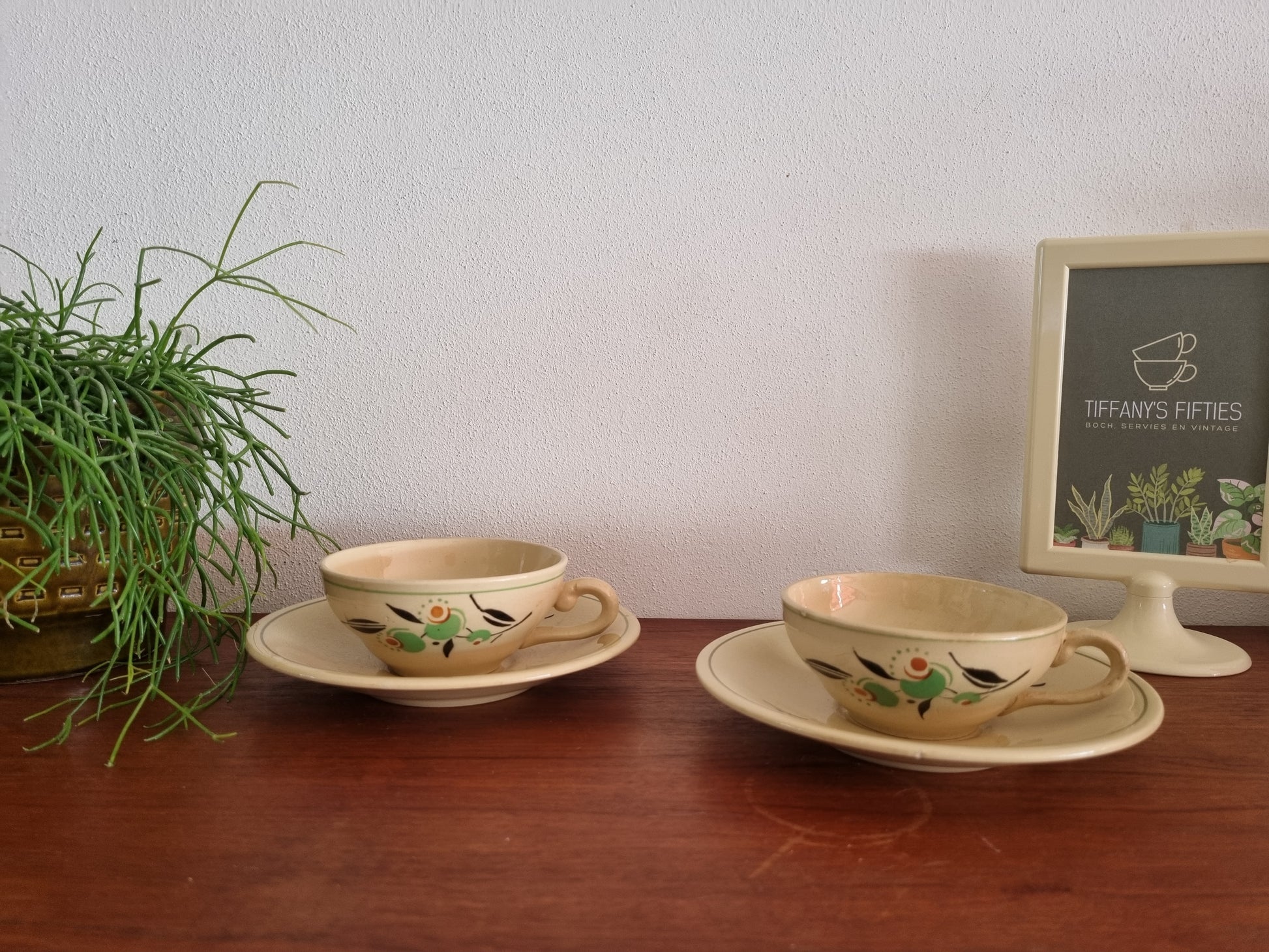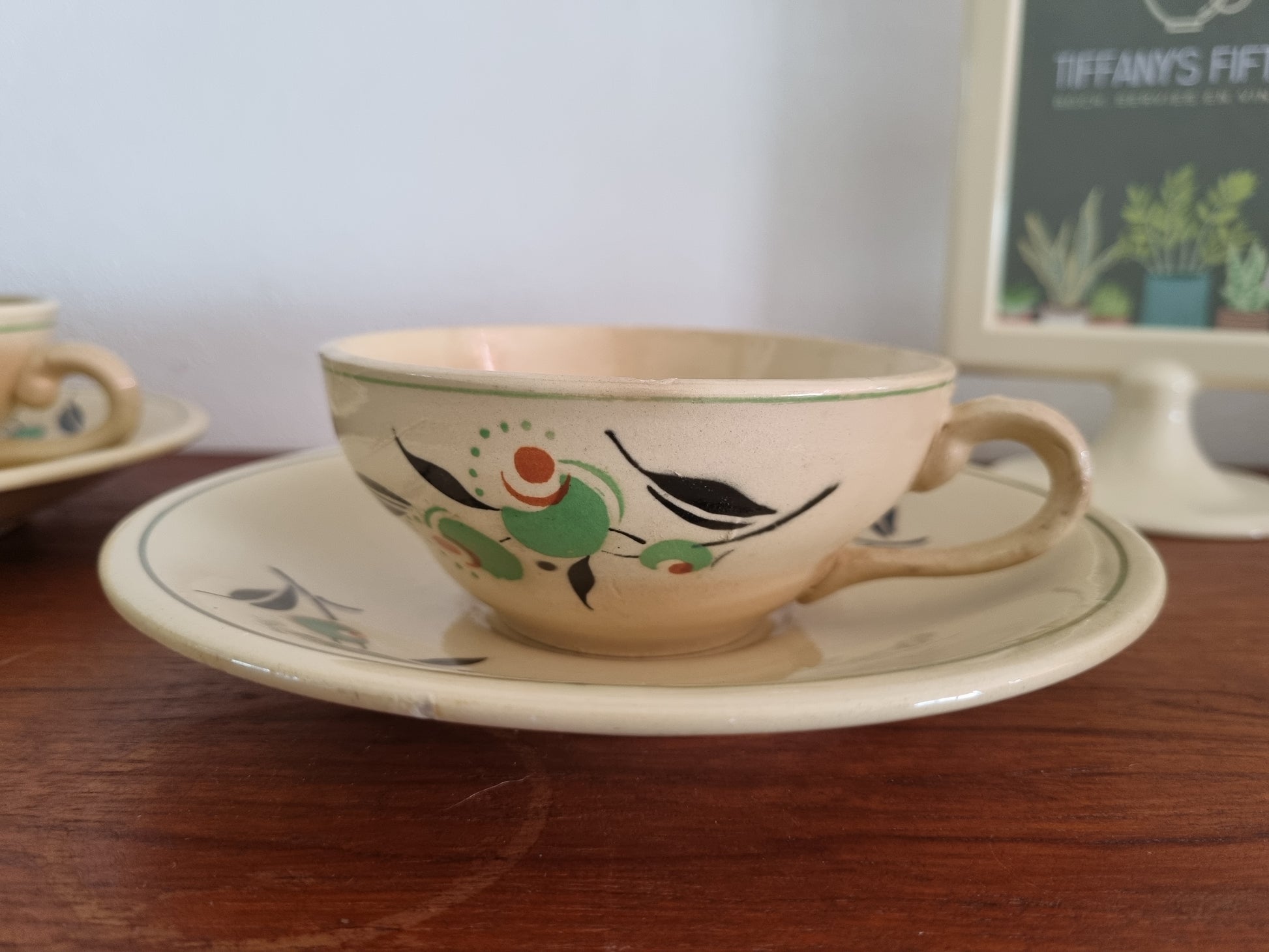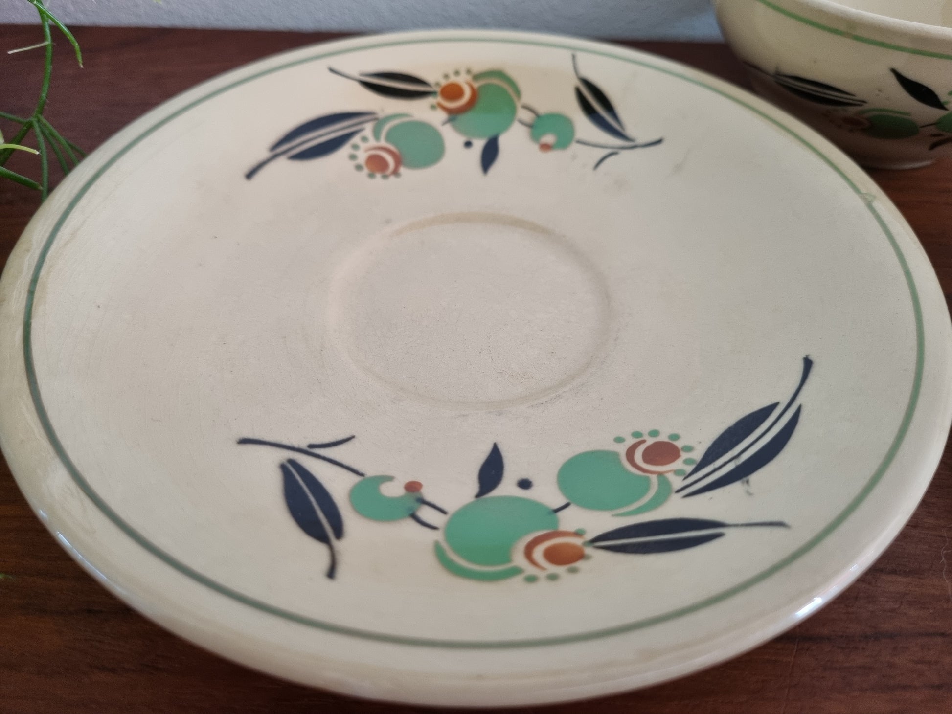 Kop en schotel van Boch Frères, vorm Anvers, decor Olivier. Gemaakt van crèmekleurig aardewerk met een handgeschilderd decor van olijfgroene en oranje motieven, afgewisseld met zwarte bladeren en een fijne groene rand.