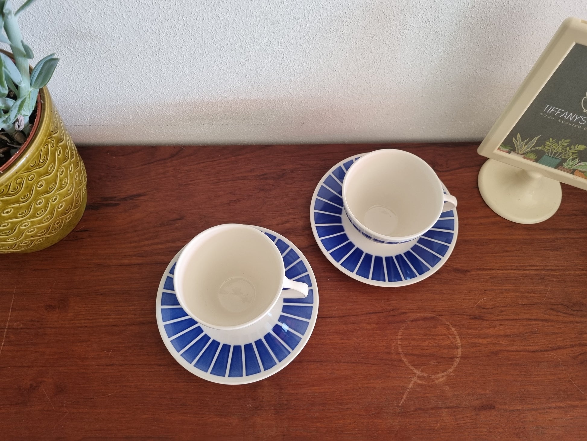 Kop en schotel van Boch La Louvière, model Prestige, decor Bandes Verticales. Uitgevoerd in wit aardewerk met een strak en grafisch patroon van kobaltblauwe verticale banen – een gedurfd en stijlvol ontwerp dat perfect de moderne jaren ’60 esthetiek weergeeft.