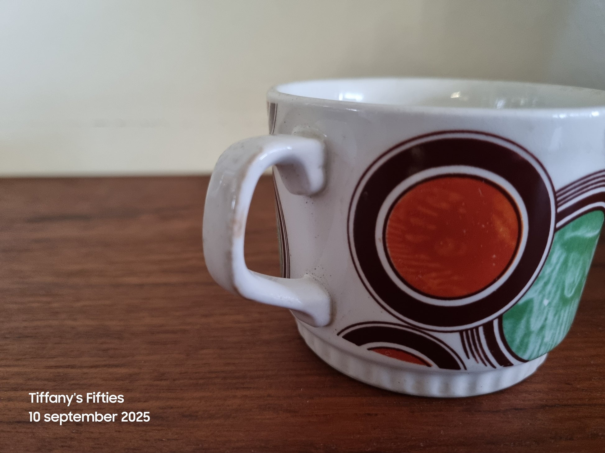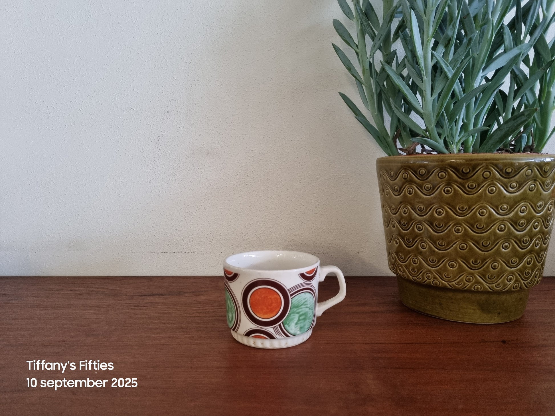 Kopje van Boch, model Delta, decor Olympia. Uitgevoerd in wit aardewerk met een grafisch patroon in bruin, oranje en groen, typerend voor de kleurrijke seventies-stijl.