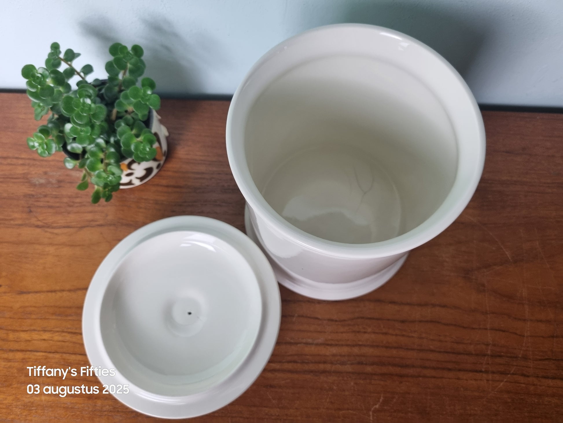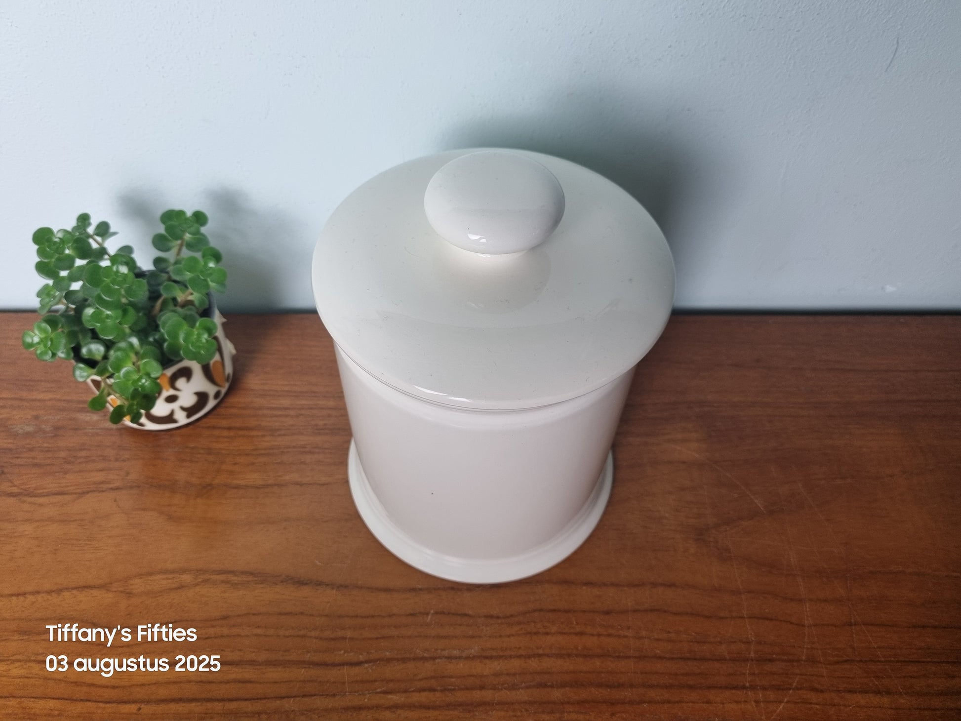 Voorraadpot van Royal Boch, uitgevoerd in wit geglazuurd aardewerk met deksel. Een klassiek en tijdloos ontwerp dat zowel in een landelijke als in een minimalistische keuken mooi tot zijn recht komt.