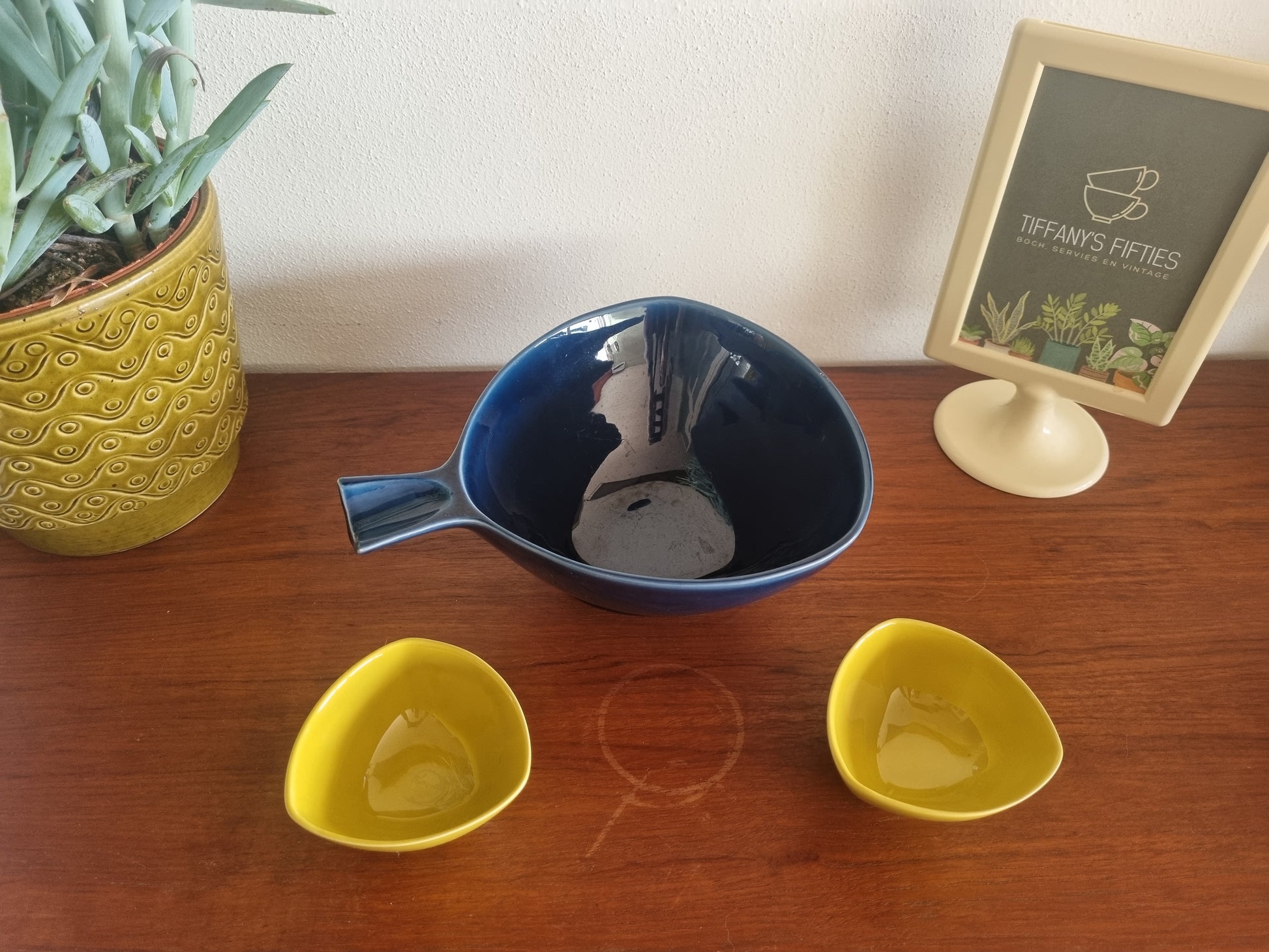 Kenmerkend mid-century design uit Nederland, met organische driekantige vormen en een speels kleurcontrast. Perfect voor snacks, sausjes of als blikvanger op een retro tafel.
