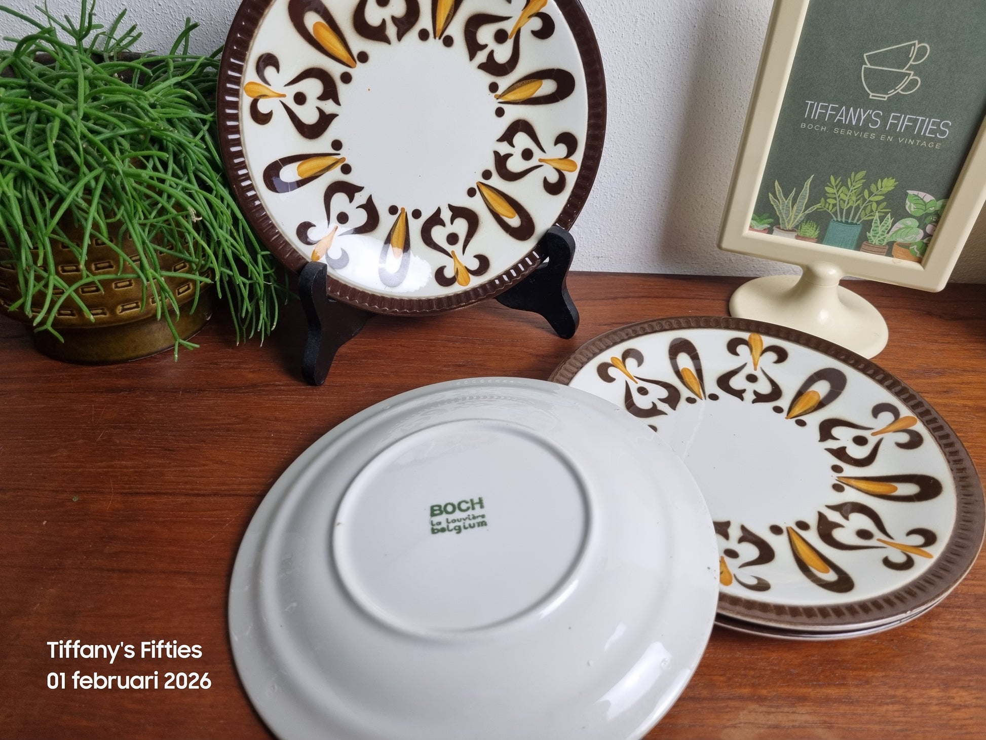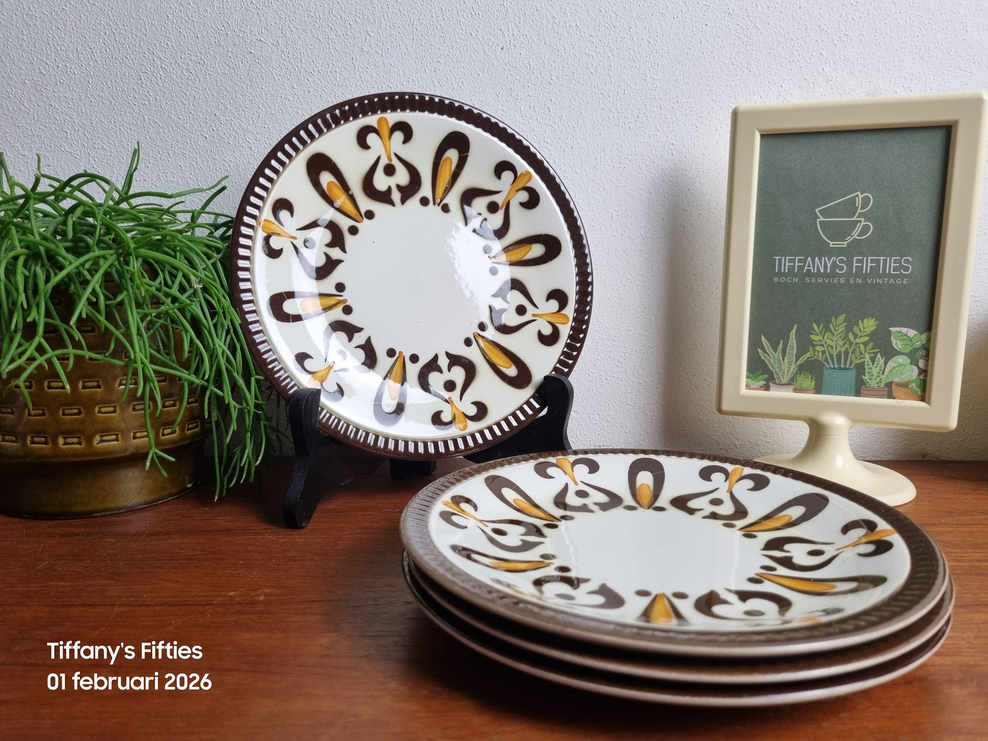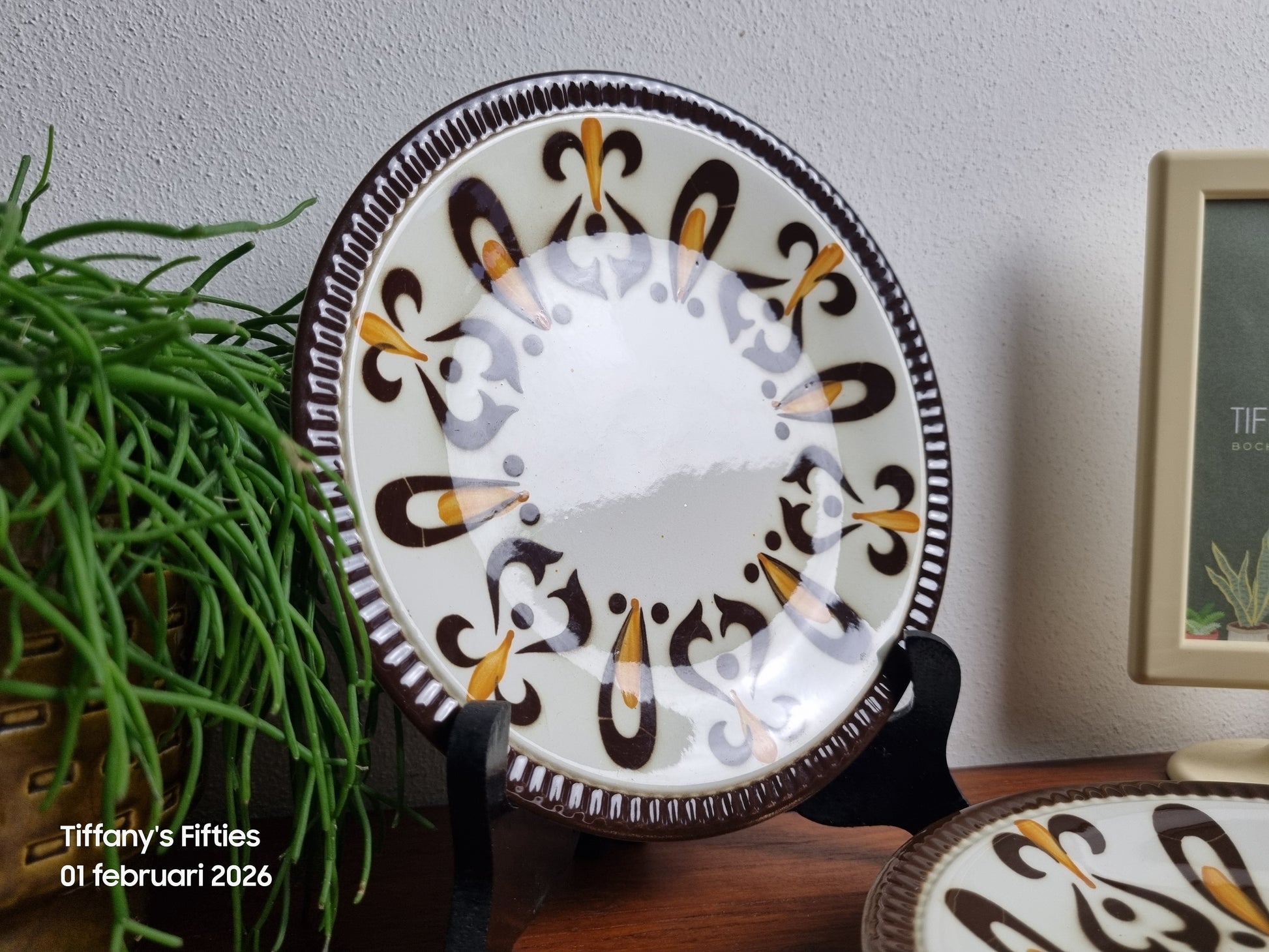 Dessert- of ontbijtbordjes van Boch La Louvière, servies Delta, decor Tirana. Gemaakt uit wit geglazuurd aardewerk met een arabesk randdecoratie in bruin en oranje, typerend voor het abstracte design van Boch uit de jaren '60-'70.