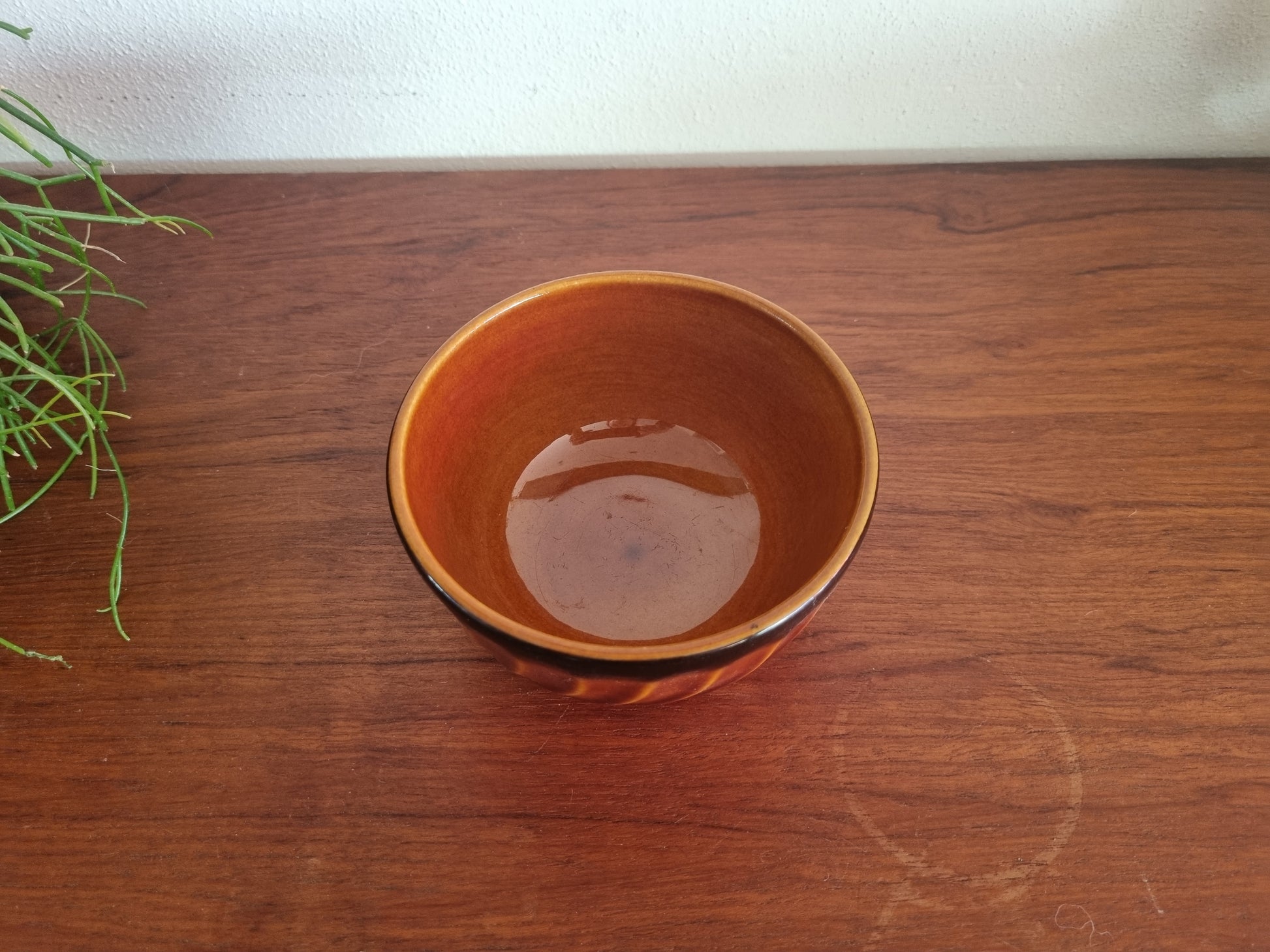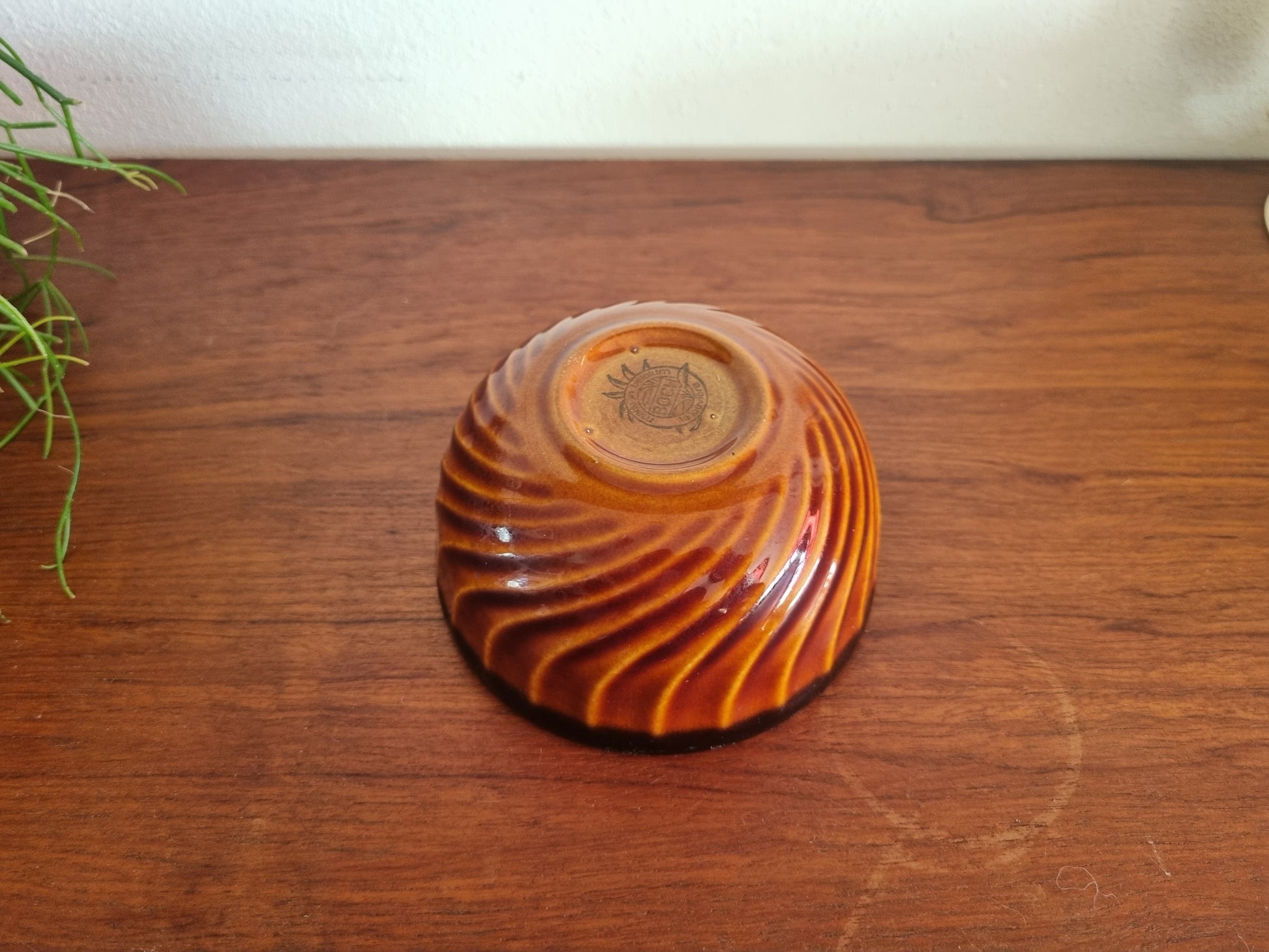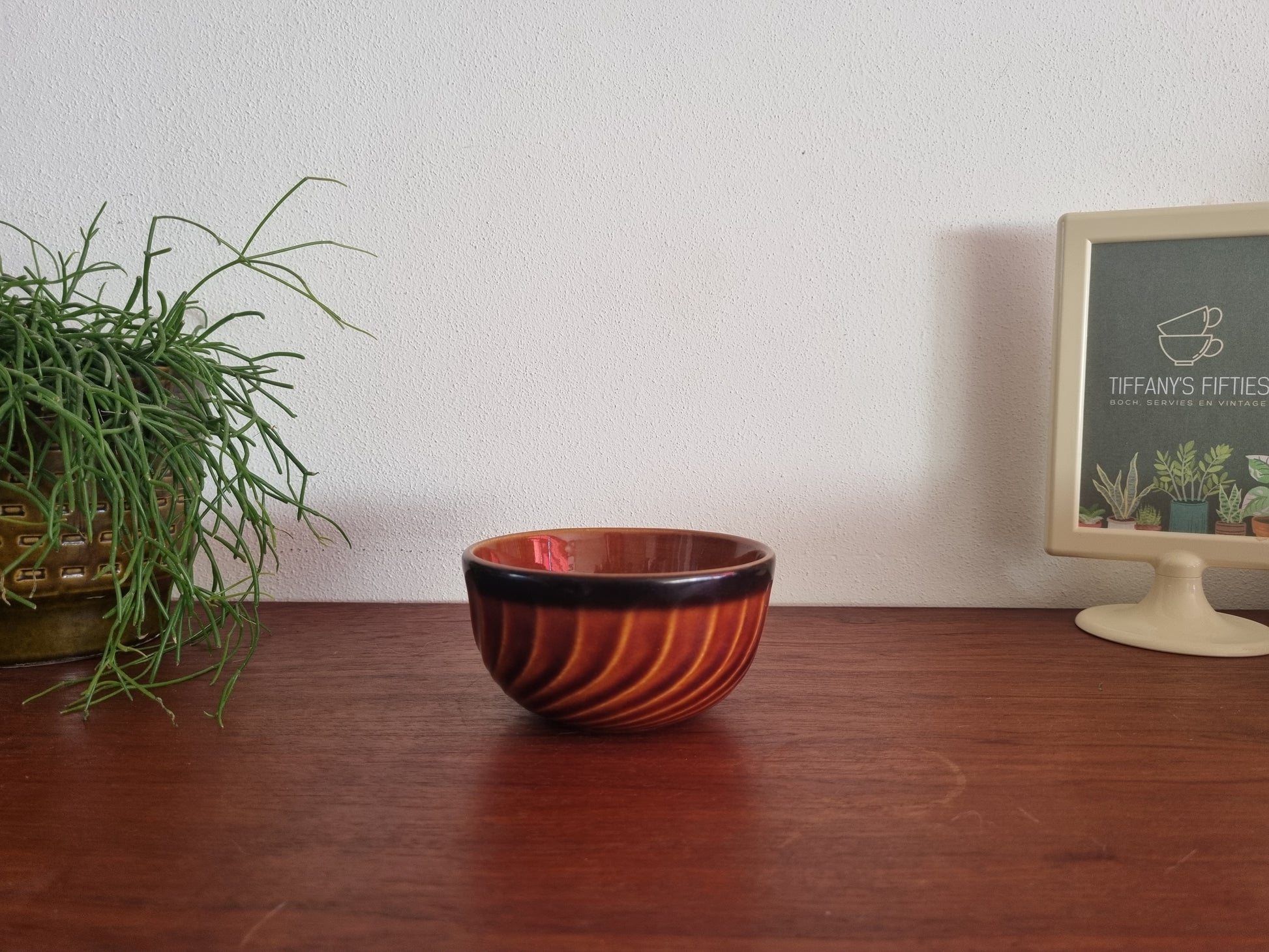 Kommetje van Boch La Louvière, model Torse, decor Traviata. Gemaakt uit geglazuurd aardewerk met kenmerkende gedraaide reliëfstructuur en warmbruine glazuur in levendige schakeringen van amber tot donker chocoladebruin.