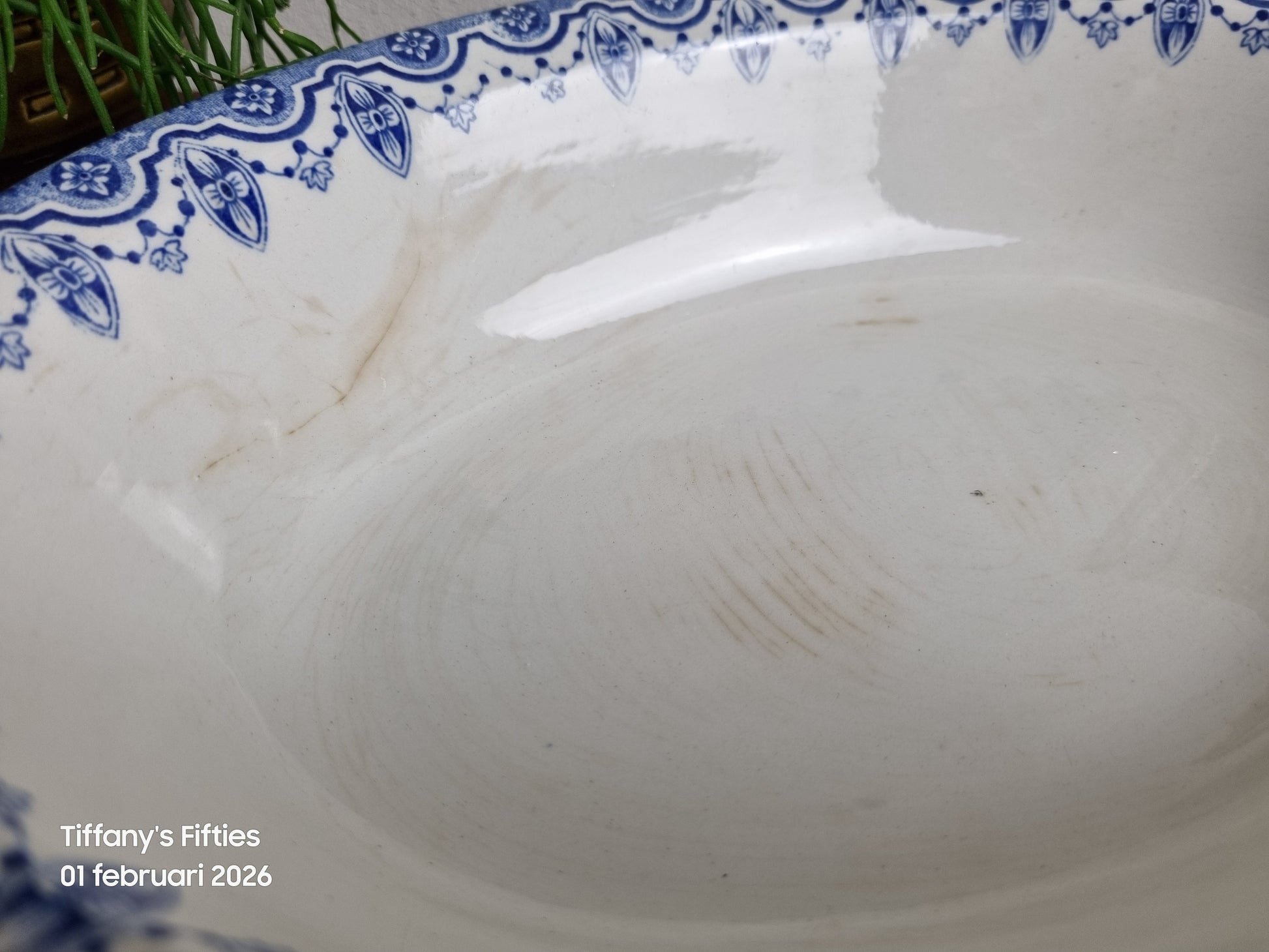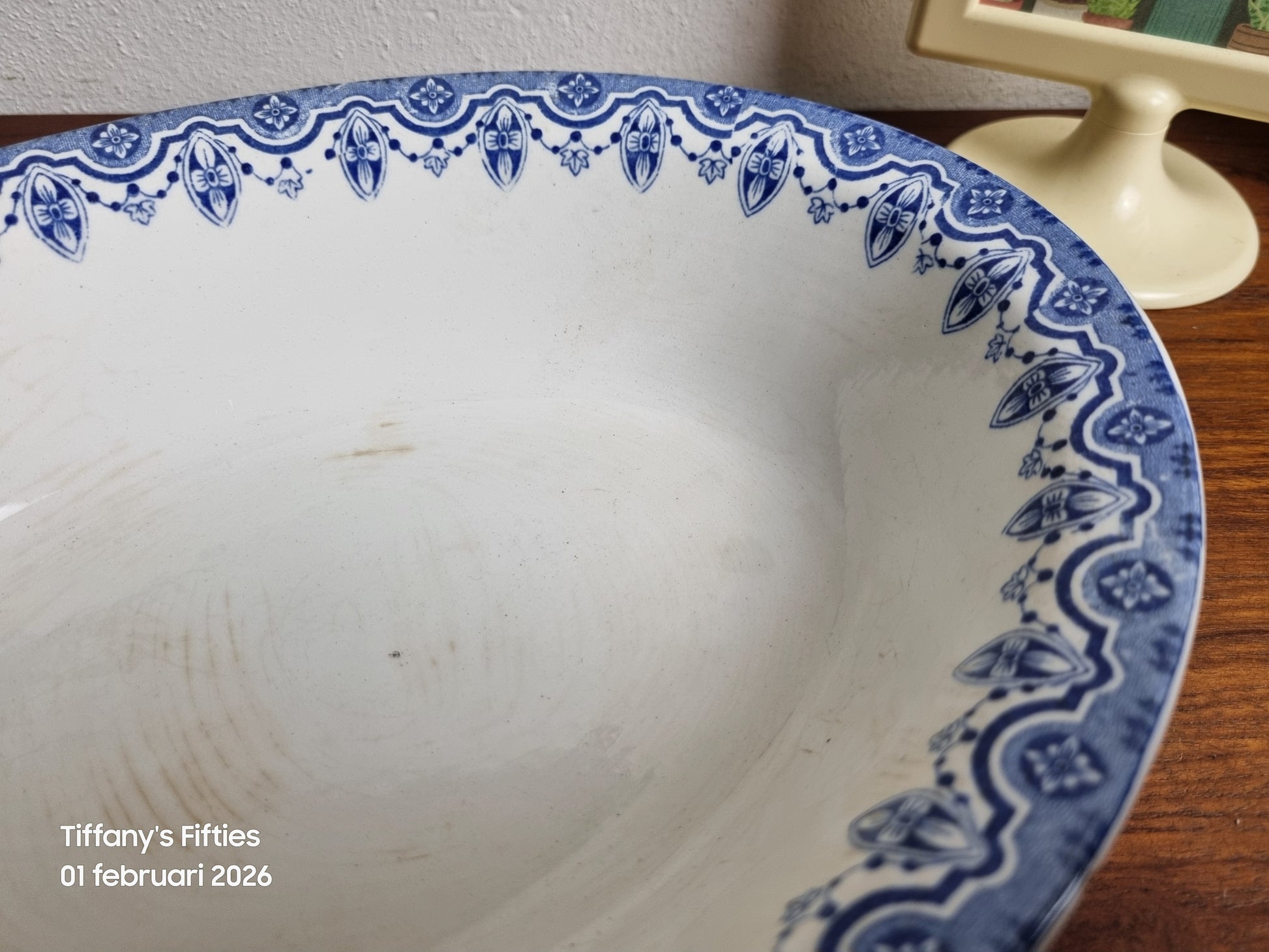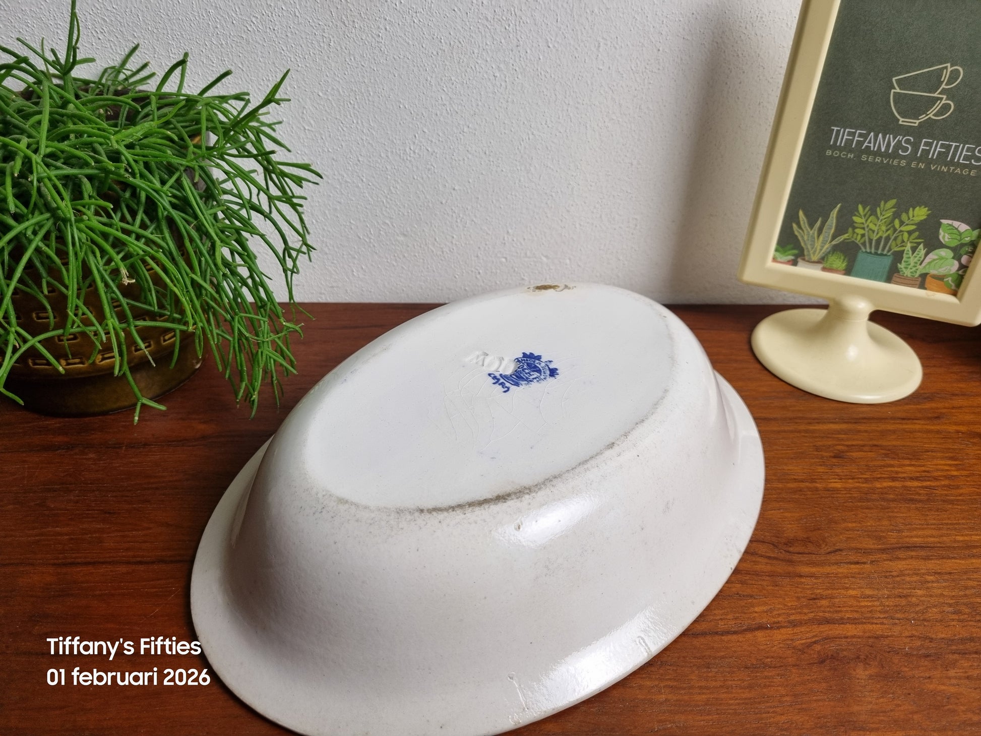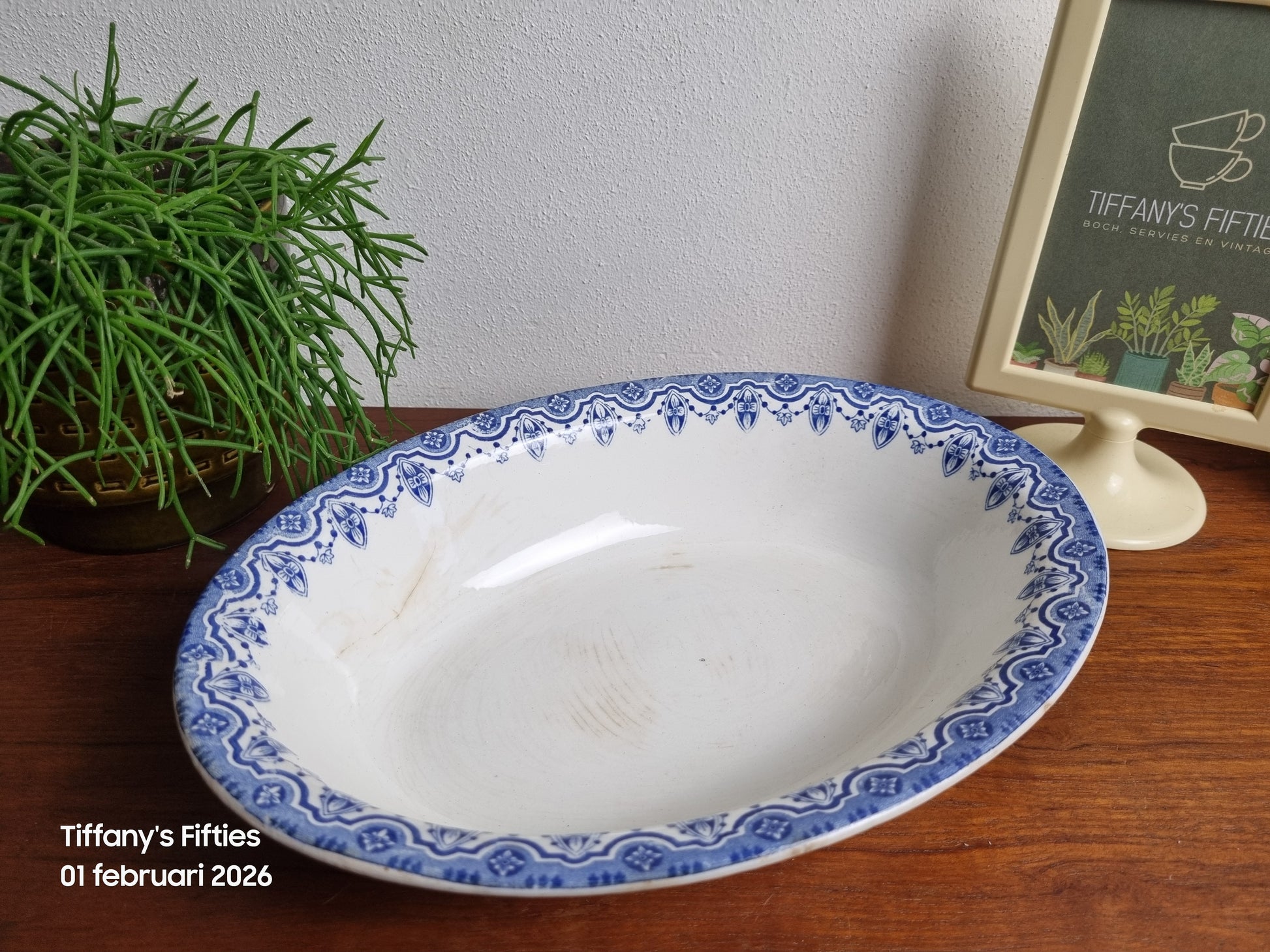 Ovale serveerschaal van Boch La Louvière, decor Clara. Gemaakt uit fijn wit geglazuurd aardewerk met een gedetailleerde randdecoratie van gestileerde bloemen en arabesken in kobaltblauw, typerend voor het klassieke Delfts-blauwe geïnspireerde design van Boch uit het begin van de 20e eeuw.