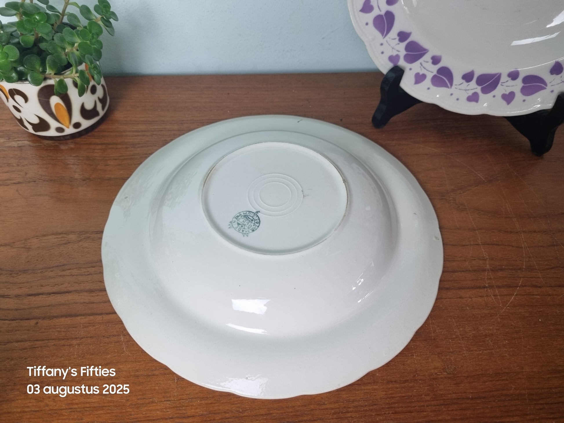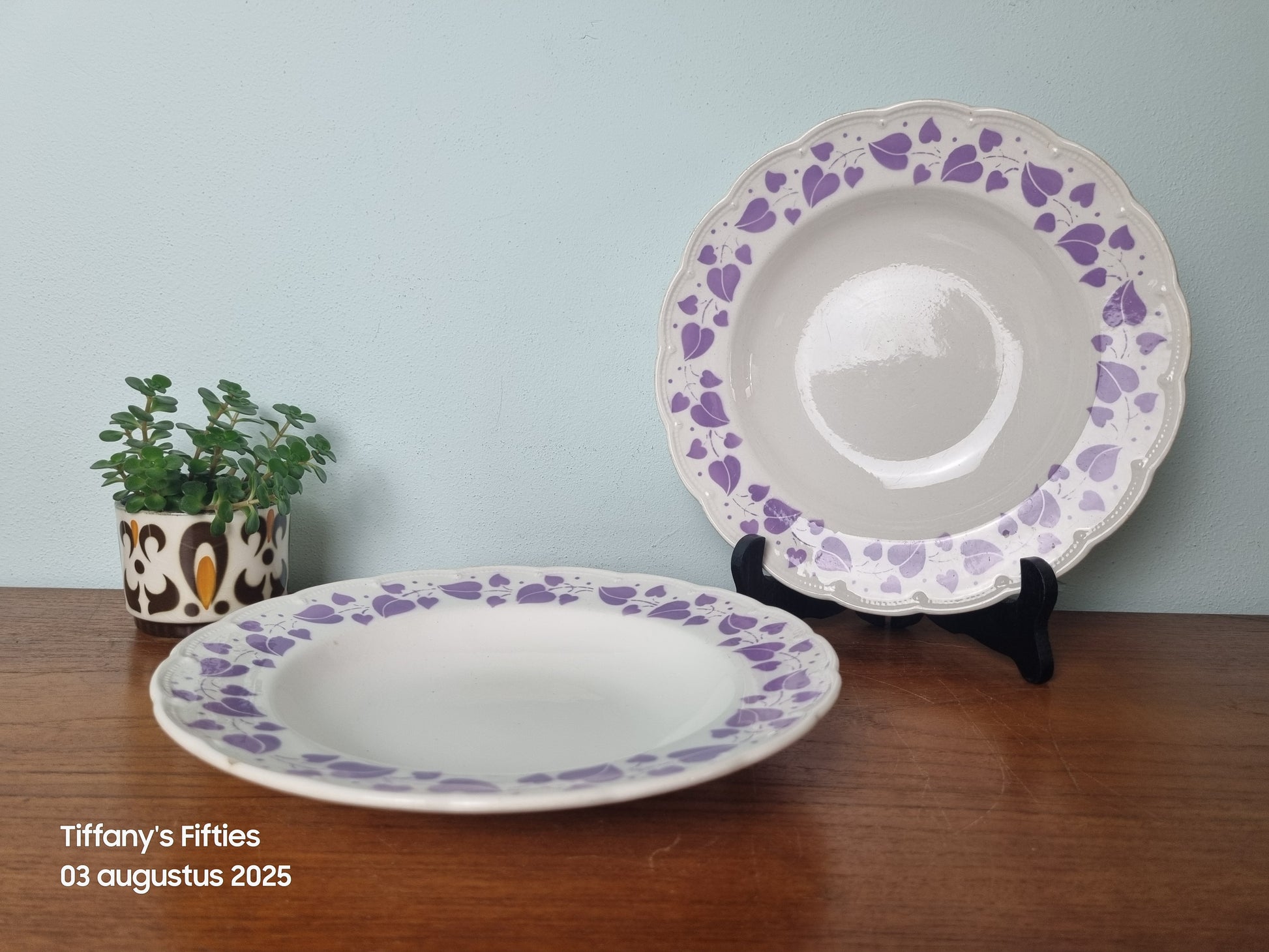 Charmante, zeer zeldzame diepe borden van Boch La Louvière uit de Festival-reeks, uitgevoerd in wit aardewerk met een speels decor van lila hartenblaadjes langs de golvende rand. De borden combineren een vrolijke retro-uitstraling met het kenmerkende Belgische design van de jaren 50.