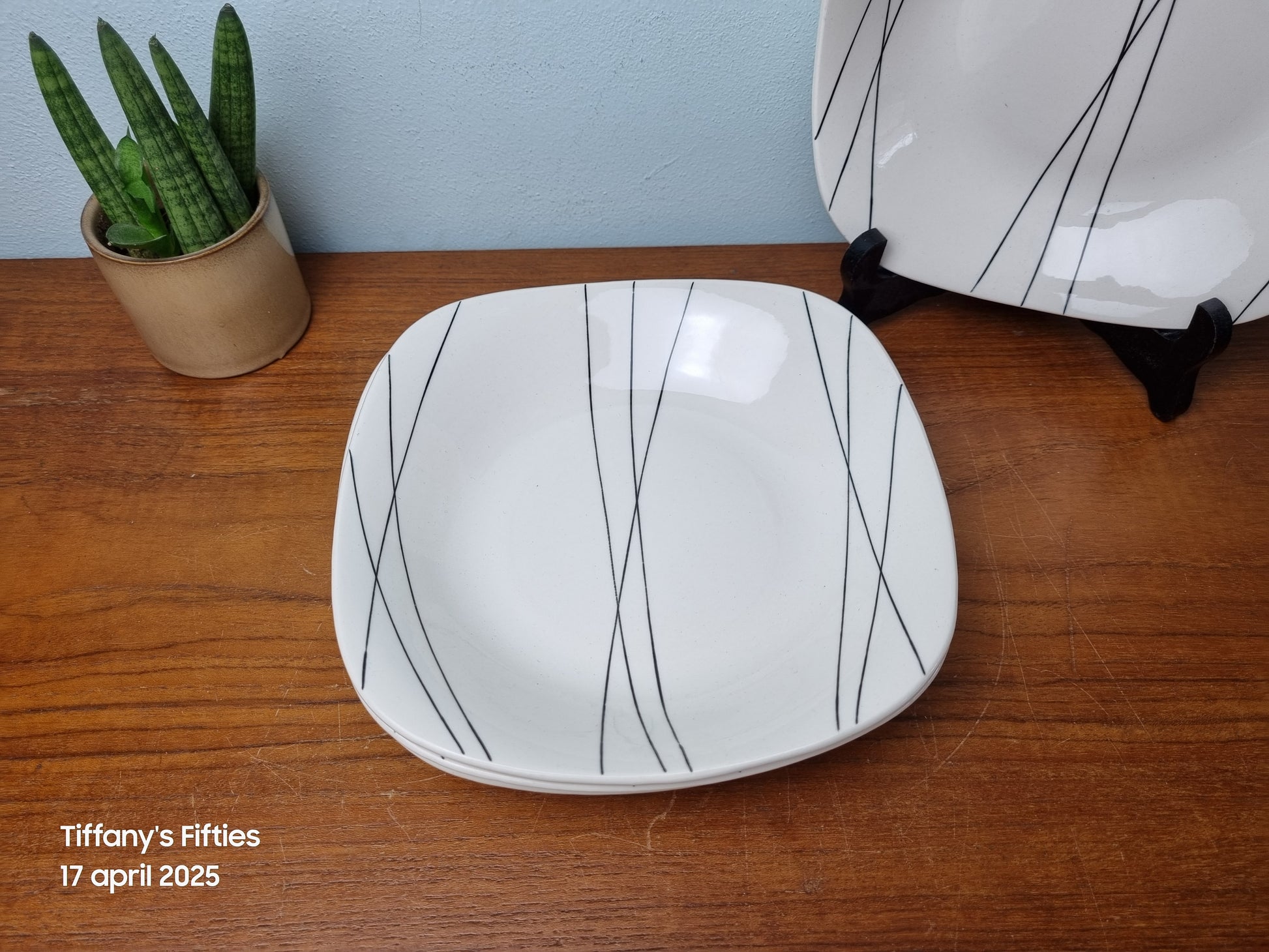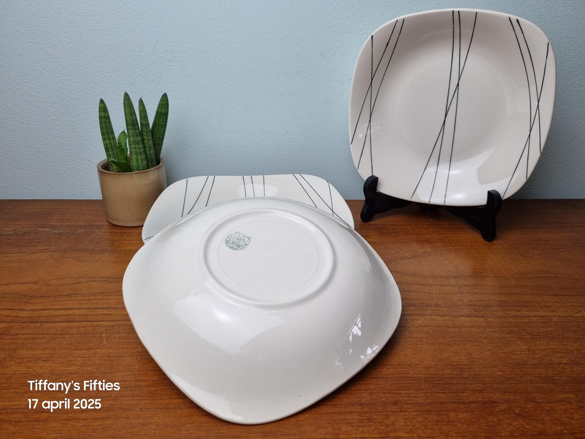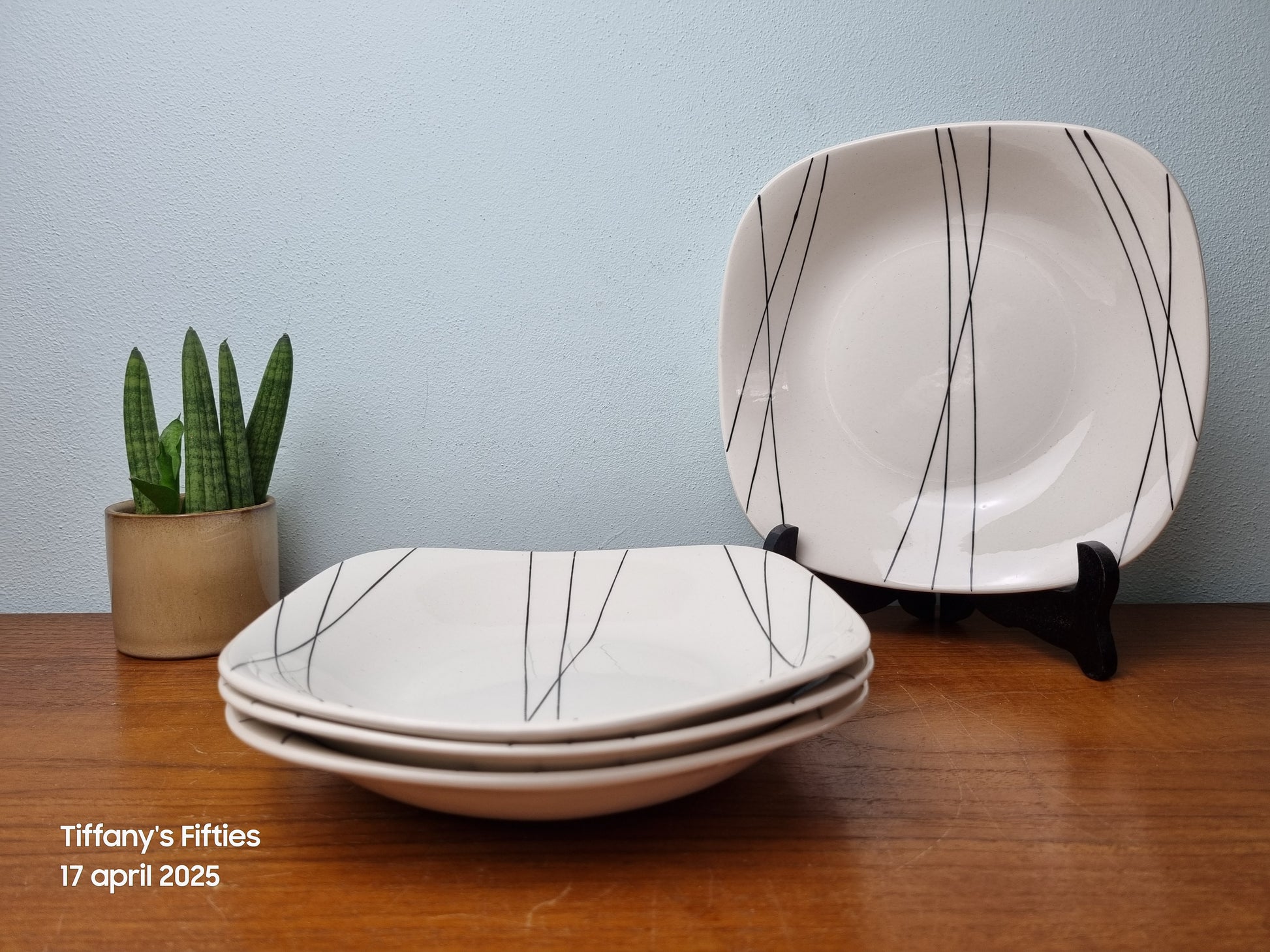 Charmante vintage diepe borden van Boch La Louviere uit de reeks Seduction in crème wit keramiek met een elegant zwart lijnendecor, Fines Lignes Noires, typerend voor het minimalistische design uit de jaren ’50. De borden hebben een zachte vierkante vorm die zorgt voor een stijlvolle, moderne uitstraling met een vleugje retro.