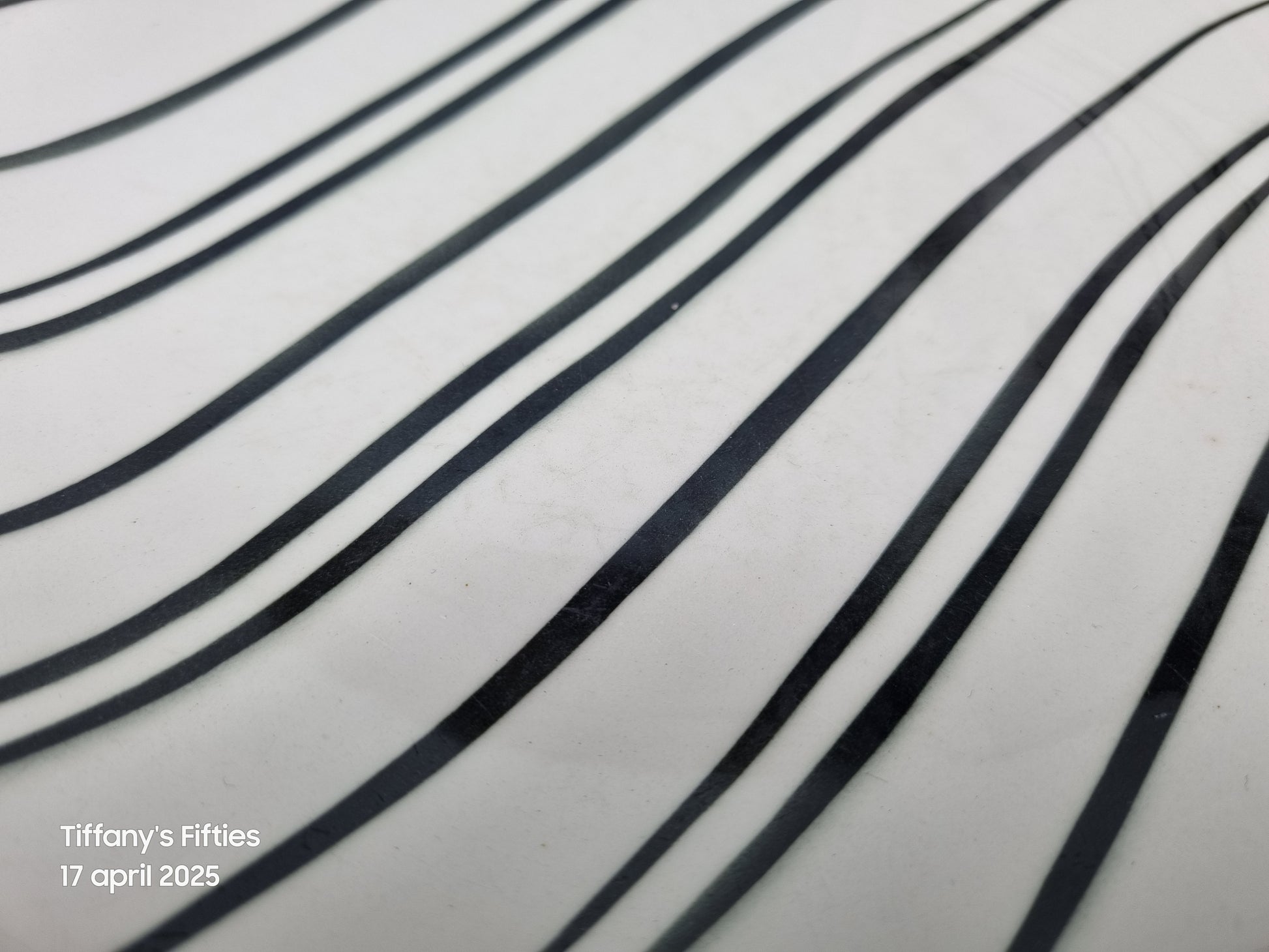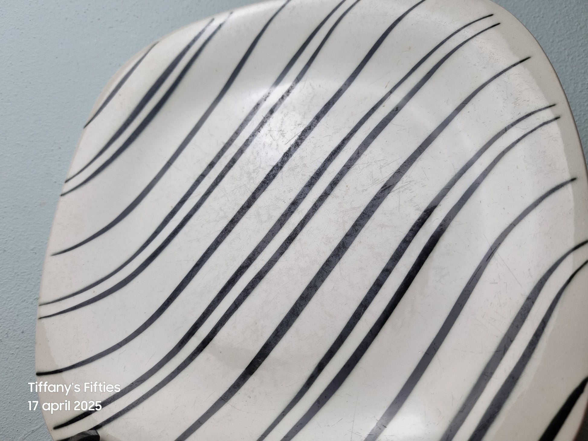 Vintage dinerborden van Boch La Louvière in het decor Okapi. De zwarte golvende lijnen op crème ondergrond geven een grafisch en retro karakter aan deze borden.