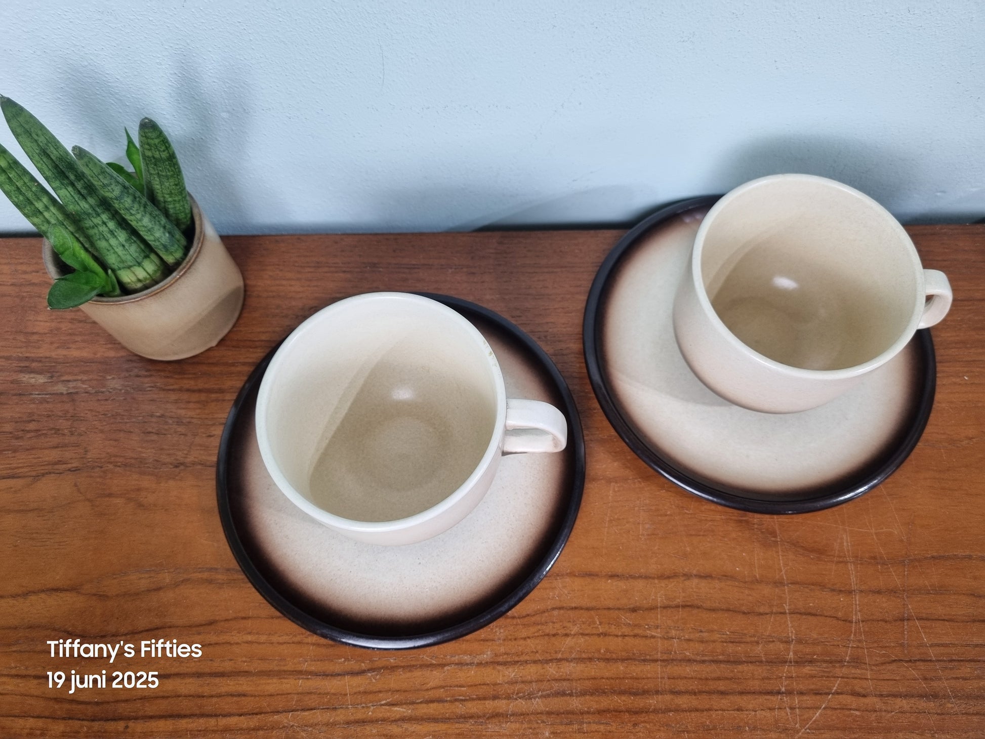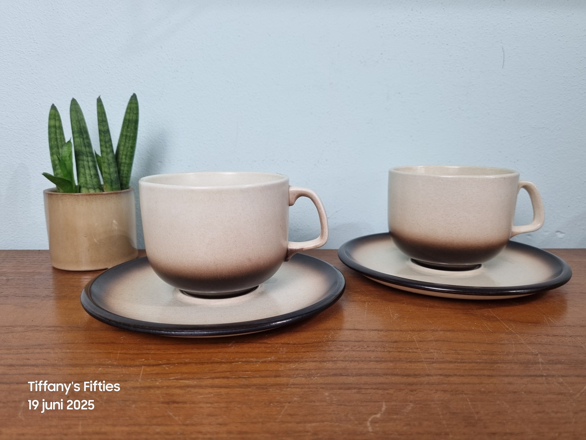Grote stijlvolle vintage kop-en-schotels van Boch La Louvière in het decor “Sierra”, uitgevoerd in een warm kleurverloop van crème naar diepbruin. De karakteristieke matte afwerking en het eenvoudige, ronde ontwerp geven deze set een rustige, natuurlijke uitstraling die typerend is voor Belgisch servies uit de jaren ’70. Een mooie aanvulling op het bestaande Sierra-servies of een charmant duo voor wie houdt van tijdloos design.