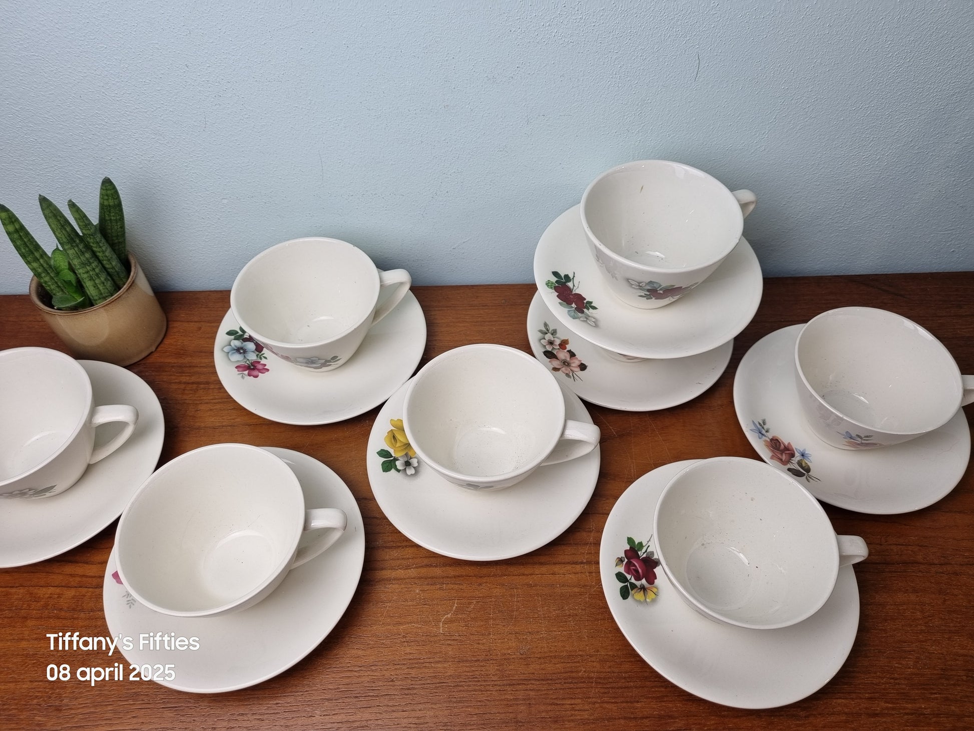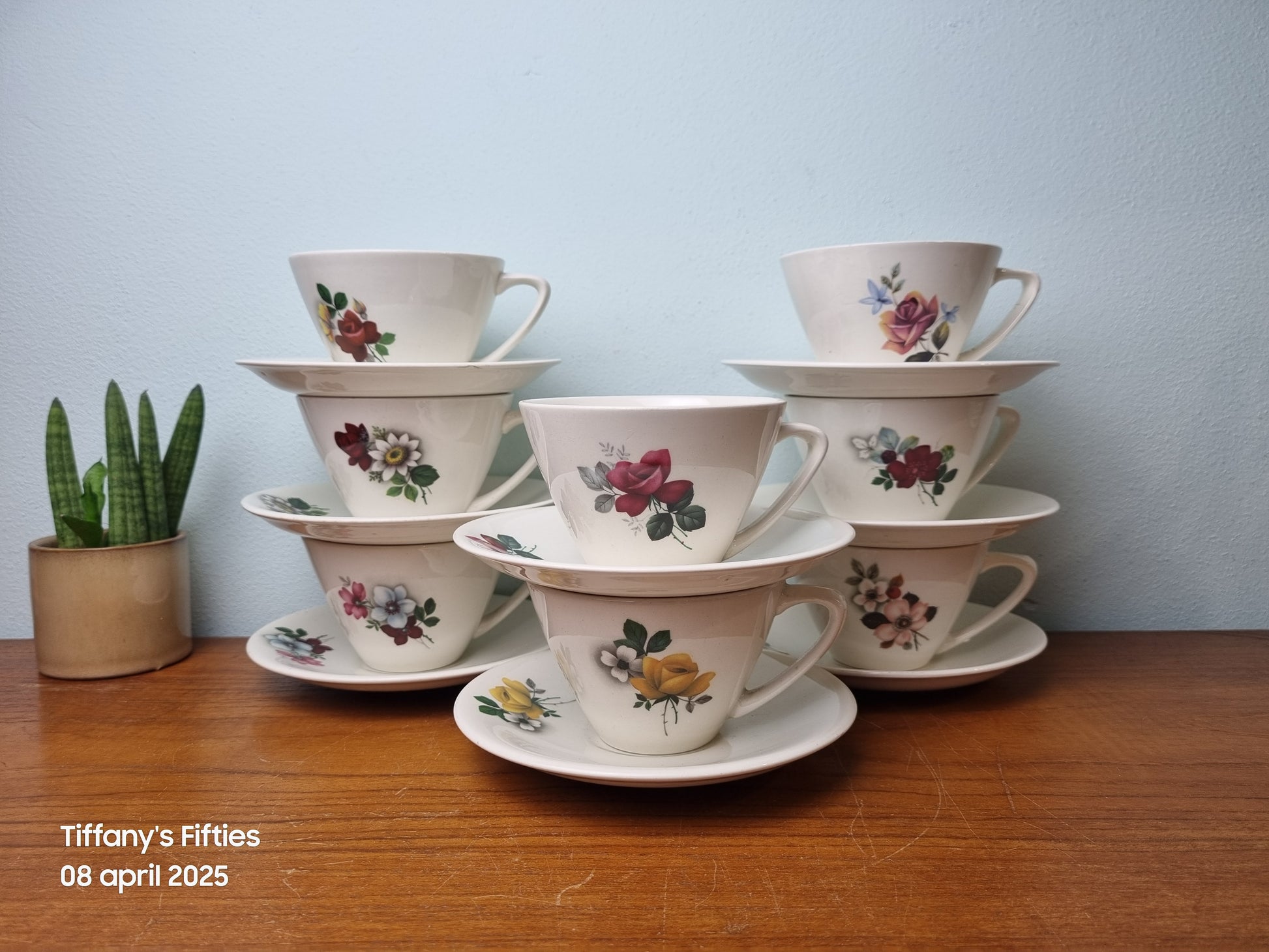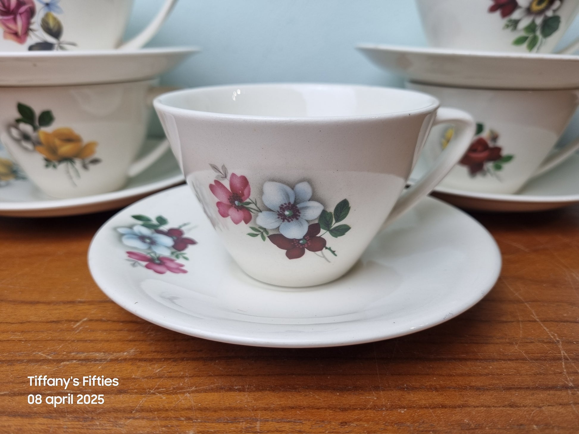 Koffiekopjes met schotel van Boch, elk met een verschillend bloemendecor in kleur. De kopjes hebben een elegante conische vorm en tonen de verfijnde Boch-stijl uit de jaren ’50–’60, waarin bloemenmotieven een centrale rol speelden.