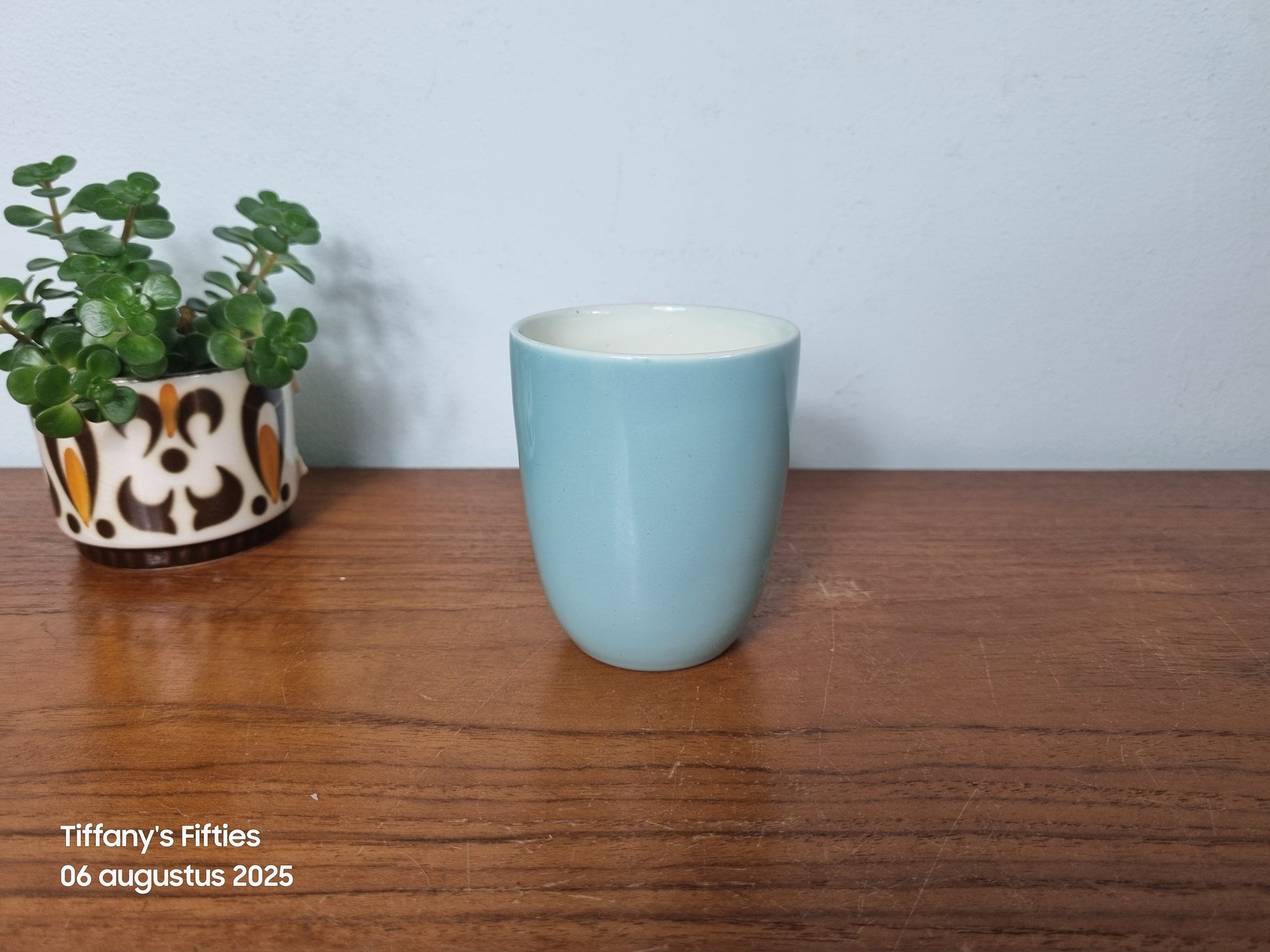 Beker van Goedewaagen in lichtblauw geglazuurd aardewerk met een crèmekleurige binnenzijde. Strak en tijdloos vormgegeven, passend bij de Hollandse keramiektraditie van de jaren ’50 en ’60.