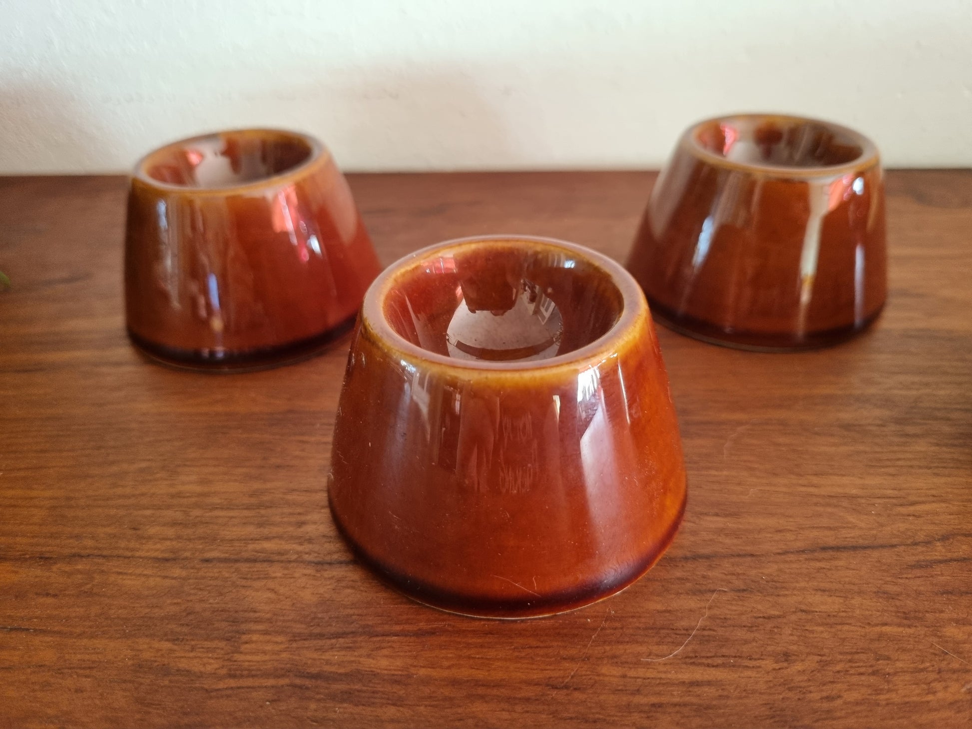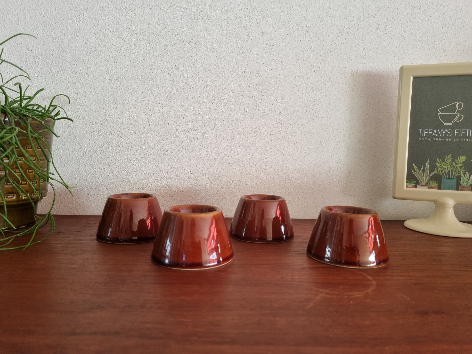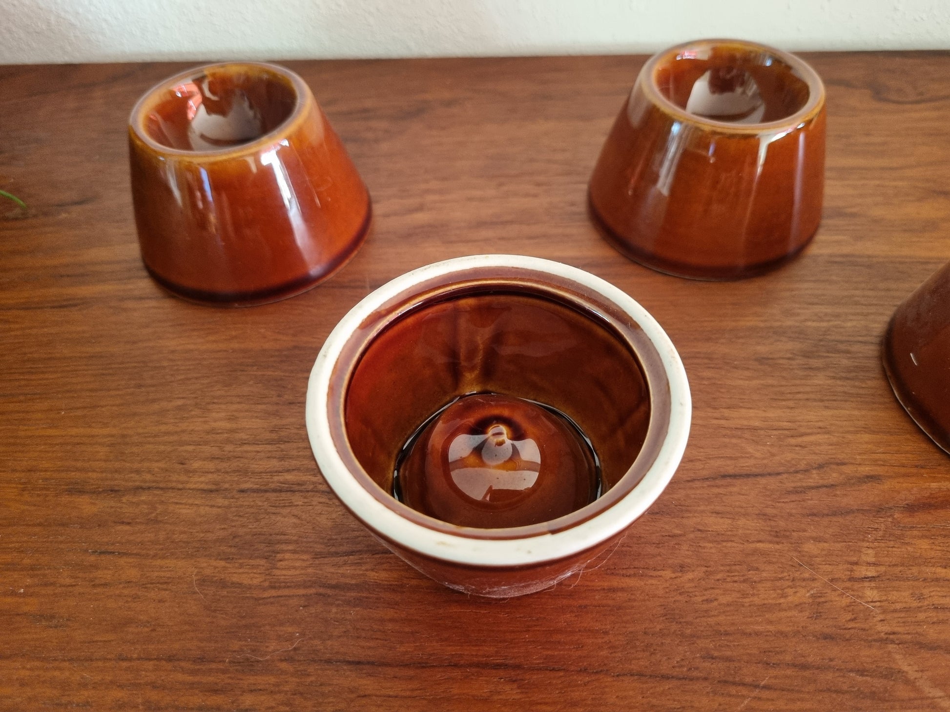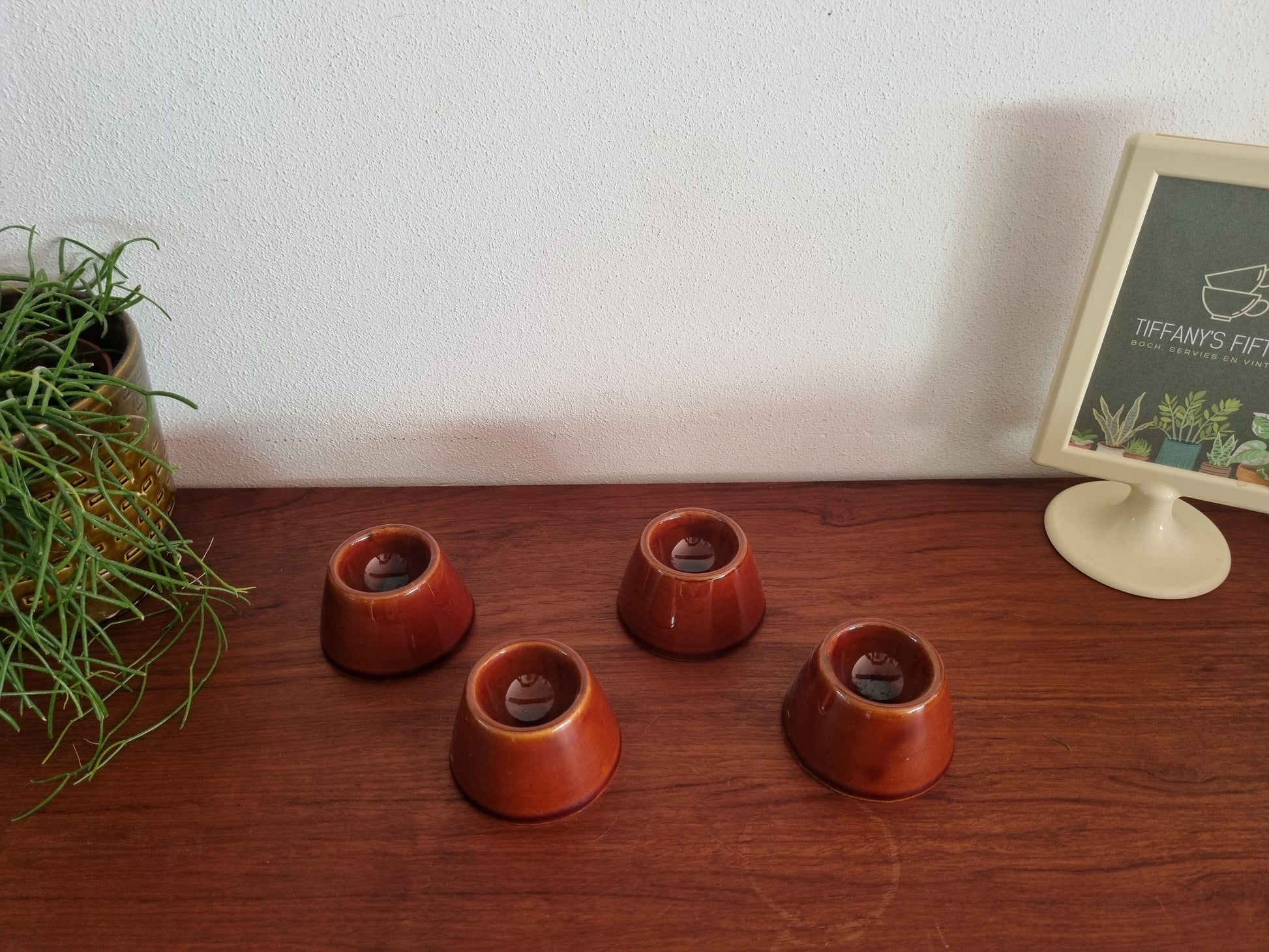 Engelse eierdopjes in geglazuurd aardewerk met warme bruintinten in een mooi doorlopende ombré. De glanzende afwerking en eenvoudige conische vorm geven deze dopjes een authentieke retro-uitstraling.