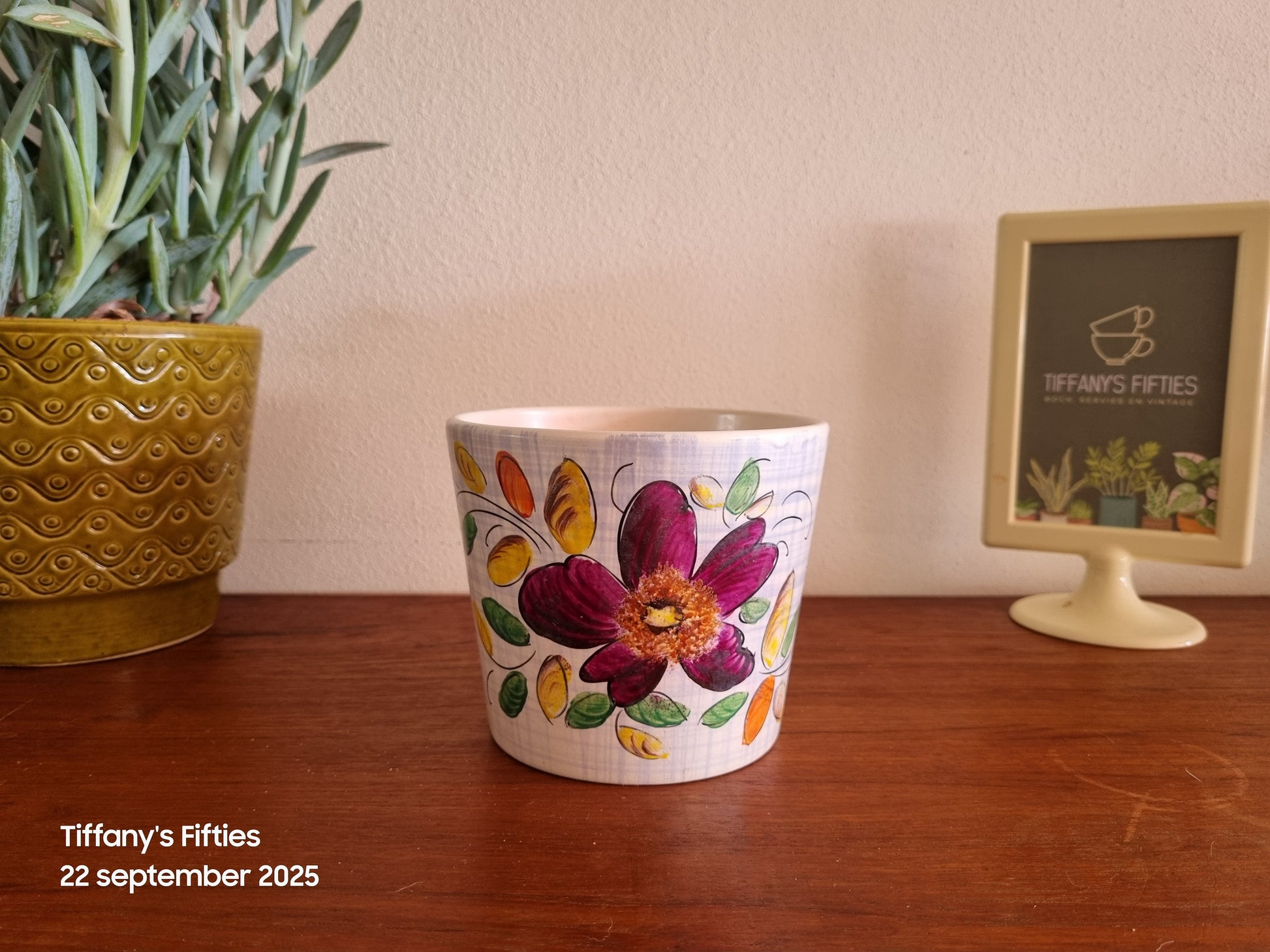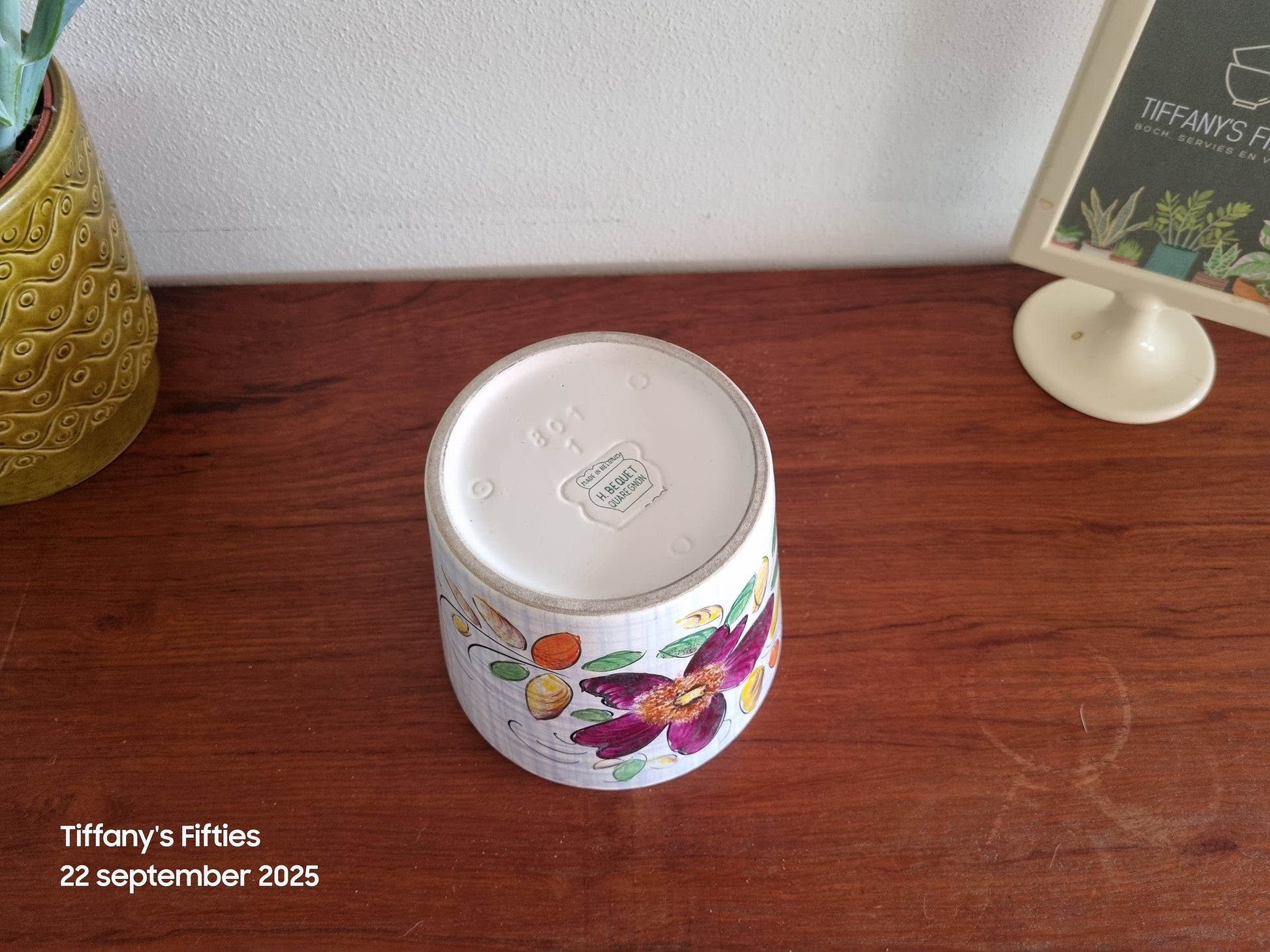 Bloempot van H. Buequet, handbeschilderd aardewerk met kleurrijk bloemendecor in paars, oranje en groen op een witte ondergrond met fijne rasterstructuur.
