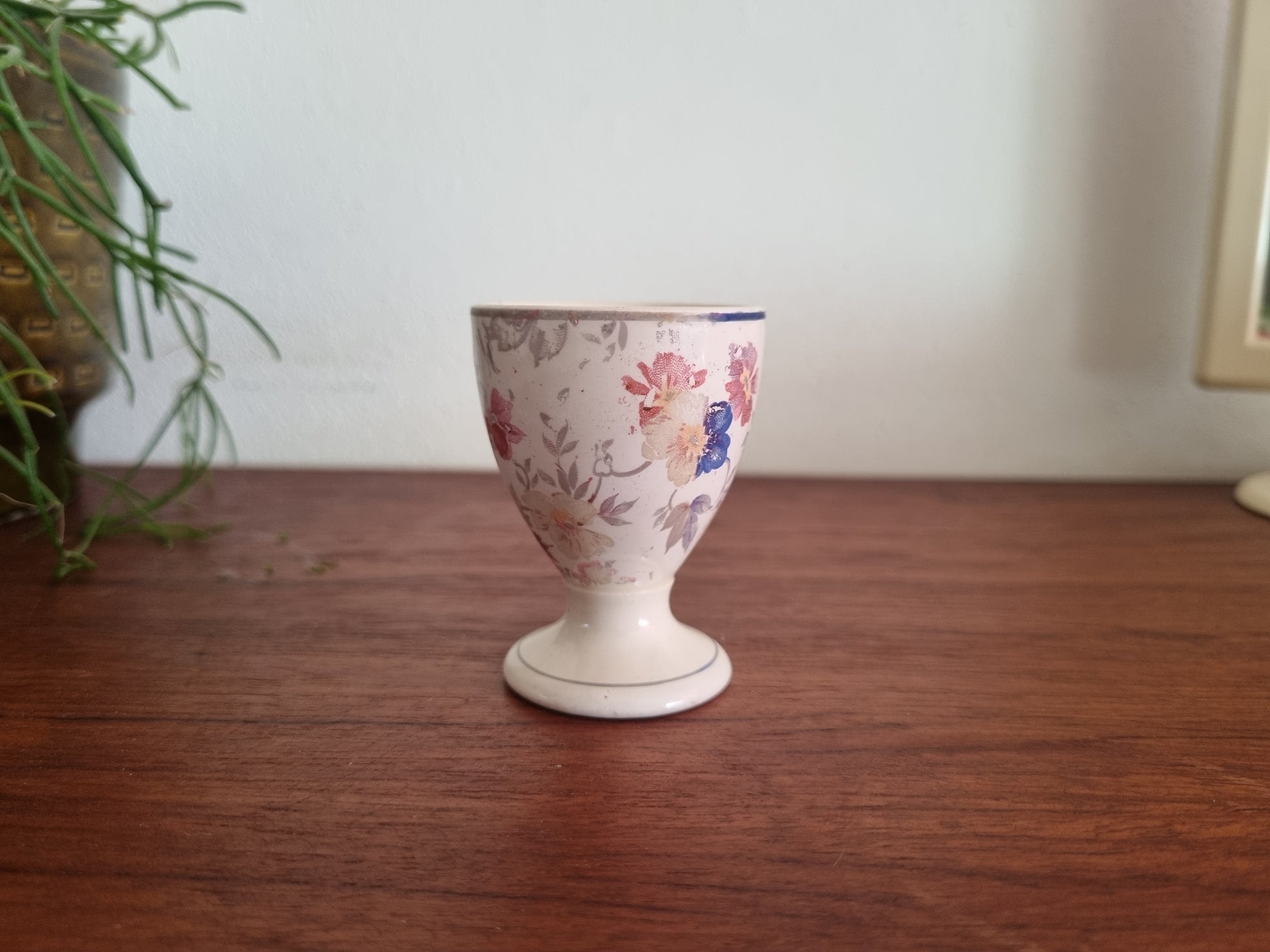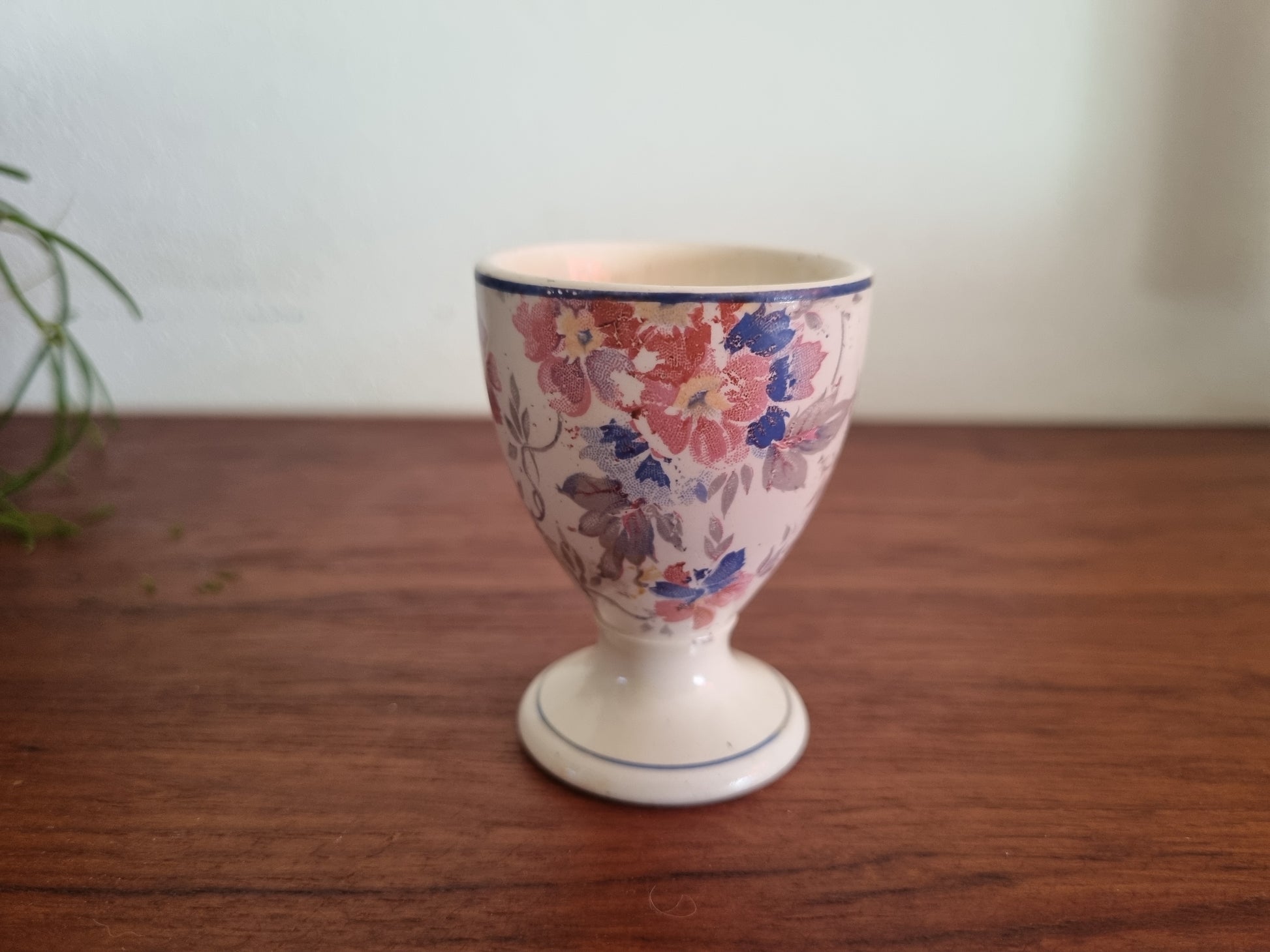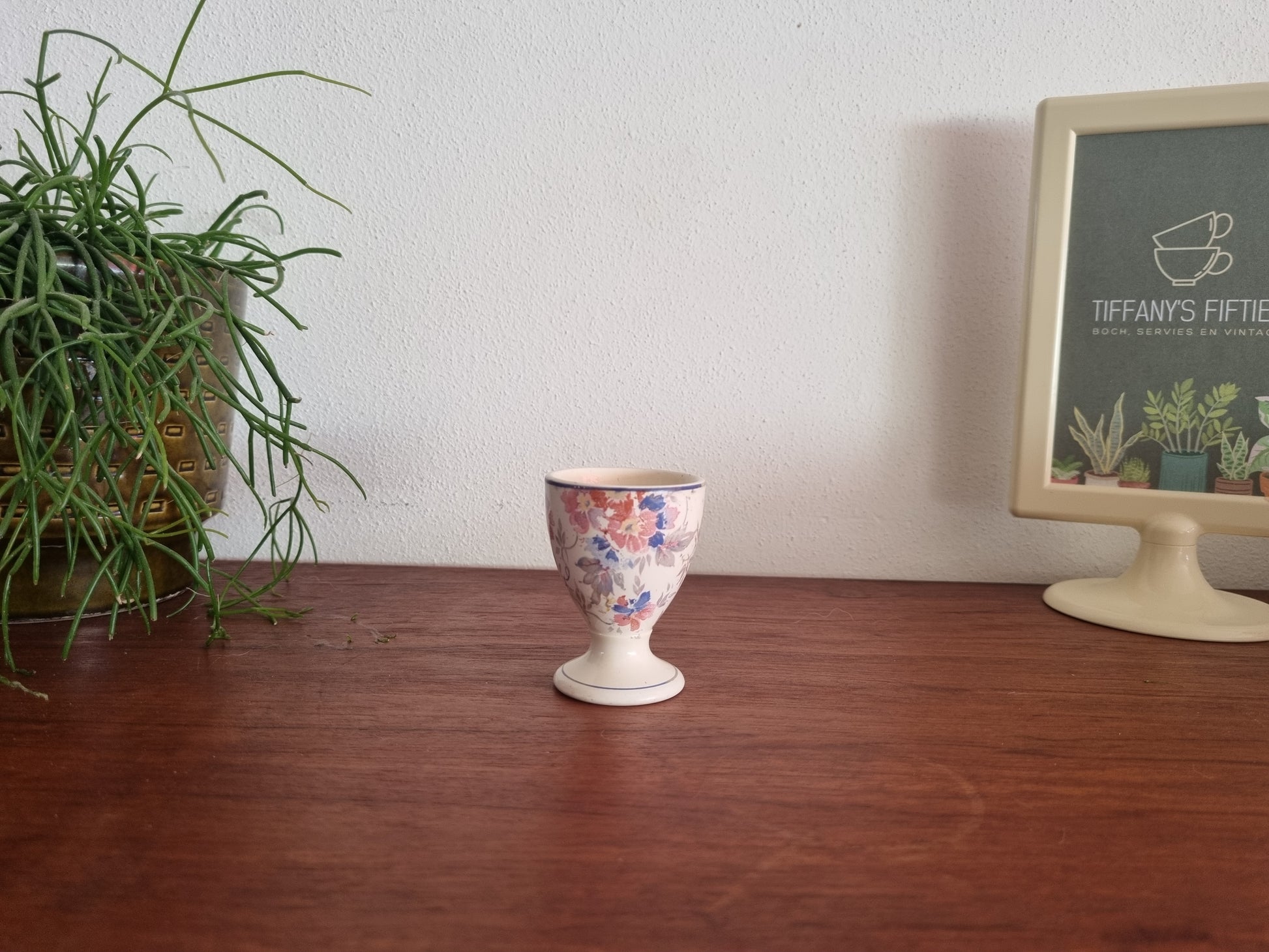 Eierdopje van Société Céramique Maastricht, decor Mille Fleurs. Uitgevoerd in crèmekleurig aardewerk met een fijn, kleurrijk bloemenpatroon in tinten roze, blauw en lila, afgewerkt met een smalle donkerblauwe rand bovenaan en aan de voet.