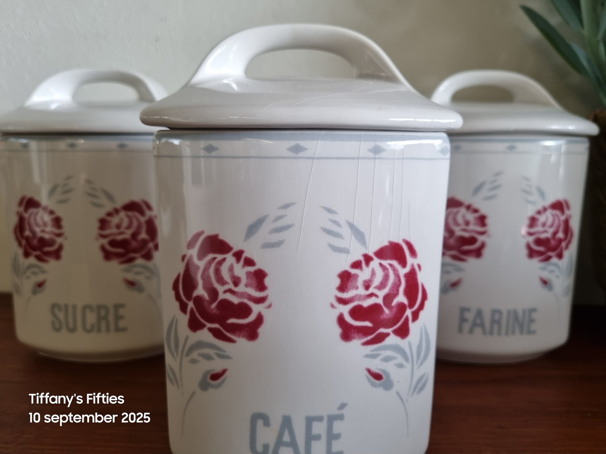 Voorraadpotten van Comptoir de Famille in wit aardewerk met rood rozenmotief en grijze accenten. De potten hebben een nostalgische uitstraling en zijn voorzien van Franse opschriften: Farine, Café en Sucre.