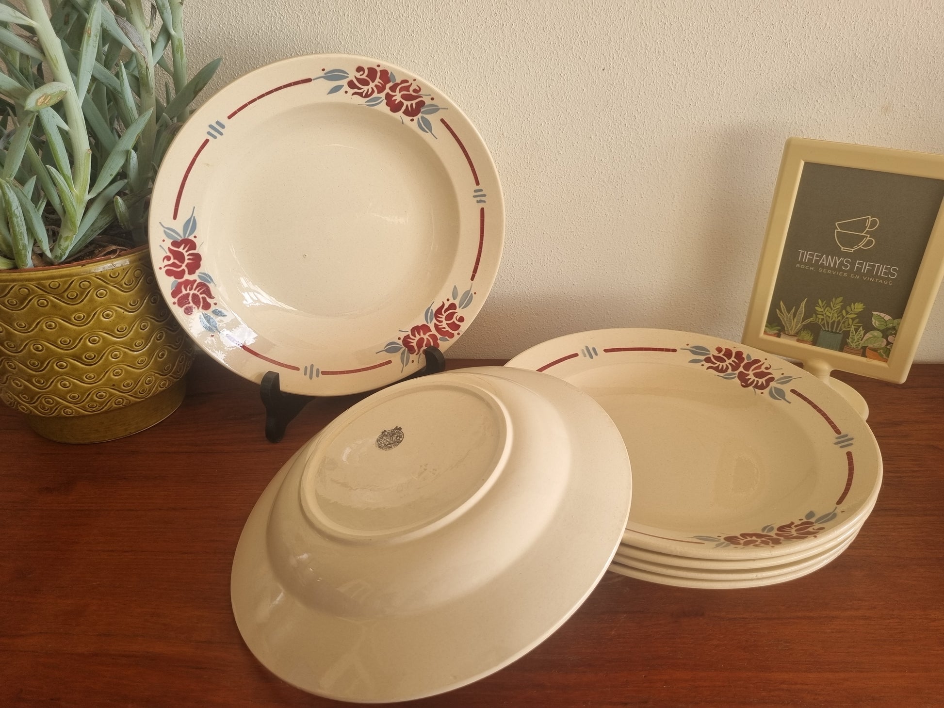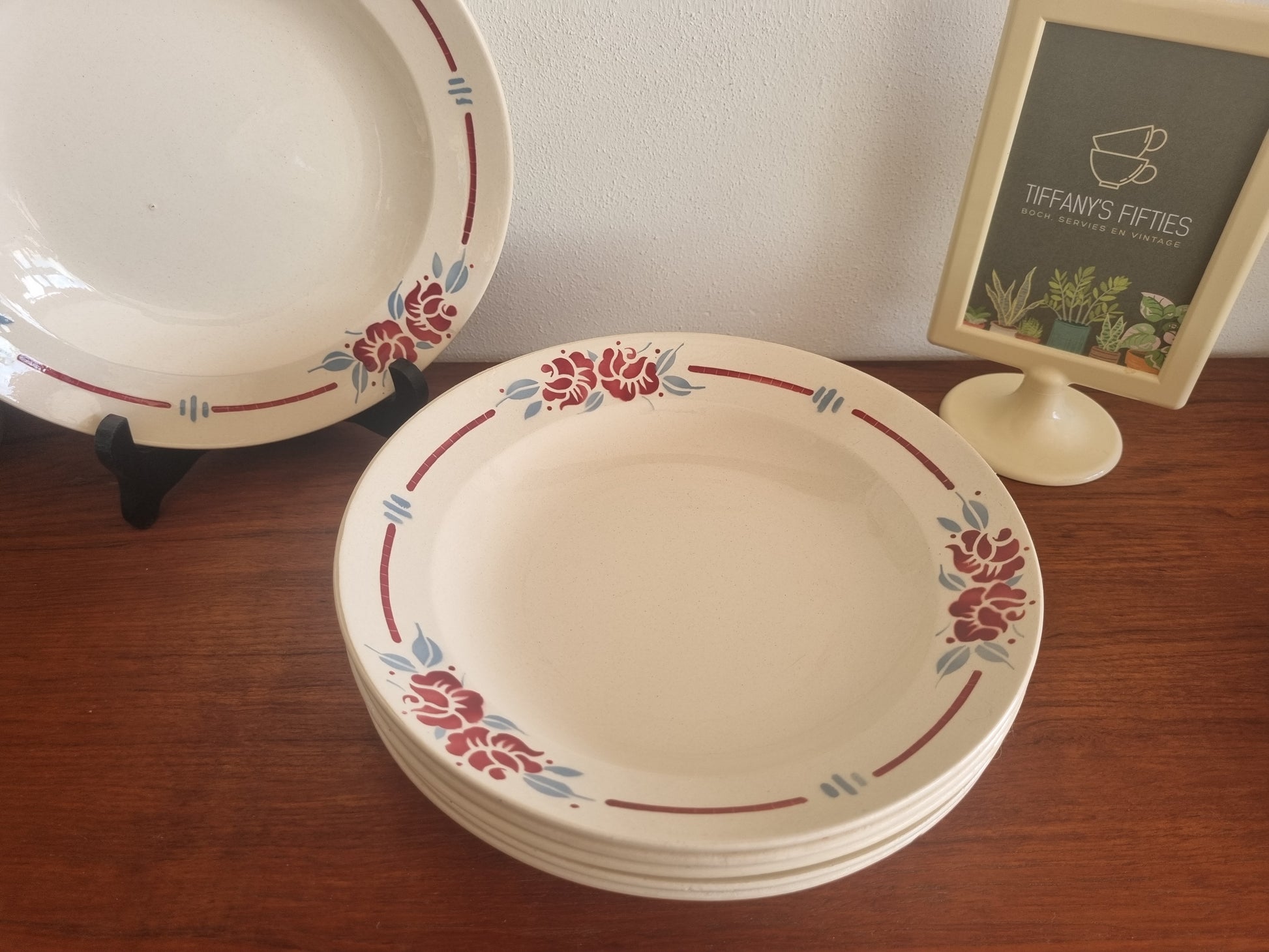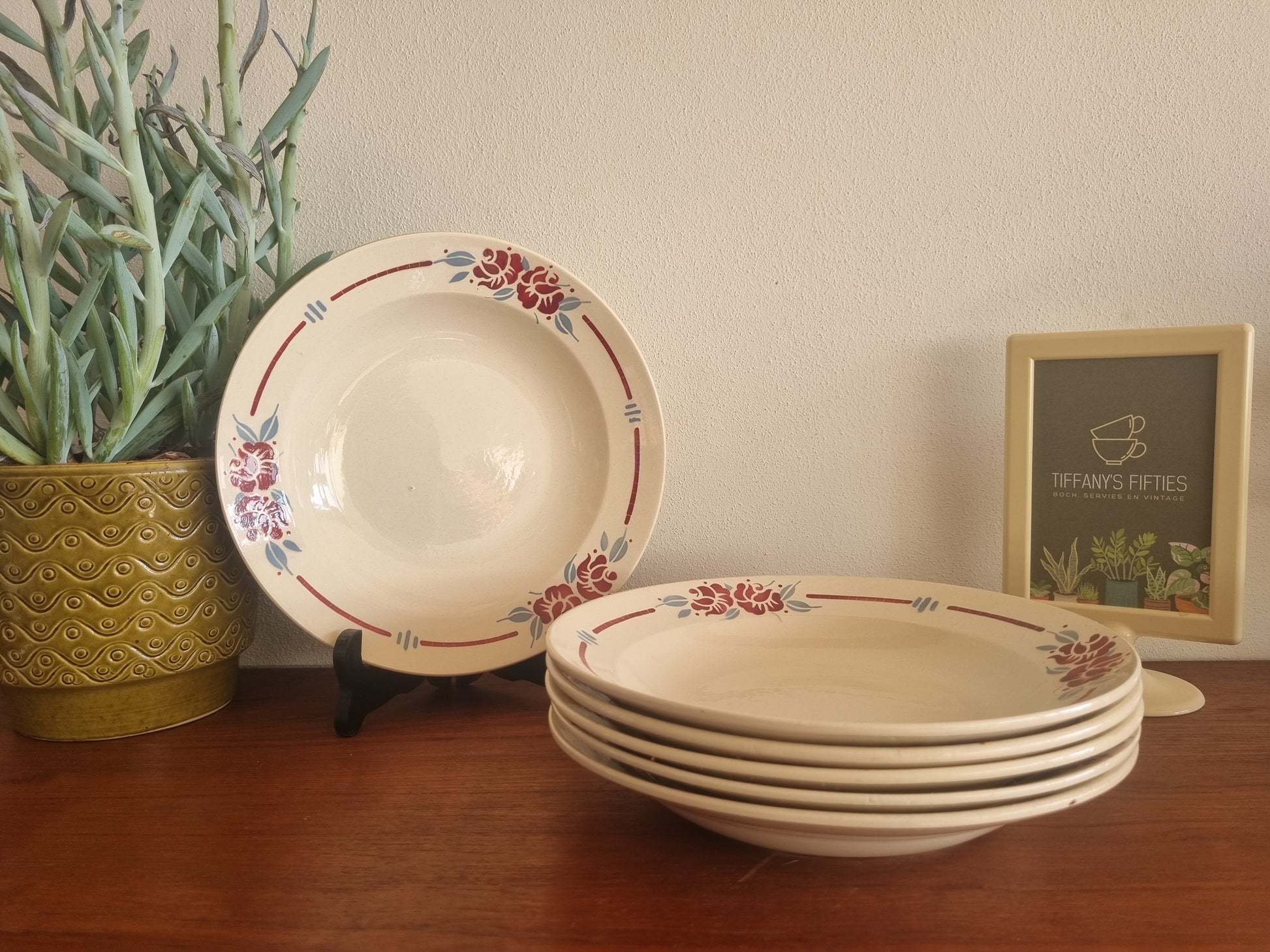 Diepe borden van Boch La Louvière, in crèmekleurig aardewerk met handbeschilderd bloemendecor in rood en blauw en een fijne rode lijn rondom.