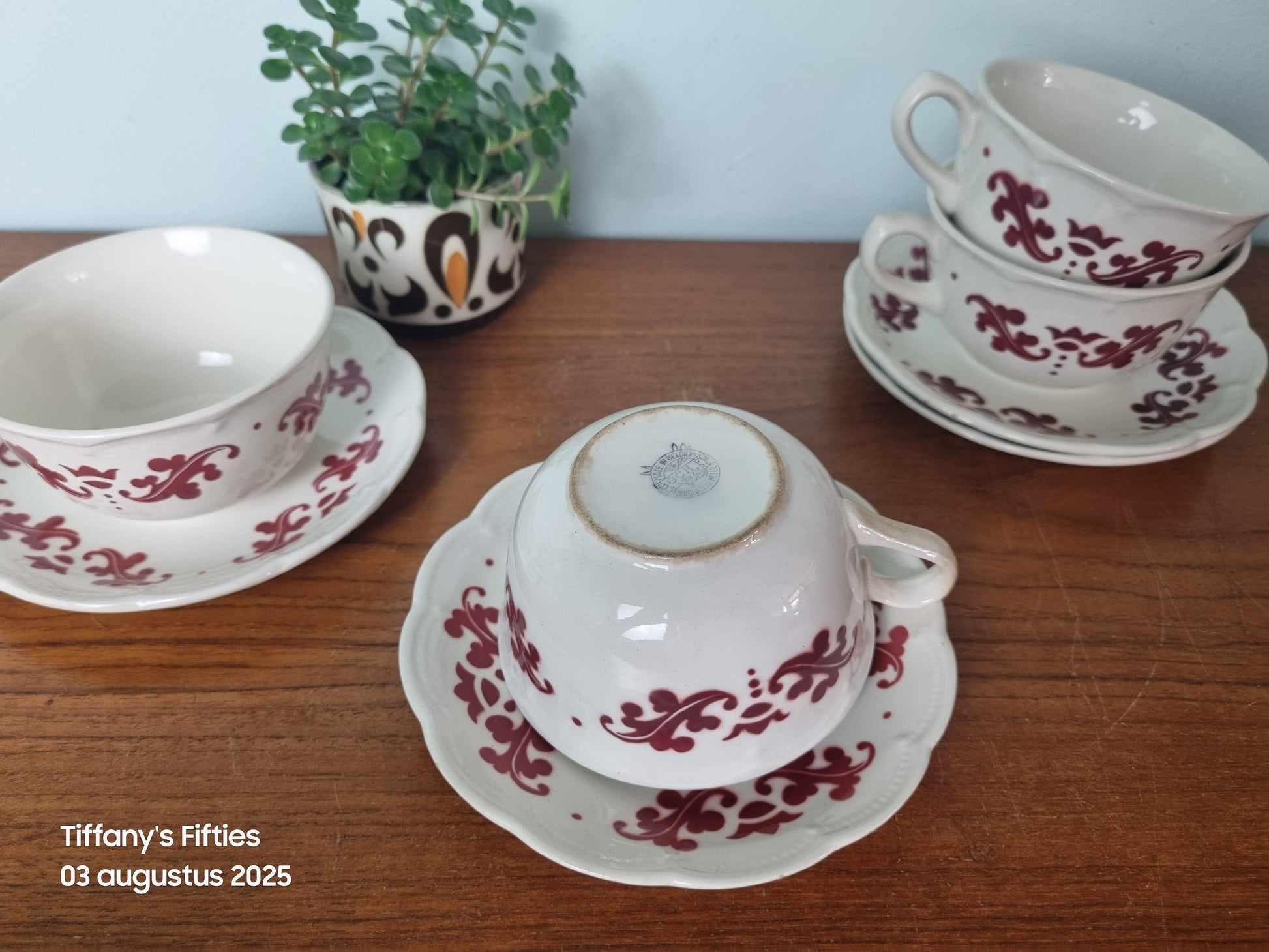 Elegante kop en schotel van Boch La Louvière uit de Festival-reeks, uitgevoerd in wit aardewerk met het klassieke Coronation-decor in een diepe wijnrode kleur. De decoratie met gestileerde bladmotieven loopt rondom de kop en wordt herhaald op het schoteltje met golvende rand. Typisch Belgisch retroservies uit de jaren 50-60.
