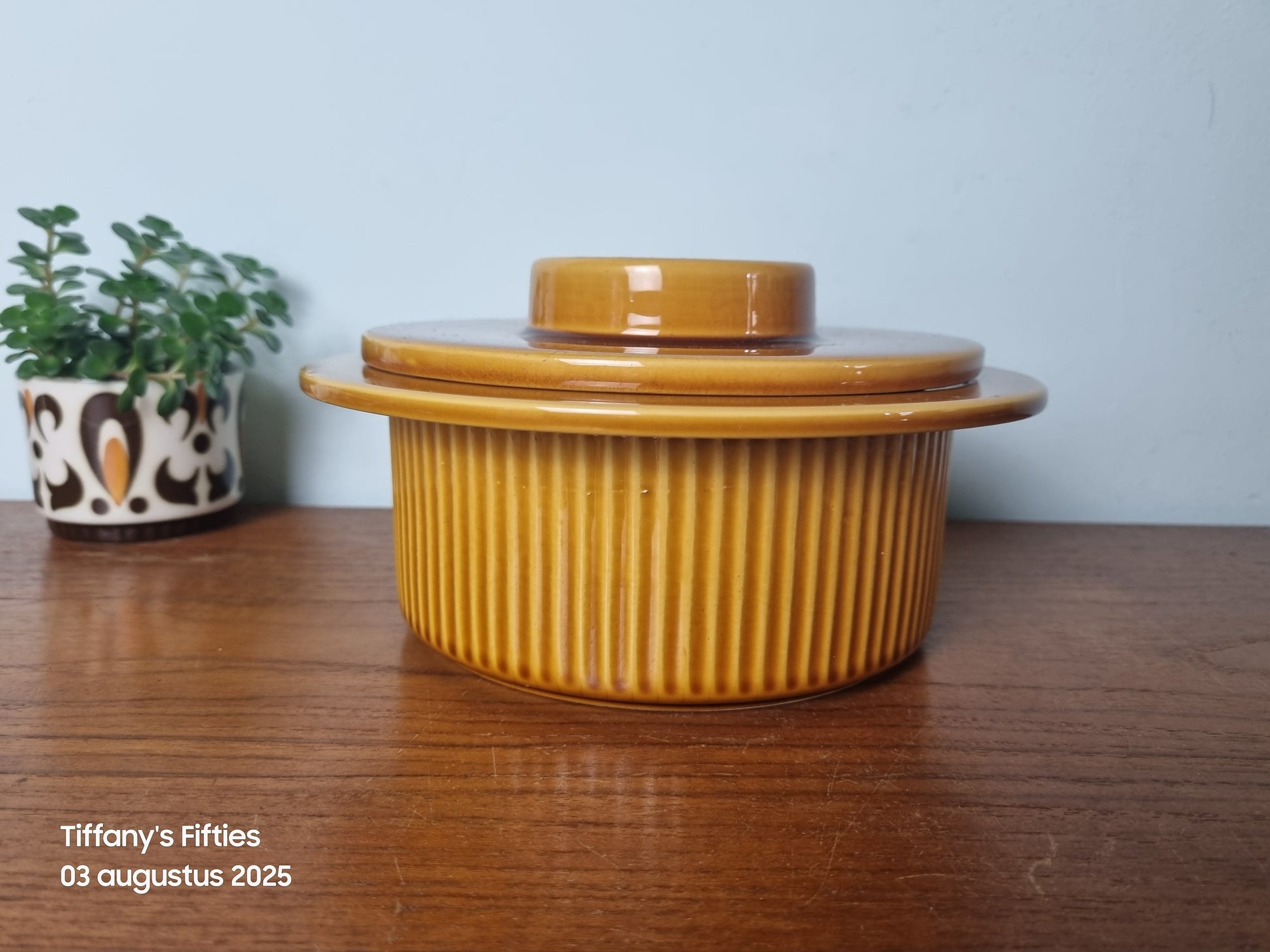 Mosterdgele ovenschaal met deksel uit de Noovo-reeks van Huizen-Holland, met een kenmerkende verticale ribstructuur rondom de schaal en een strakke, platte deksel met brede rand. Uitgevoerd in glanzend geglazuurd keramiek, typisch voor het Nederlandse retrodesign uit de jaren 70.