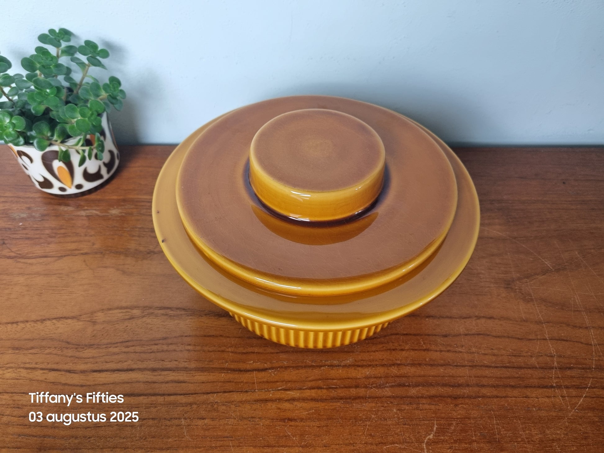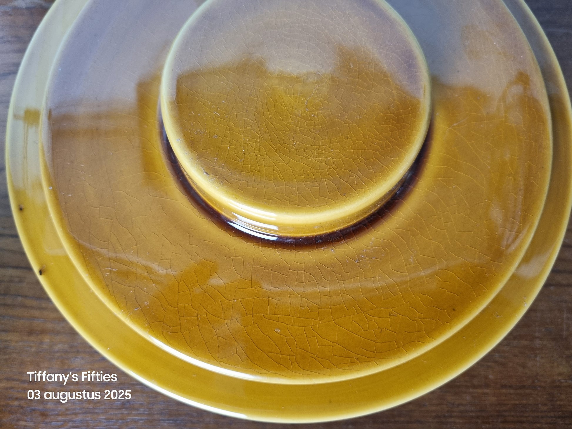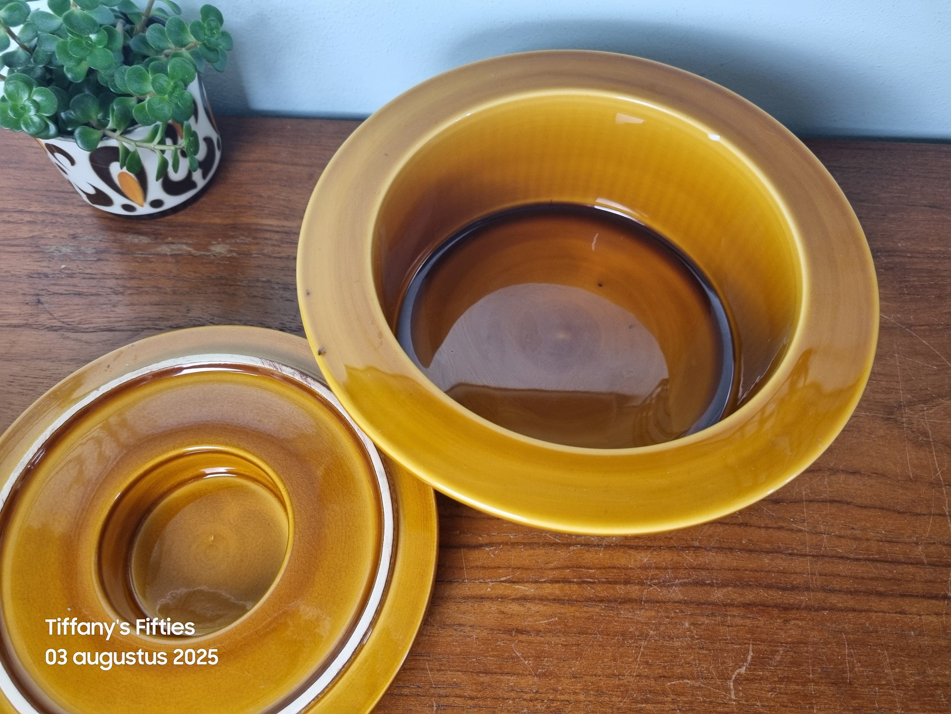 Uitstekende vintage staat. Geen barsten of chips. Craquelee zichtbaar in het deksel en een oneffenheid in het glazuur aan de binnenkant van de rand.