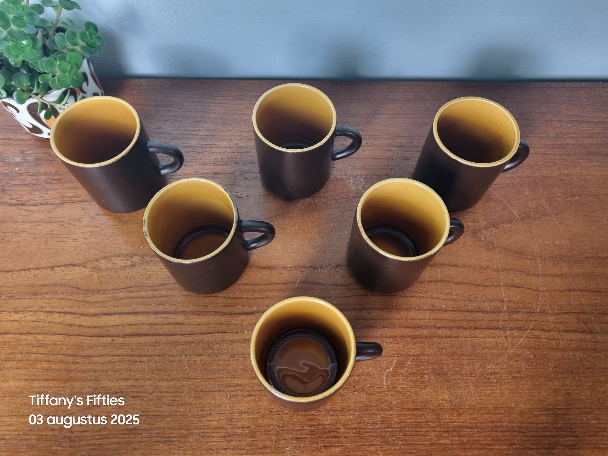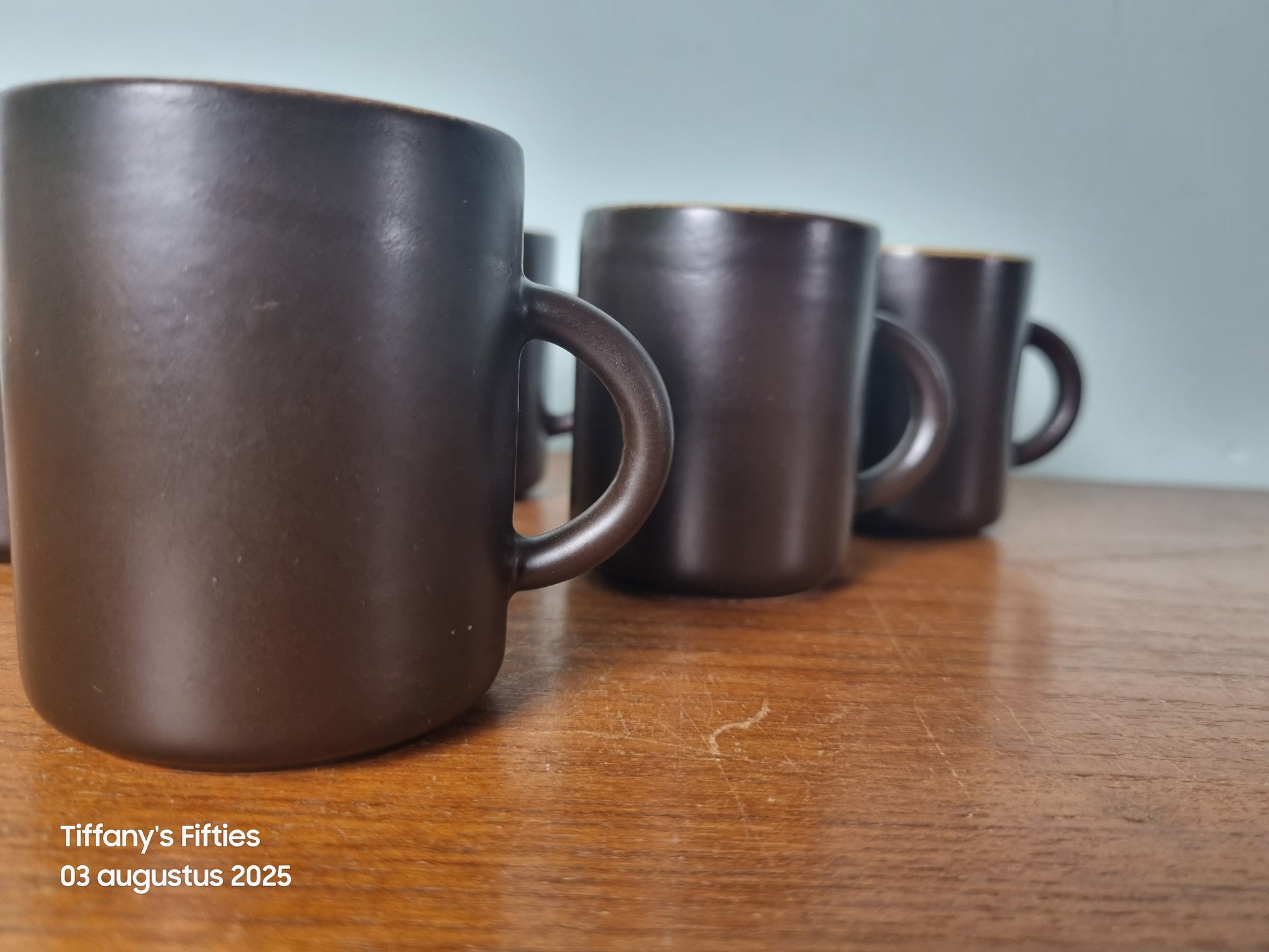 Mokken van Huizen Holland, vorm Utrecht. Donkerbruin mat geglazuurd aardewerk aan de buitenzijde en warm okergeel aan de binnenzijde, met een strakke, cilindervormige belijning en een robuust oor.