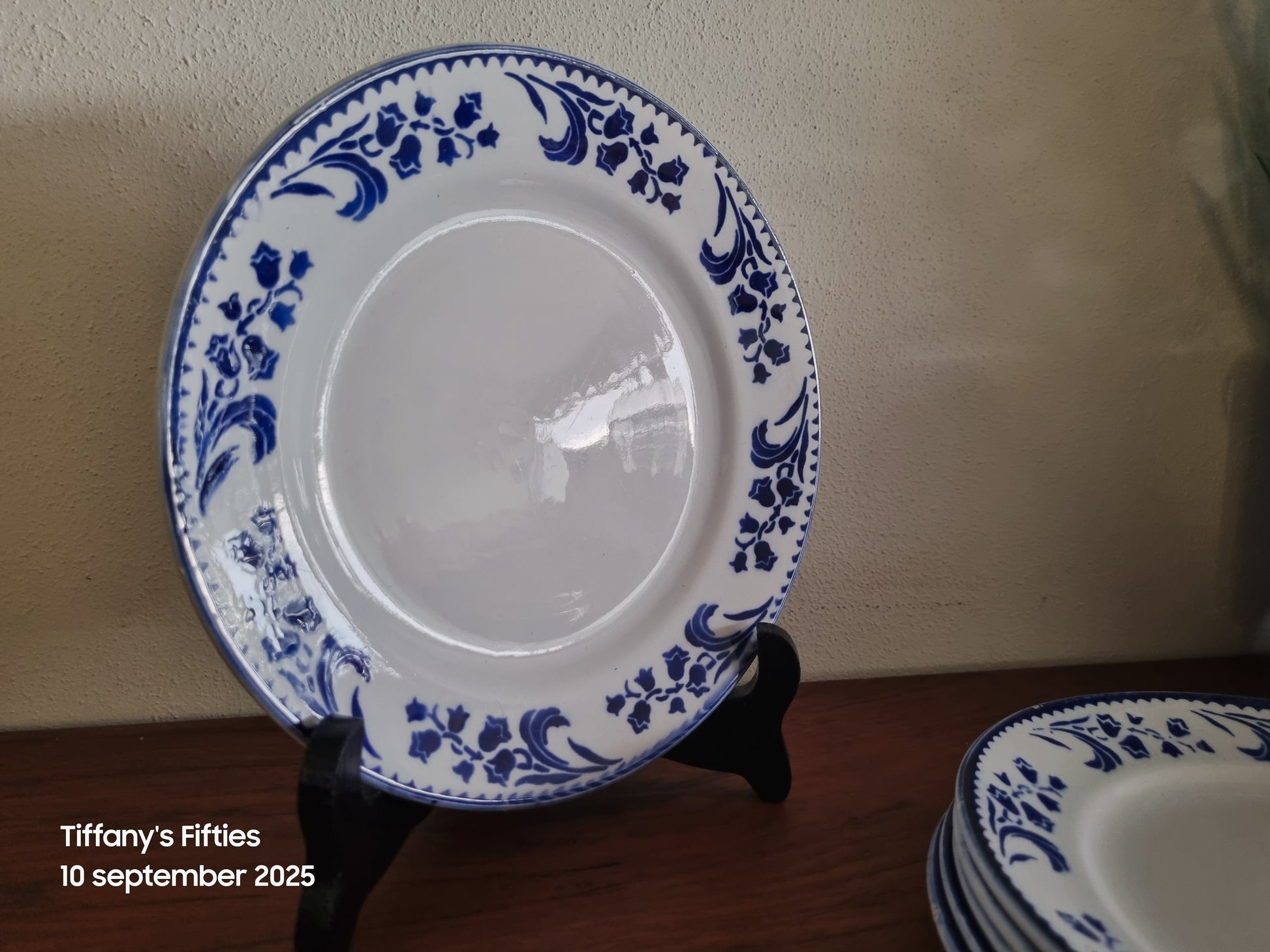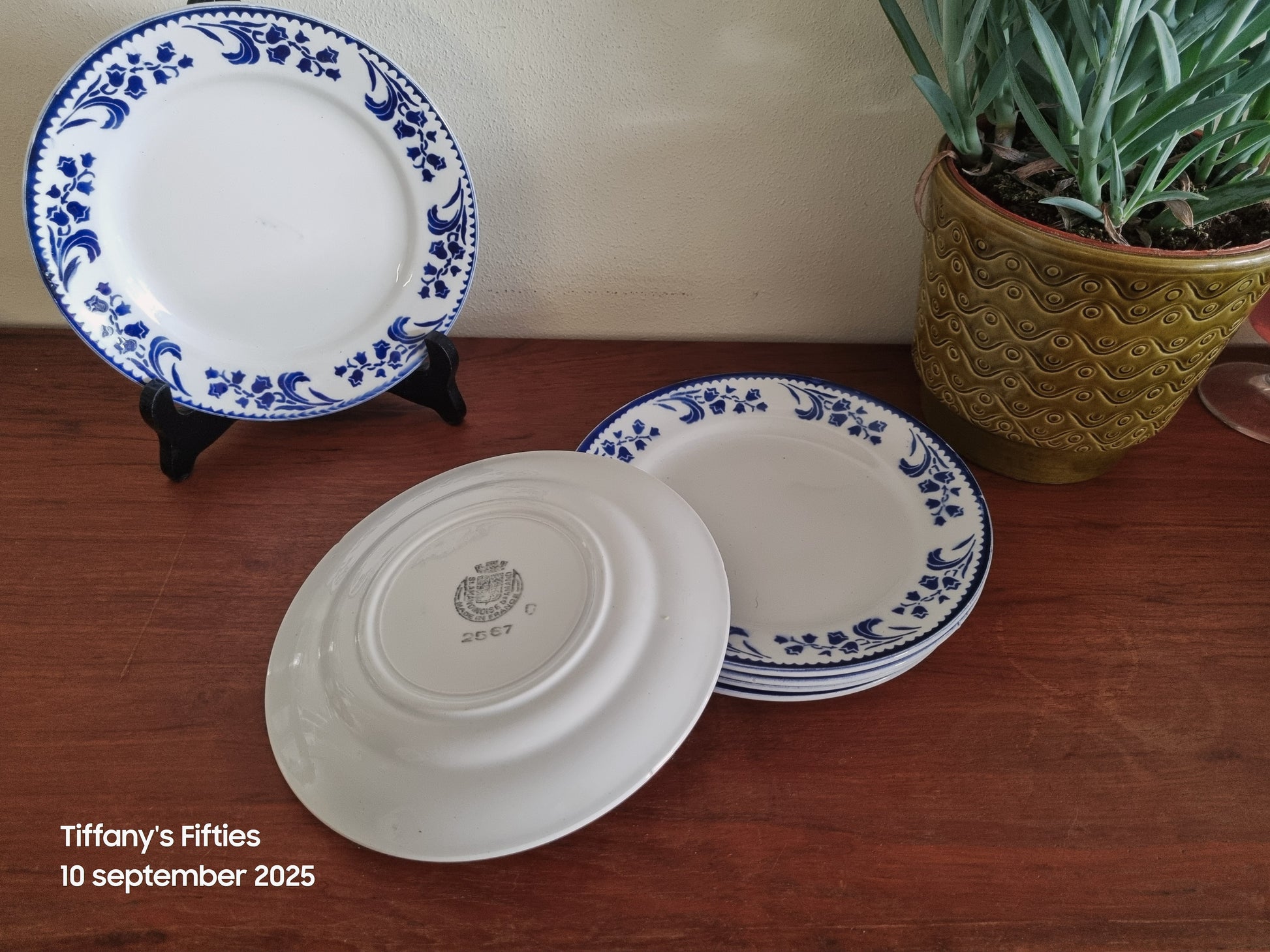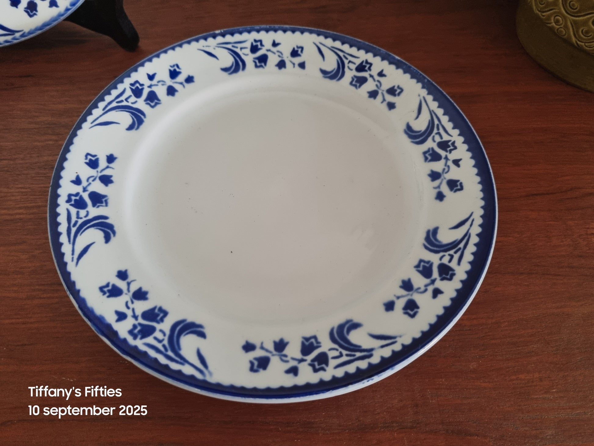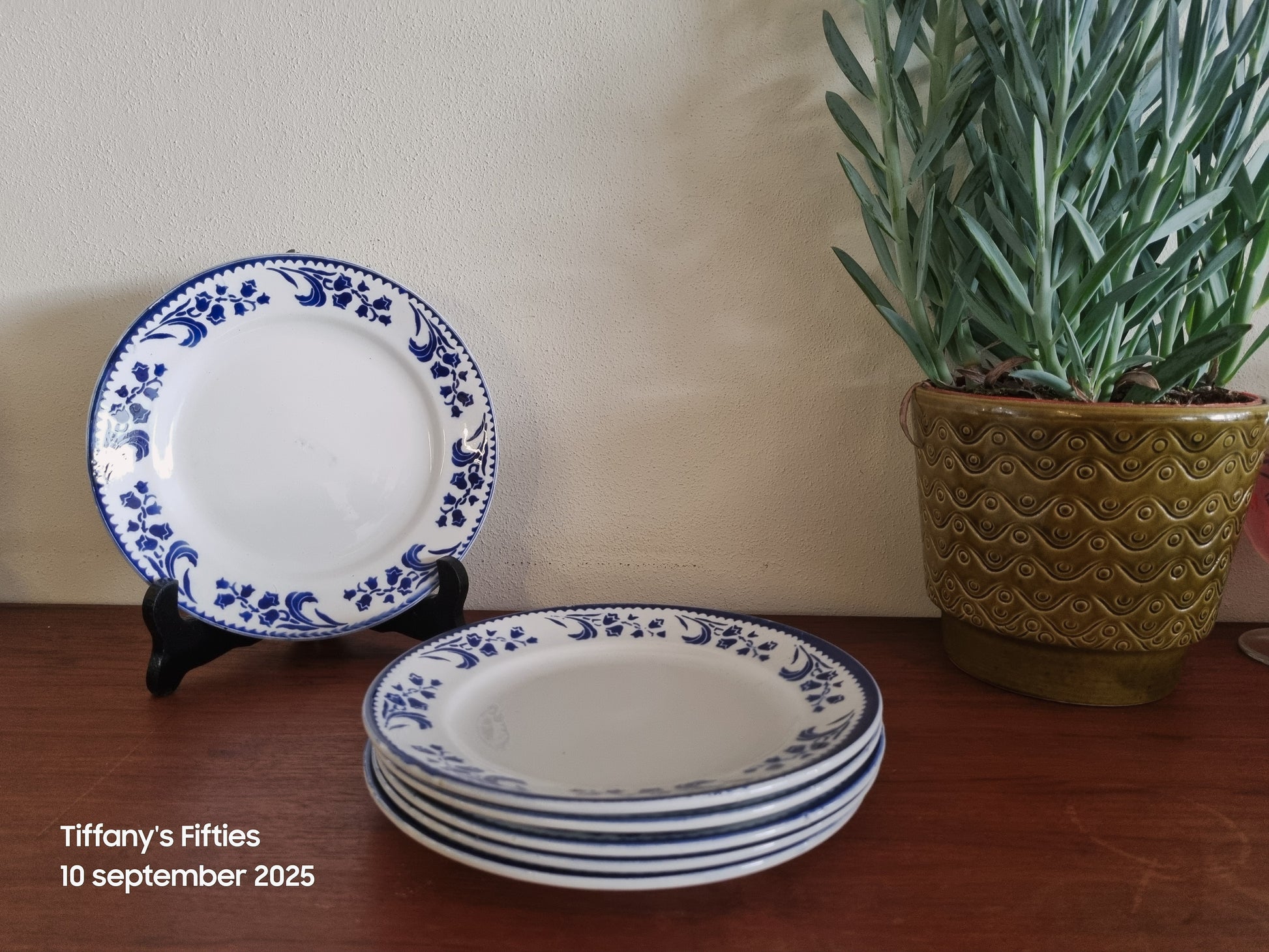 Franse dessertborden in wit aardewerk met een klassiek blauw florale randdecoratie. Het patroon bestaat uit ranken en gestileerde bloemetjes die een sierlijk karakter geven.