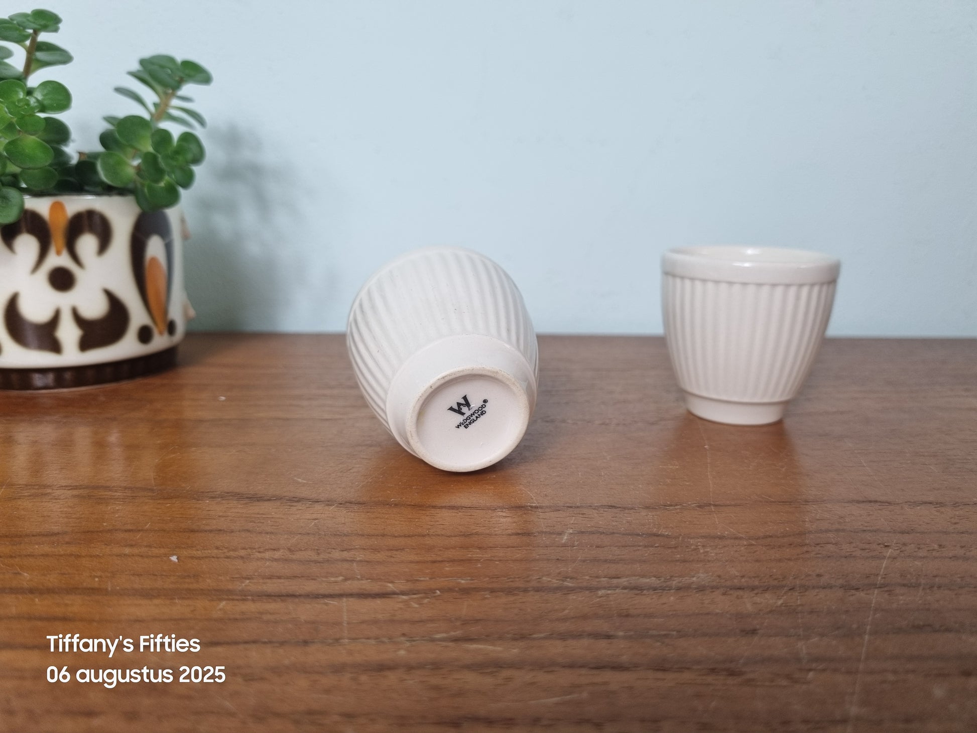 Eierdopjes van Wedgwood in klassiek wit aardewerk met verticale ribbelstructuur rondom. Het tijdloze ontwerp straalt eenvoud en elegantie uit, typisch voor Wedgwood servies uit de midden 20e eeuw.