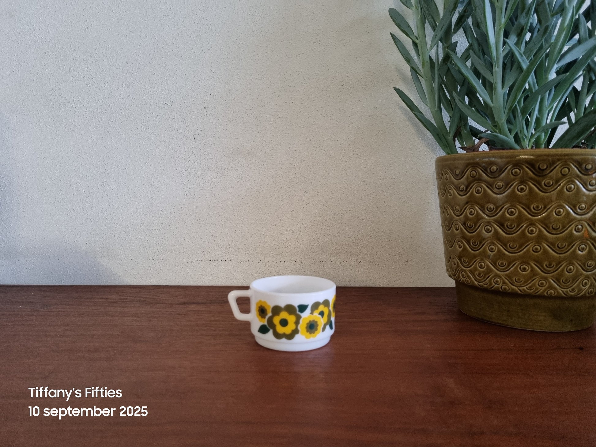 Espressokopje van Arcopal France, decor Lotus uitgevoerd in wit opaalglas met een vrolijk bloemdecor in geel en groen. Het retro motief van gestileerde bloemen geeft dit kopje de typische seventies-uitstraling waar Arcopal zo geliefd om is.