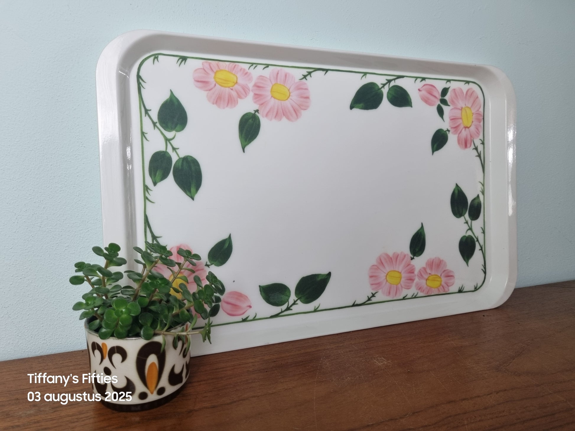 Groot wit kunststof dienblad van Villeroy & Boch met het iconische Wild Rose decor. Het oppervlak is versierd met roze bloemen, gele harten en donkergroene bladeren, omlijst door een sierlijke klimop-achtige rank. Deze vrolijke jaren 70-klassieker is niet alleen praktisch, maar ook een decoratief statement op tafel of in de keuken.