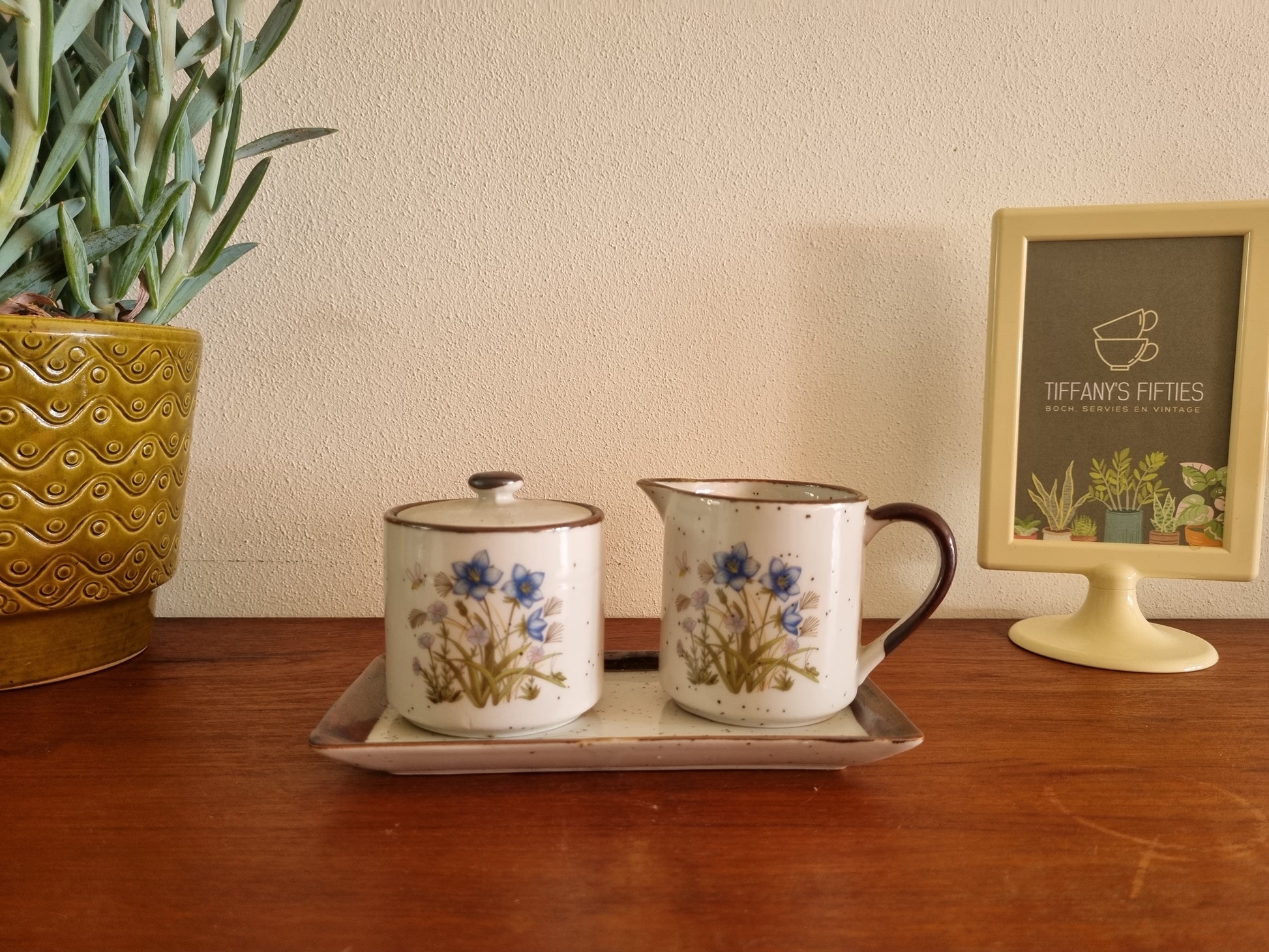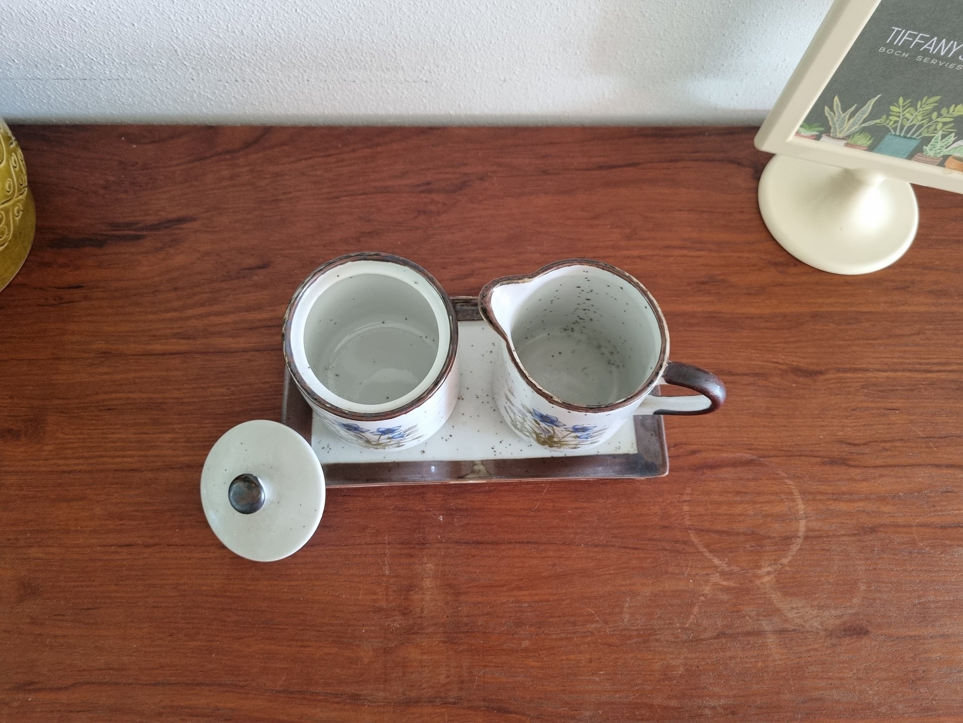 Melk- en suikerset op schaaltje in aardewerk, met een charmant veldbloemenmotief in blauw en groen. De set bestaat uit een suikerpot met deksel, een melkkan en een bijpassend serveerschaaltje. De bruine randafwerking geeft het geheel een warme, landelijke uitstraling.