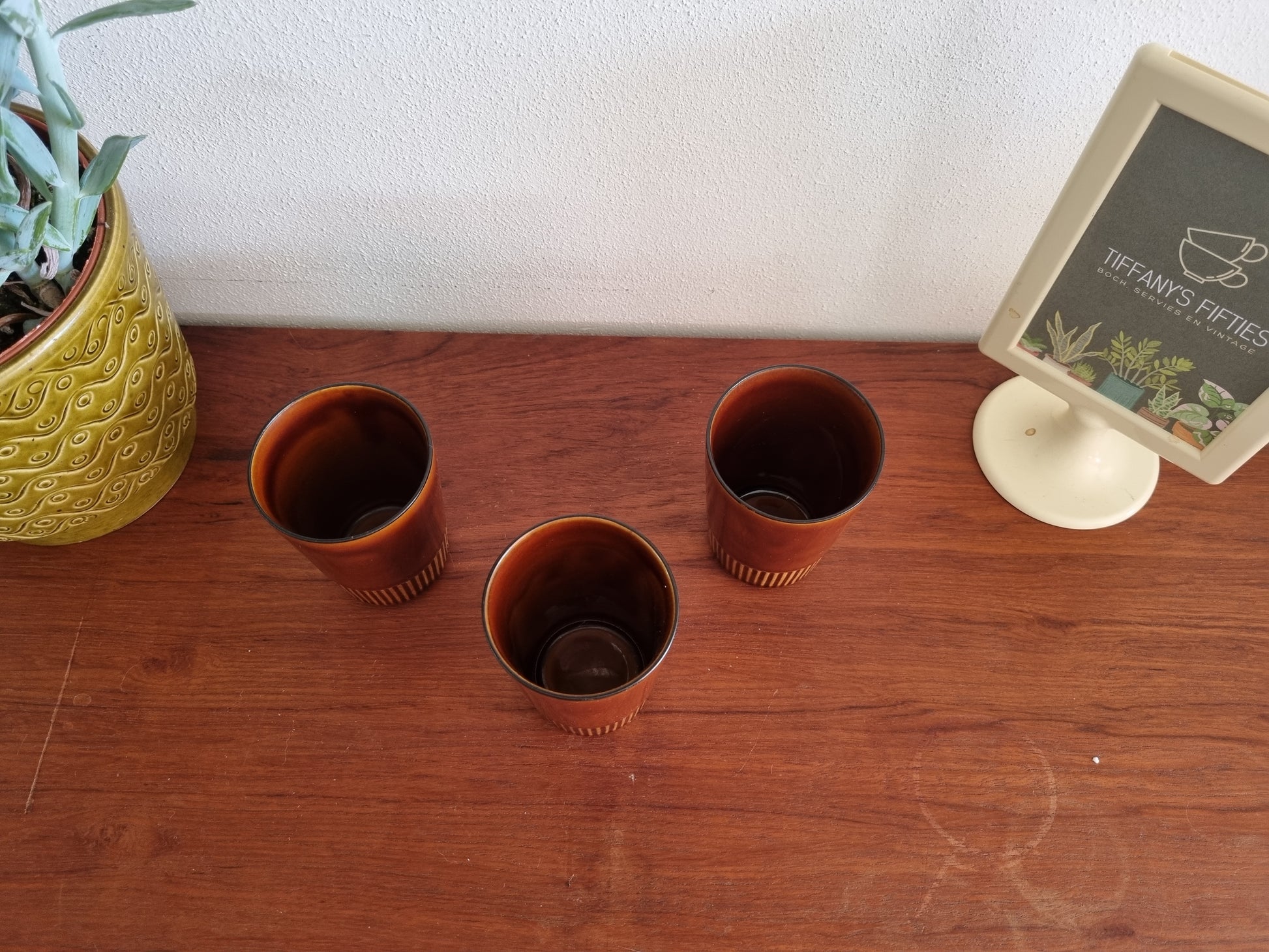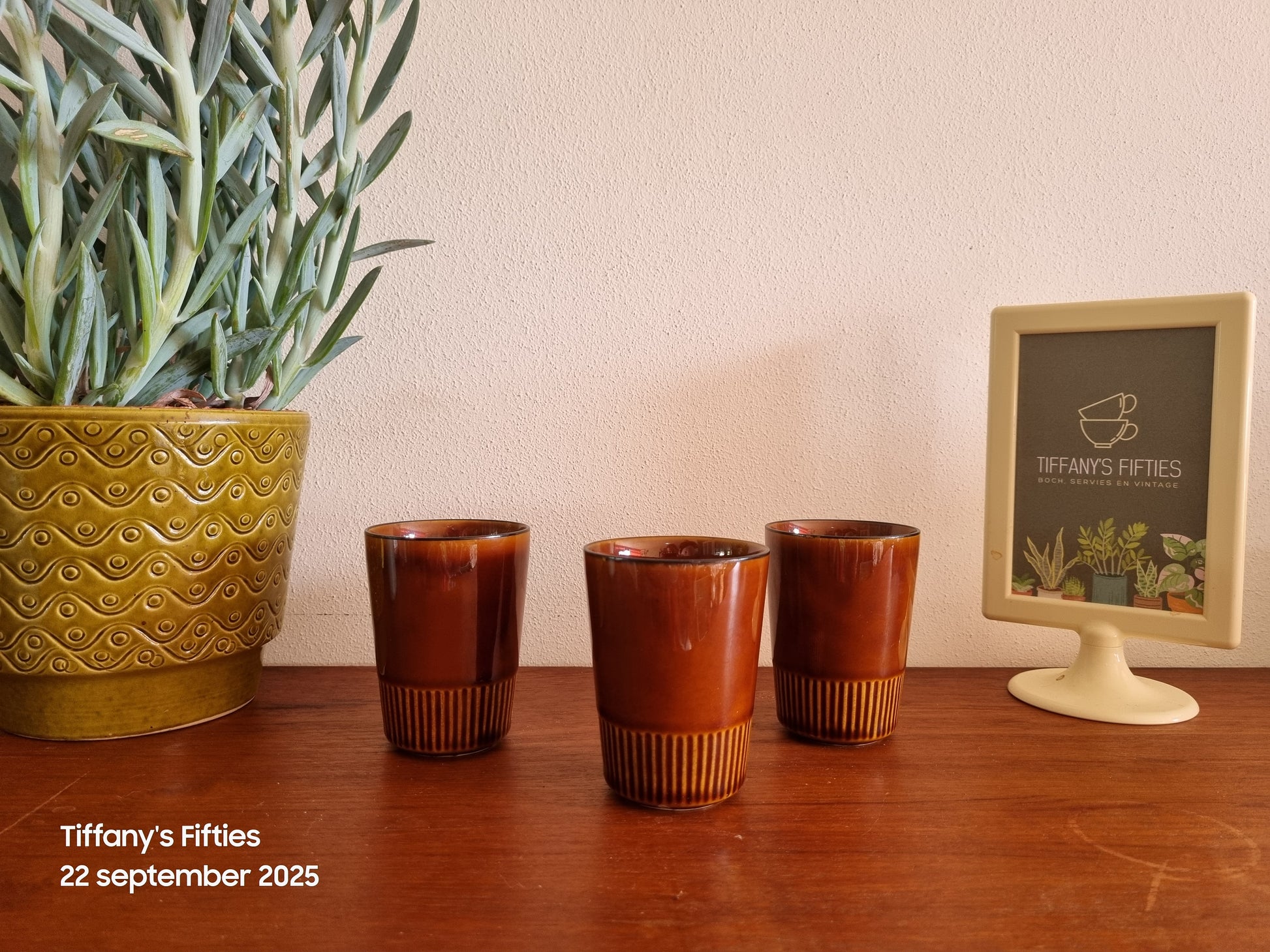 Bekers van Pruszków, Polen, uitgevoerd in bruin geglazuurd aardewerk met een gladde bovenkant en een geribbelde onderzijde. Typisch mid-century design uit de jaren ’60/’70, stoer en warm van uitstraling.