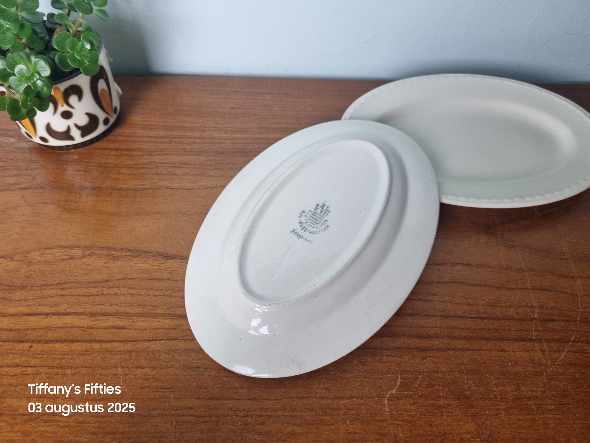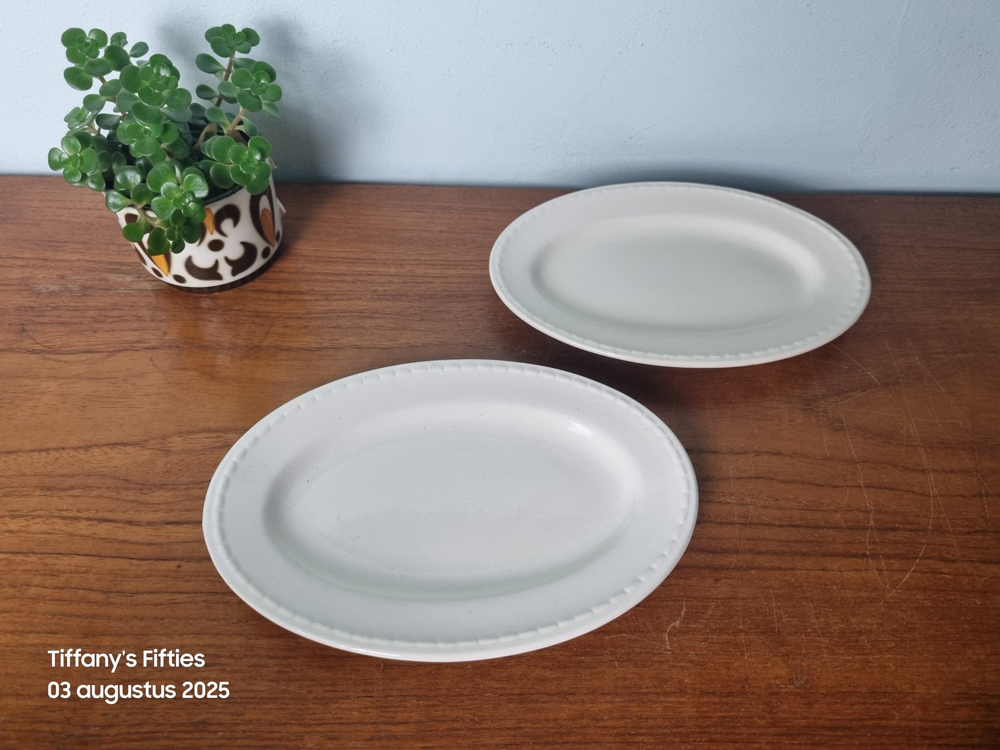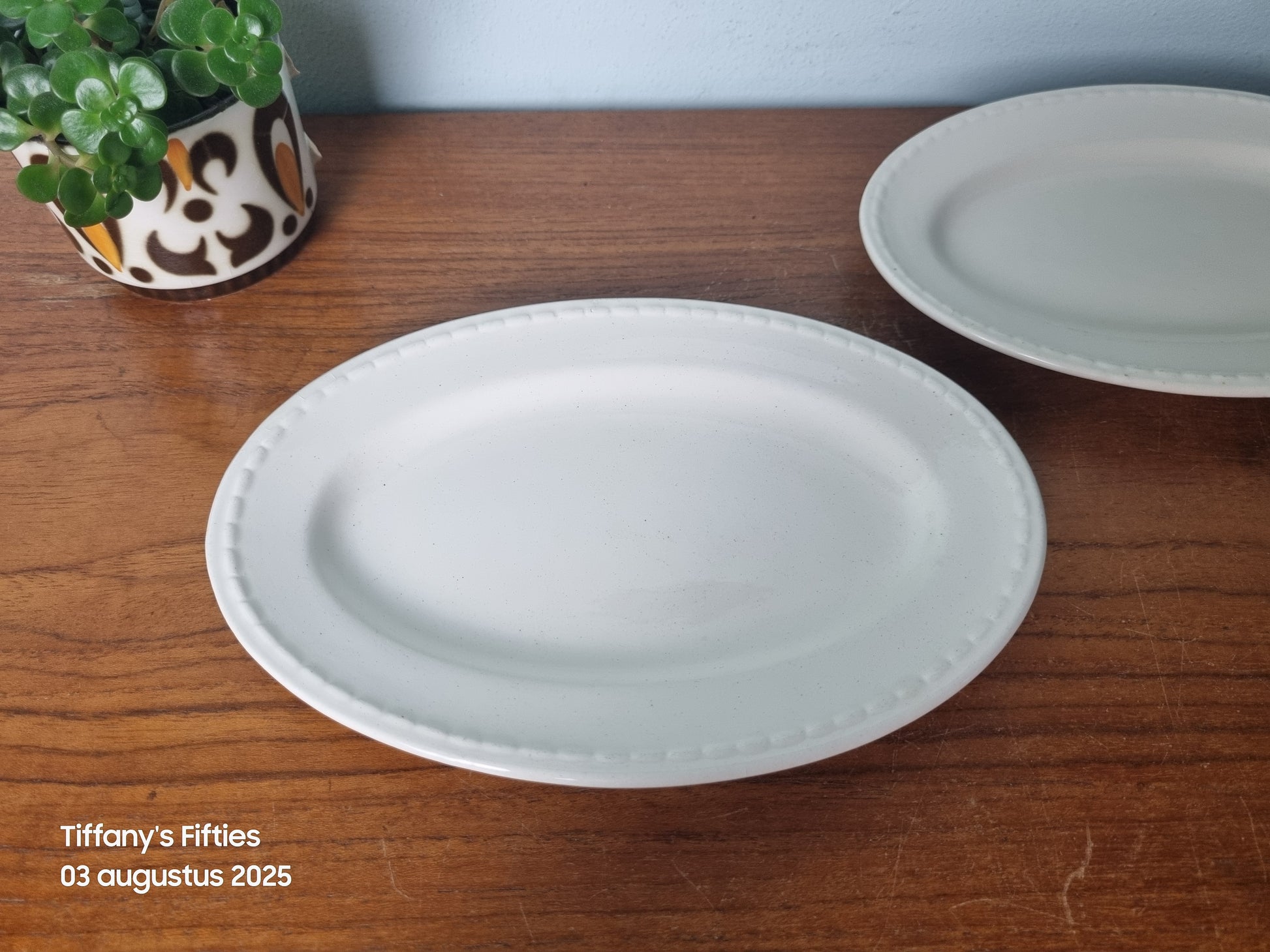 Kleine ovale serveerschaaltjes van VVB Elsterwerda. Wit aardewerk met een subtiel reliëf langs de rand, strak en tijdloos vormgegeven.