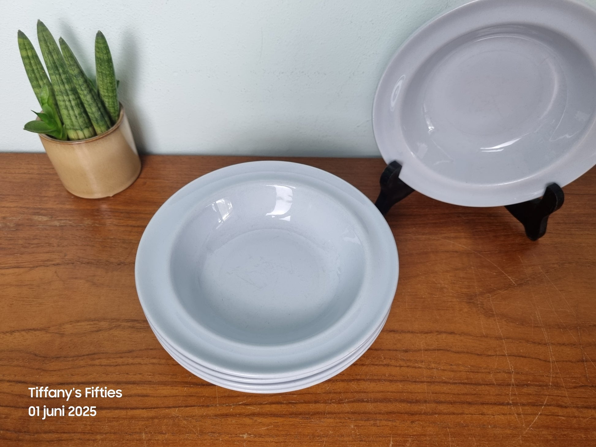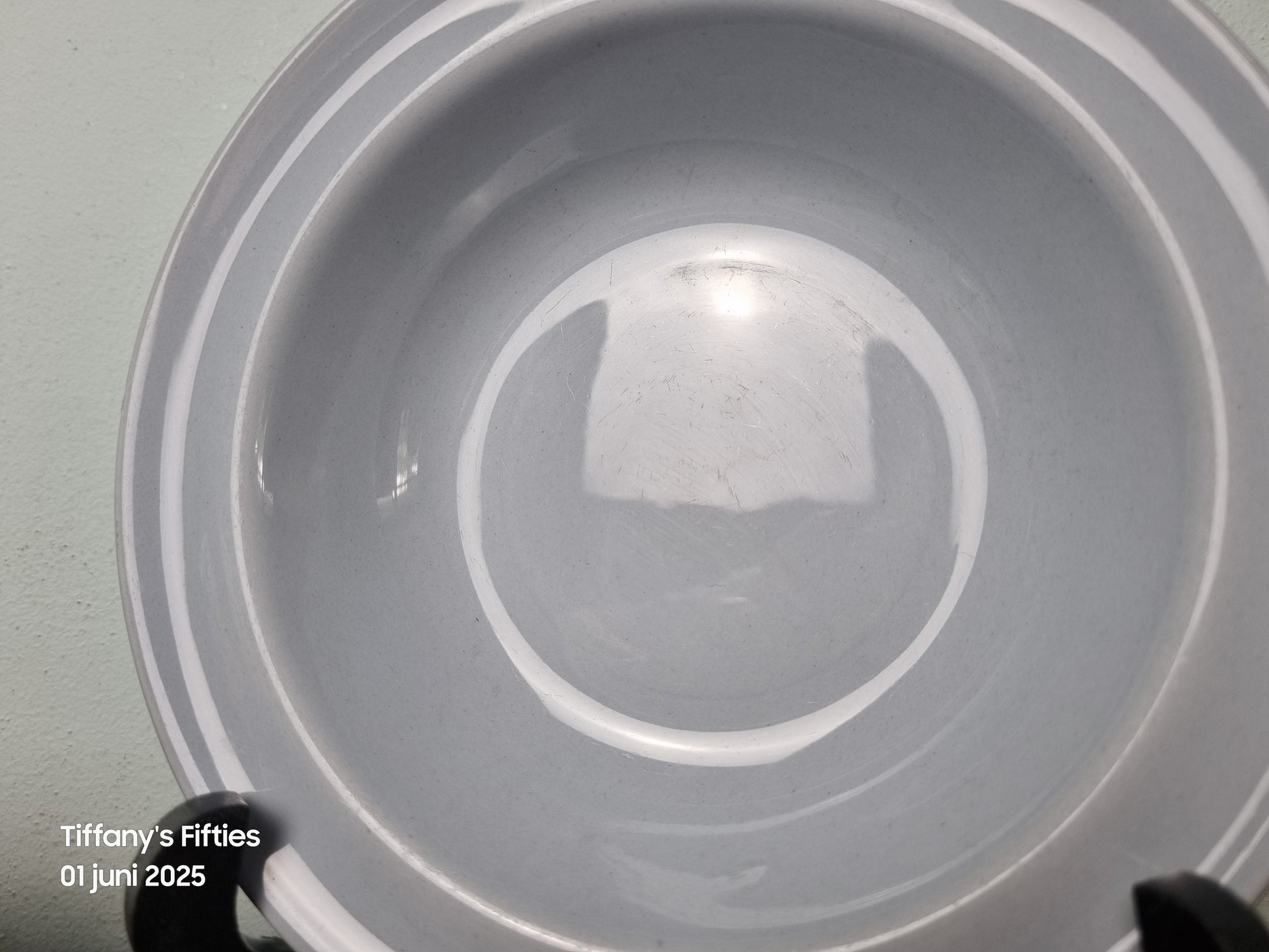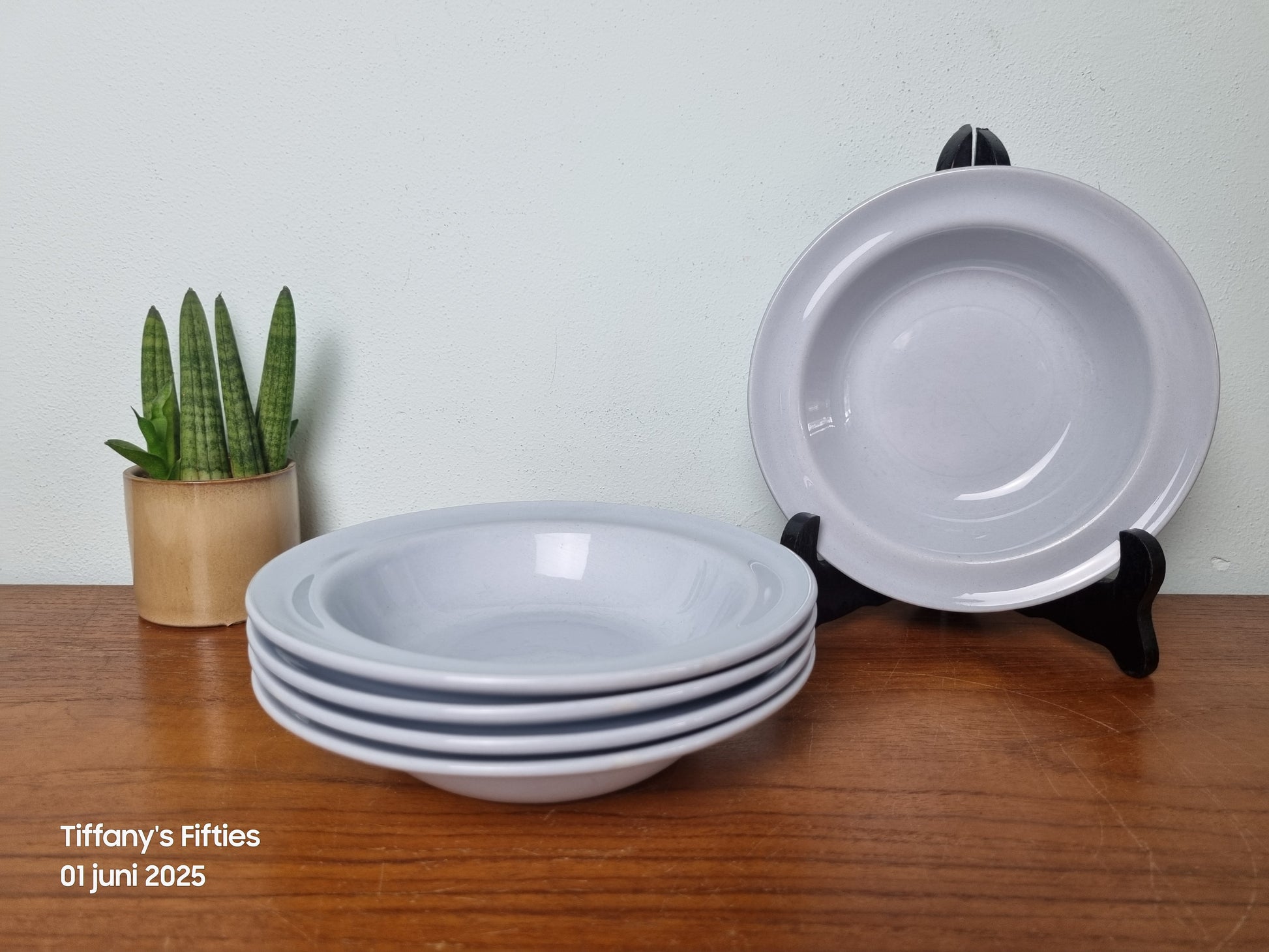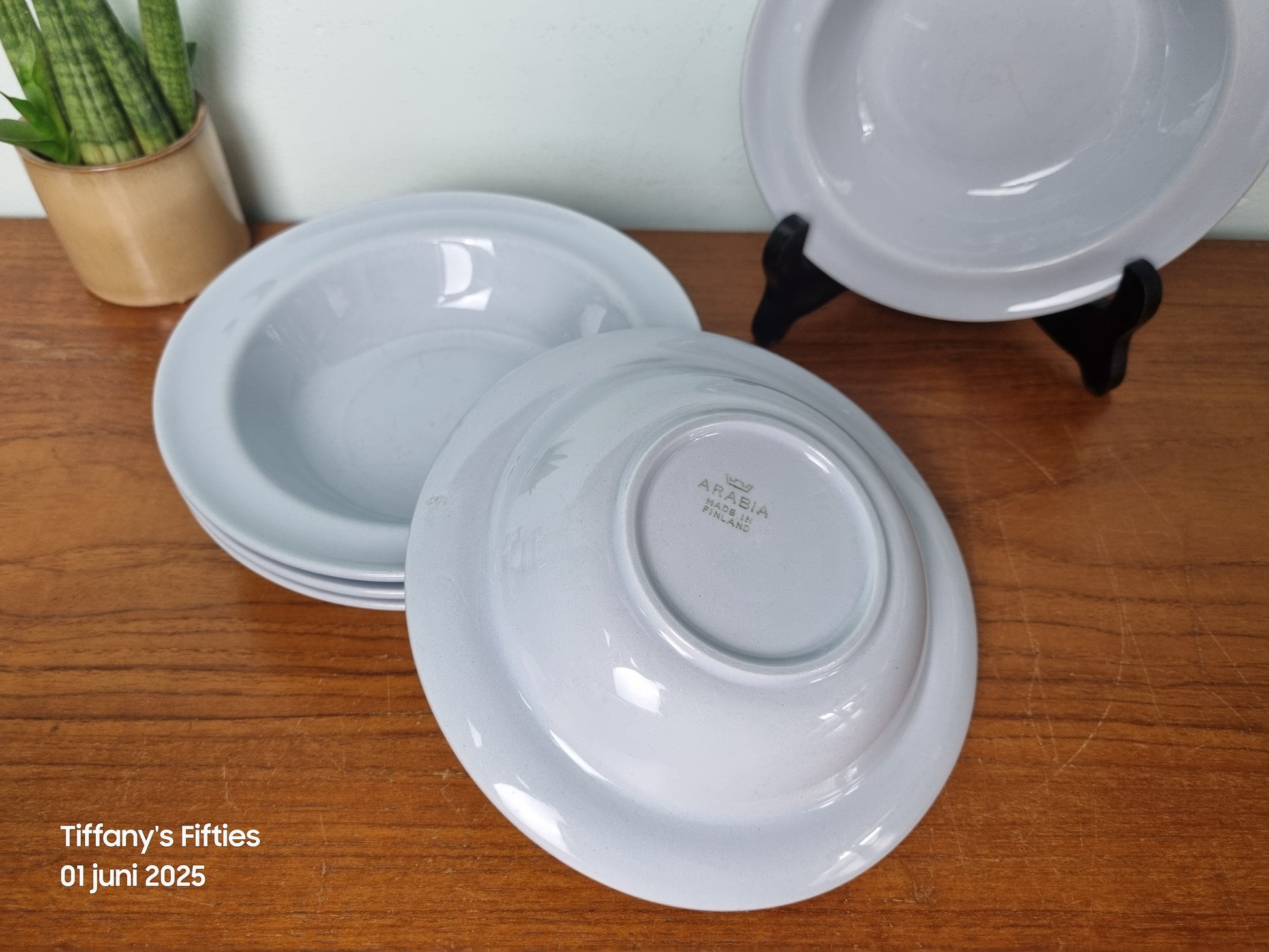 Tijdloze vintage soepbordjes van het Finse merk Arabia, uitgevoerd in een zachte lichtgrijze tint. Het sobere, maar verfijnde design met brede rand is kenmerkend voor Scandinavische vormgeving uit het midden van de 20e eeuw – stijlvol, functioneel en duurzaam. Onderaan gemerkt met Arabia – Made in Finland.