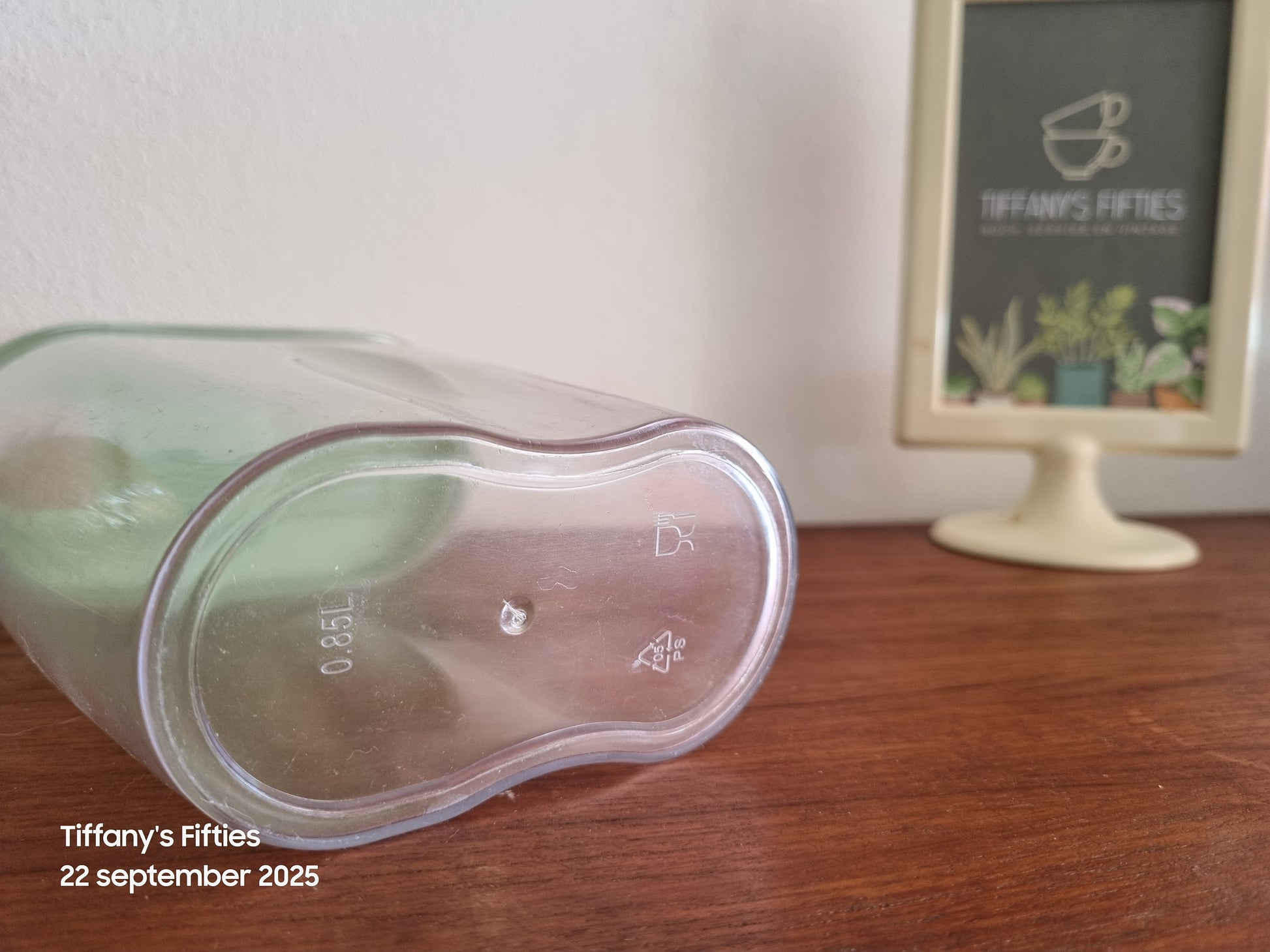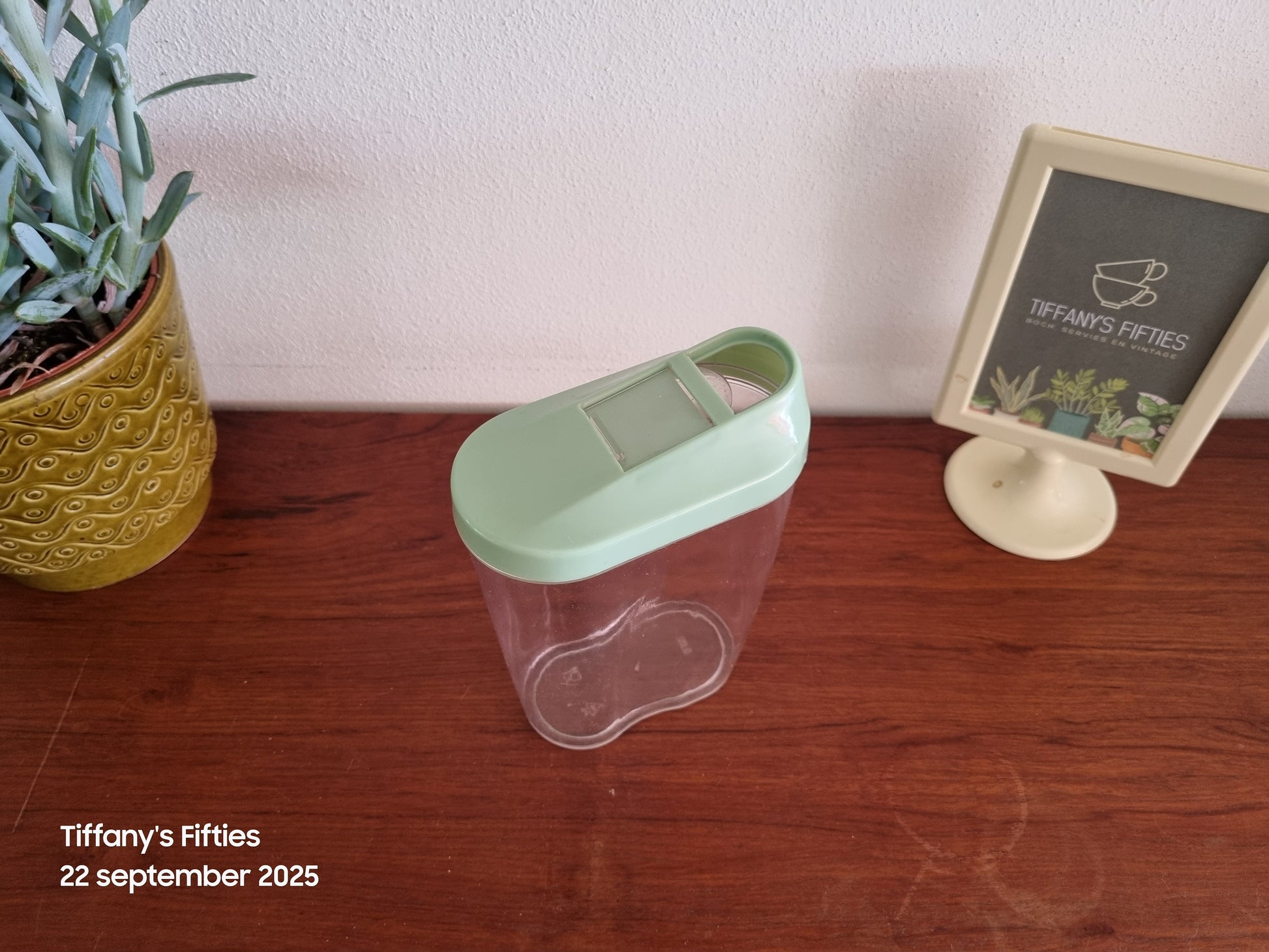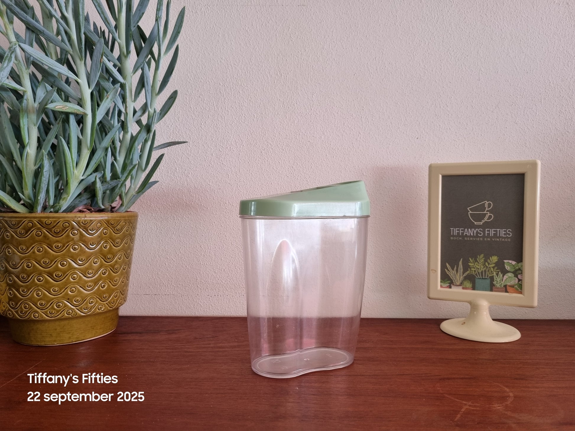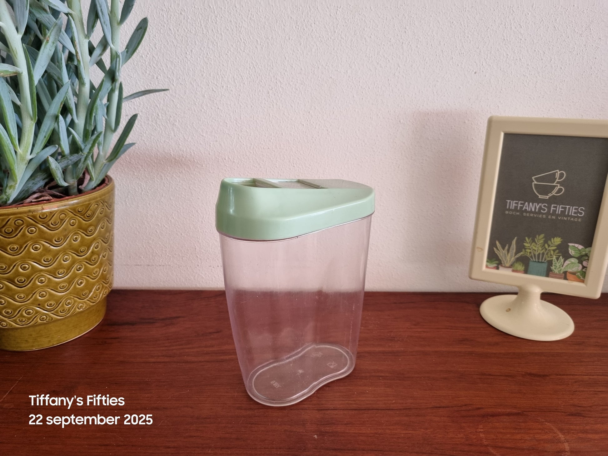 Vintage kunststof voorraadbus met schenktuit en lichtgroene deksel, vermoedelijk jaren ’70/’80. Transparante body met afgeronde vormen, handig voor het bewaren en uitschenken van bijvoorbeeld cornflakes, suiker of pasta.