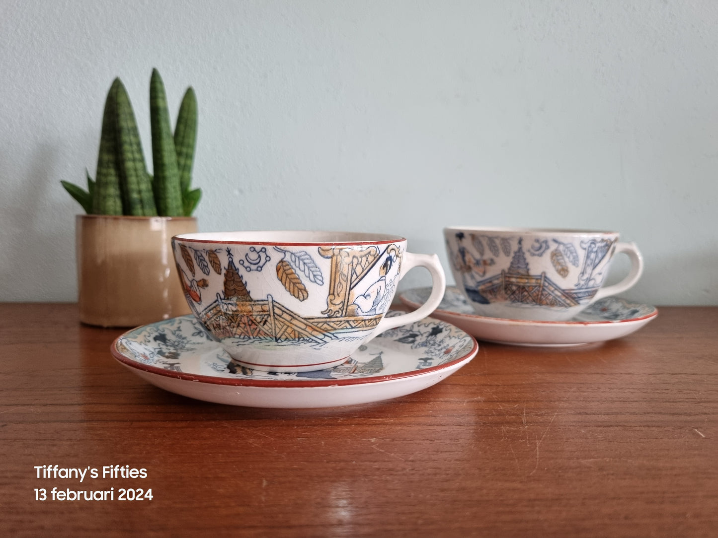 2 hele oude kopjes met schotel van Boch met Oosters decor Timor. In ongeschonden staat, wel craquelee in het glazuur.
