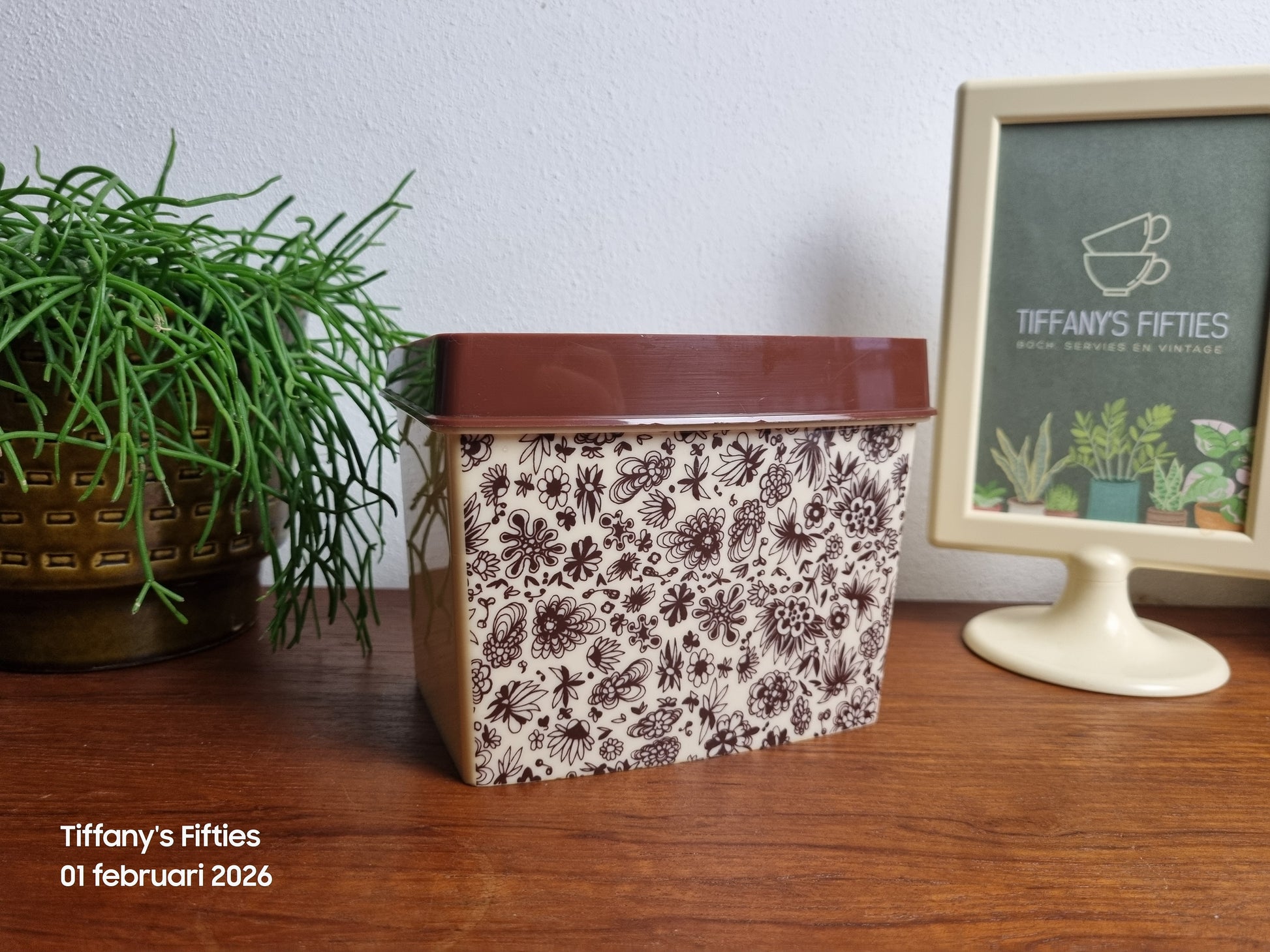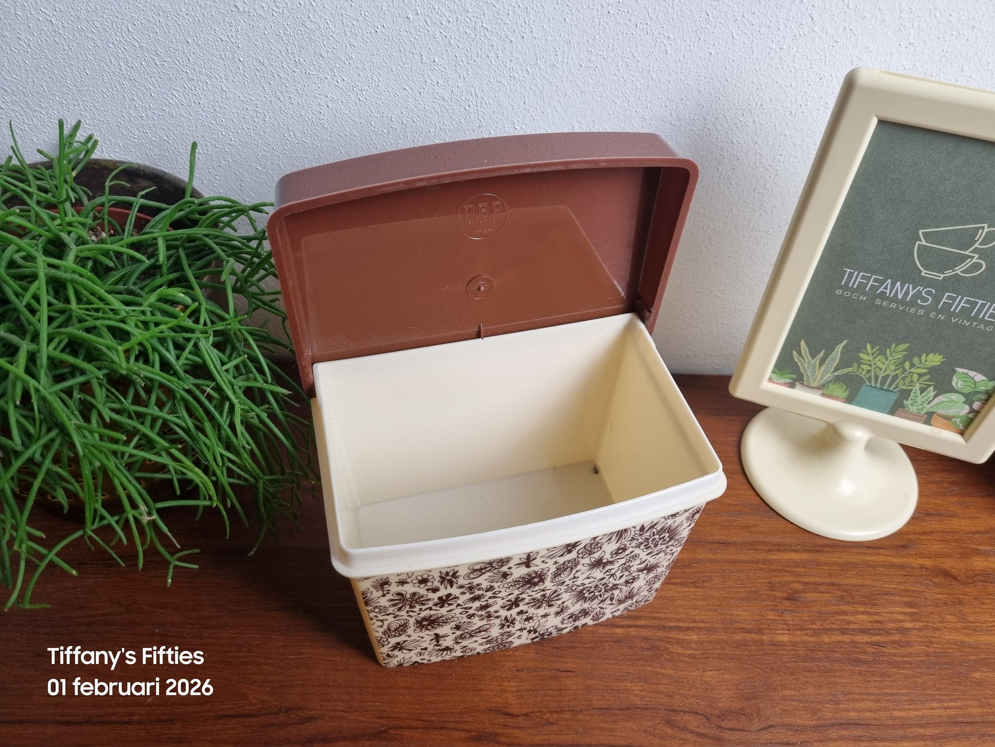 Bewaardoos van melamine met bruin deksel en bloemendecor, gemerkt DBP Antwerp. Gemaakt met een gedrukt patroon van gestileerde bloemen en bladeren in bruin op beige achtergrond, typerend voor het speelse en bloemrijke design uit de jaren '70.