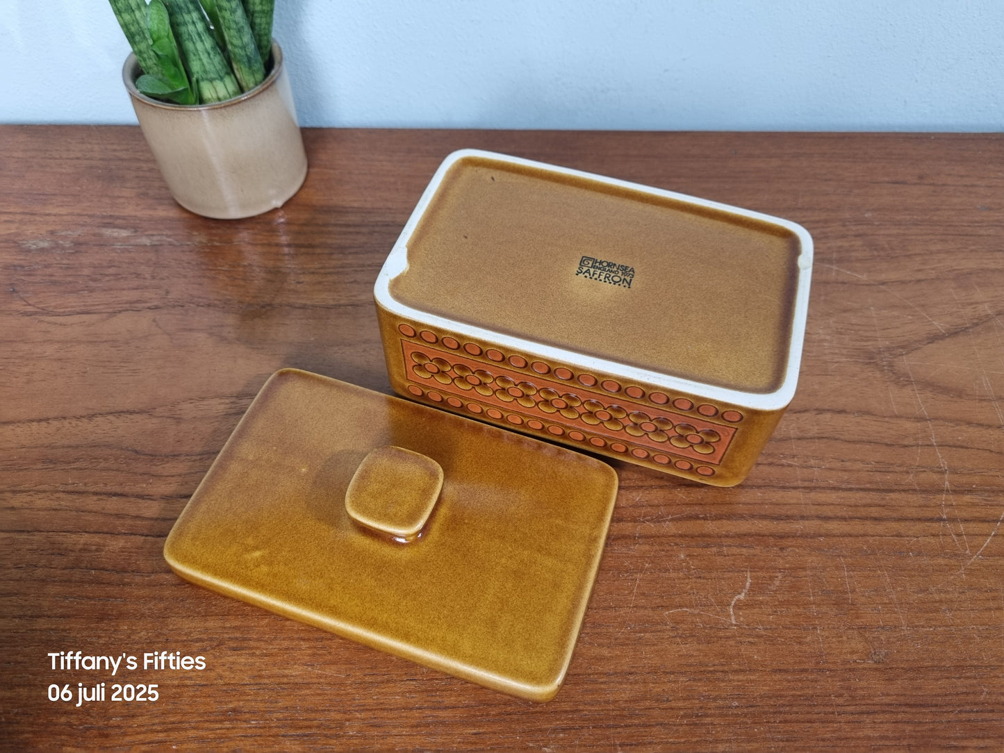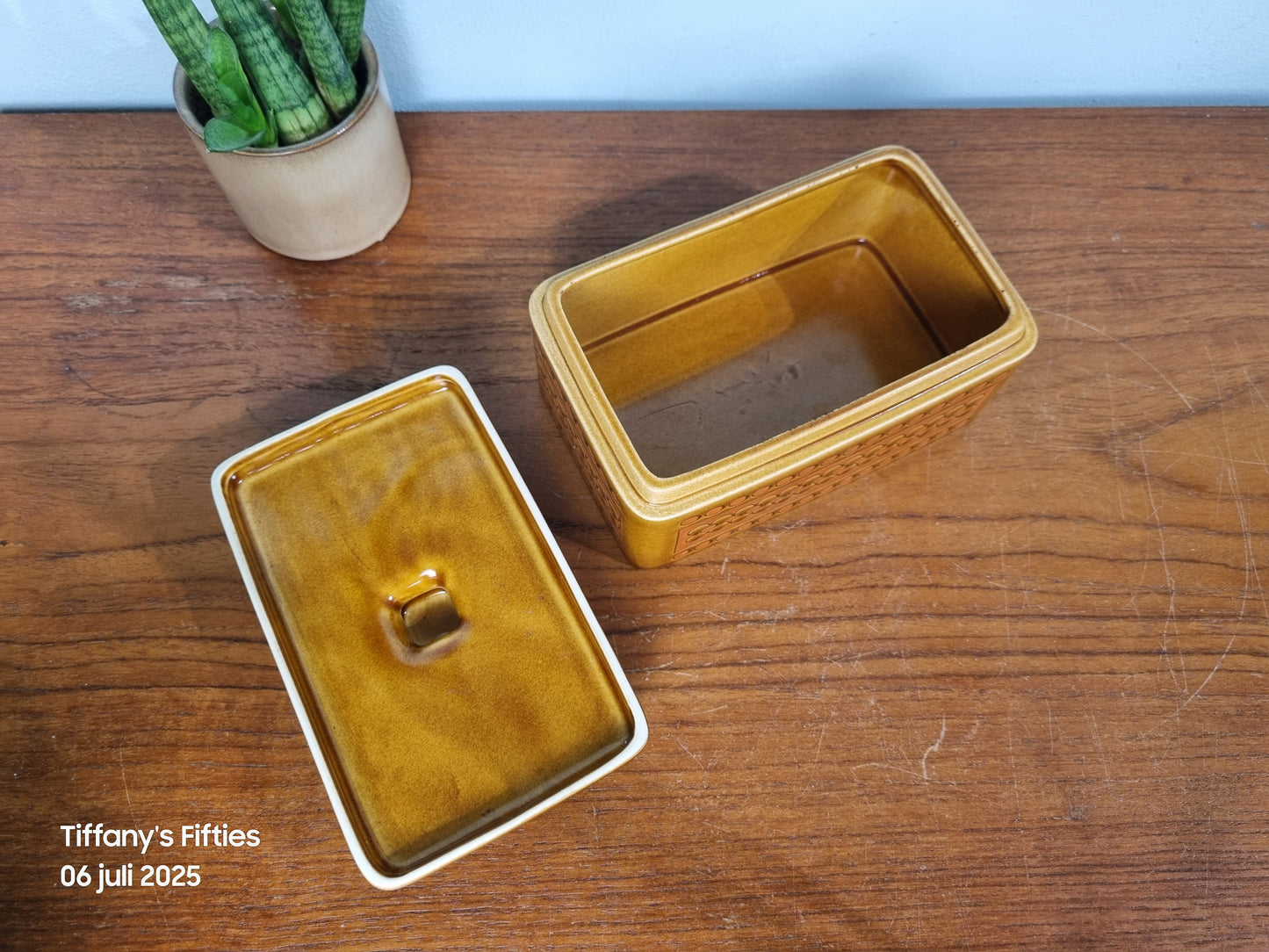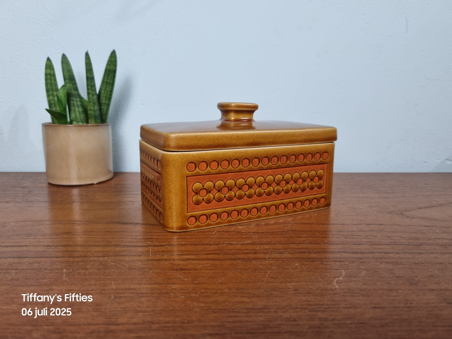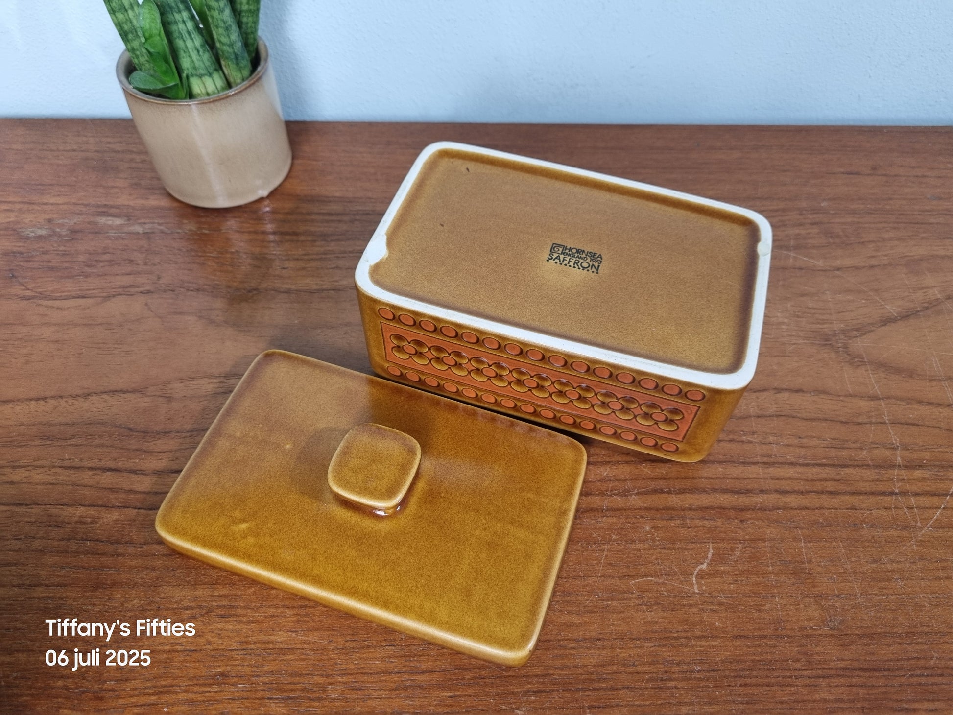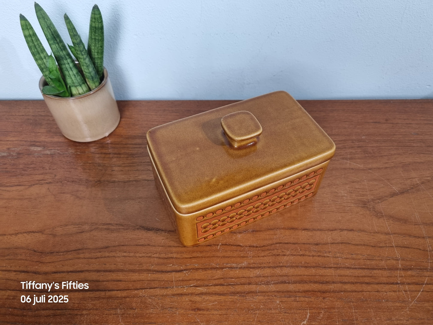 Deze retro voorraadpot van het Engelse merk Hornsea is een iconisch voorbeeld van jaren ’70 keramiek, uitgevoerd in het geliefde ‘Saffron’ patroon. De rechthoekige vorm, warme mosterdbruine glazuur en het karakteristieke geometrische bloemenreliëf maken dit een opvallend en functioneel decorstuk. Het deksel sluit goed af met een geïntegreerde knop en een geglazuurde rand aan de binnenzijde.