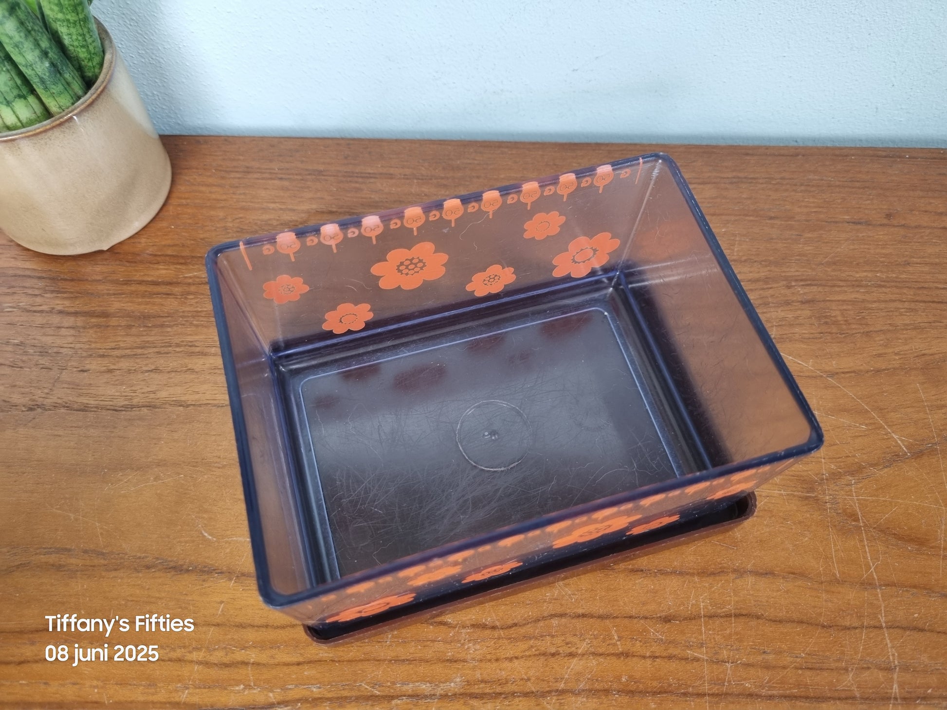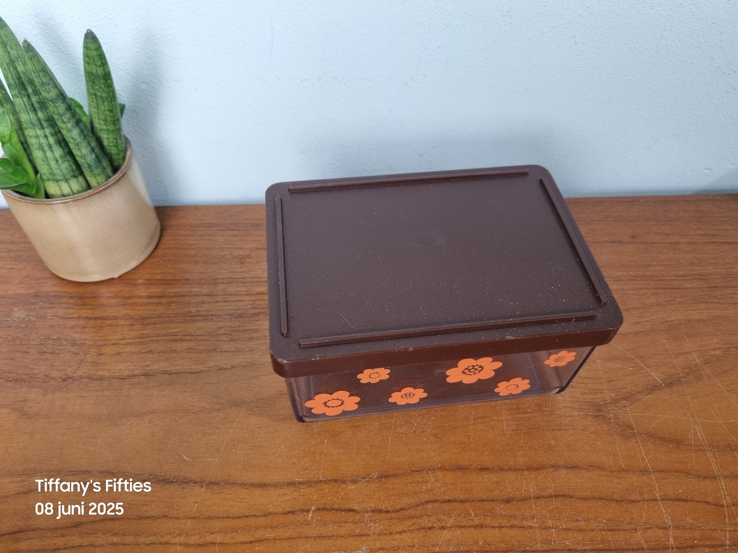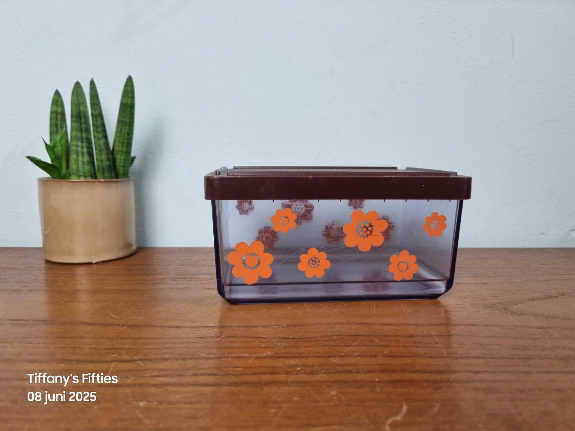 Speelse vintage voorraaddoos van Erik Kold uit Denemarken. Deze rechthoekige plastic bewaardoos is uitgevoerd in transparant kunststof met een chocoladebruin deksel. De vrolijke bloemenprint in feloranje geeft het geheel een uitgesproken jaren ’70 uitstraling. Een typisch Scandinavisch ontwerp dat zowel praktisch als decoratief is.