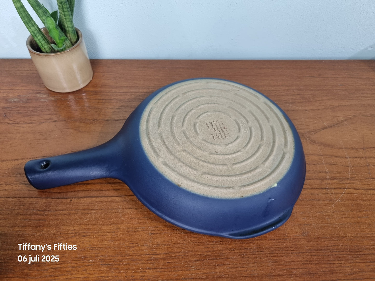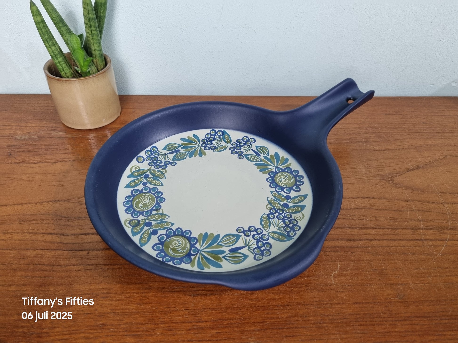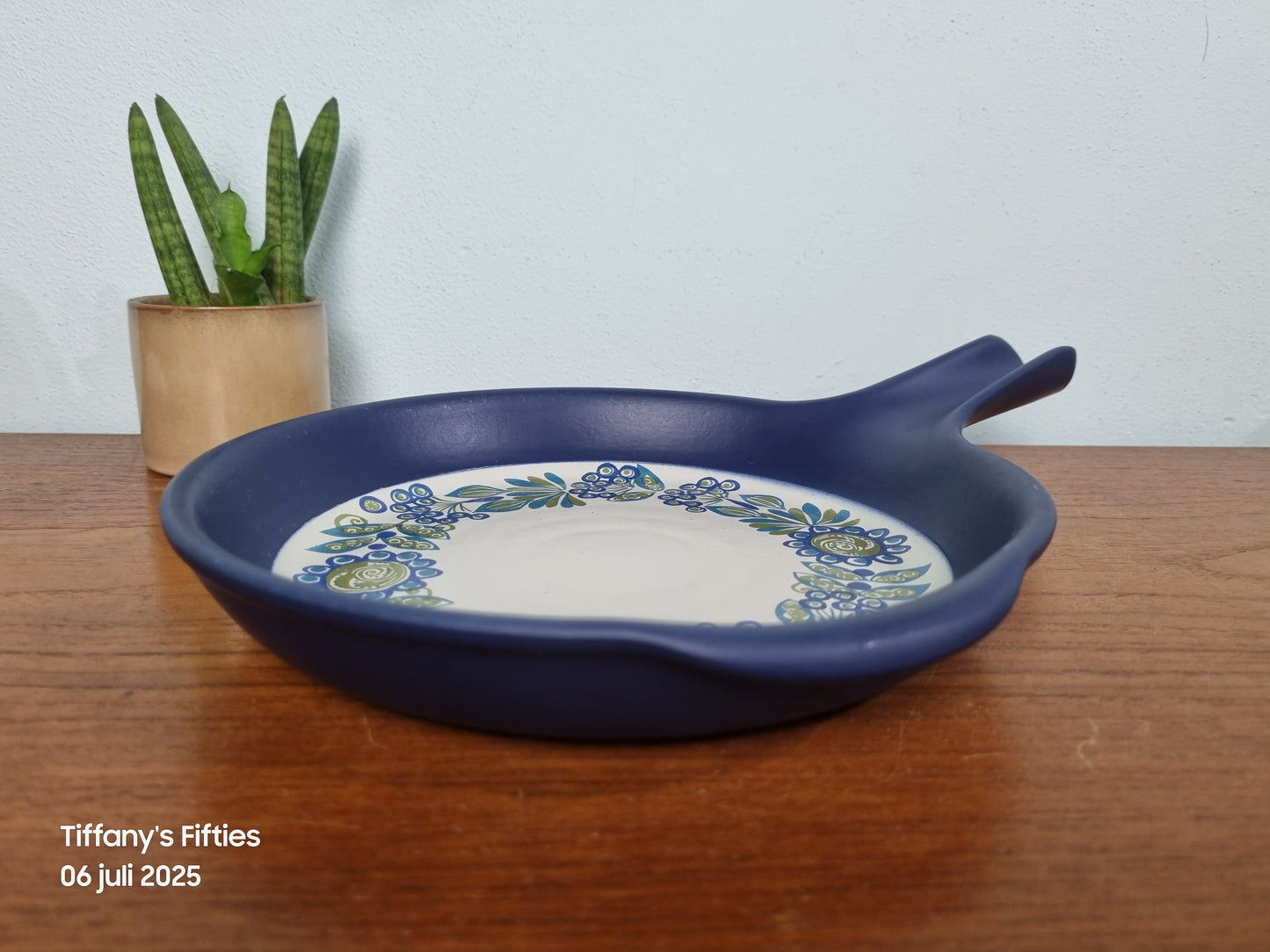 Warme blauw-witte ovenschaal van Figgjo Flint uit Noorwegen, uitgevoerd in het decor Tor Viking. Het speelse bloemen- en bladmotief in blauw en olijfgroen siert het witte binnenvlak, terwijl de buitenzijde een matblauwe afwerking heeft. Het geïntegreerde handvat en de gegroefde onderzijde benadrukken het praktische en rustieke karakter van dit Scandinavisch design uit de jaren ’70.
