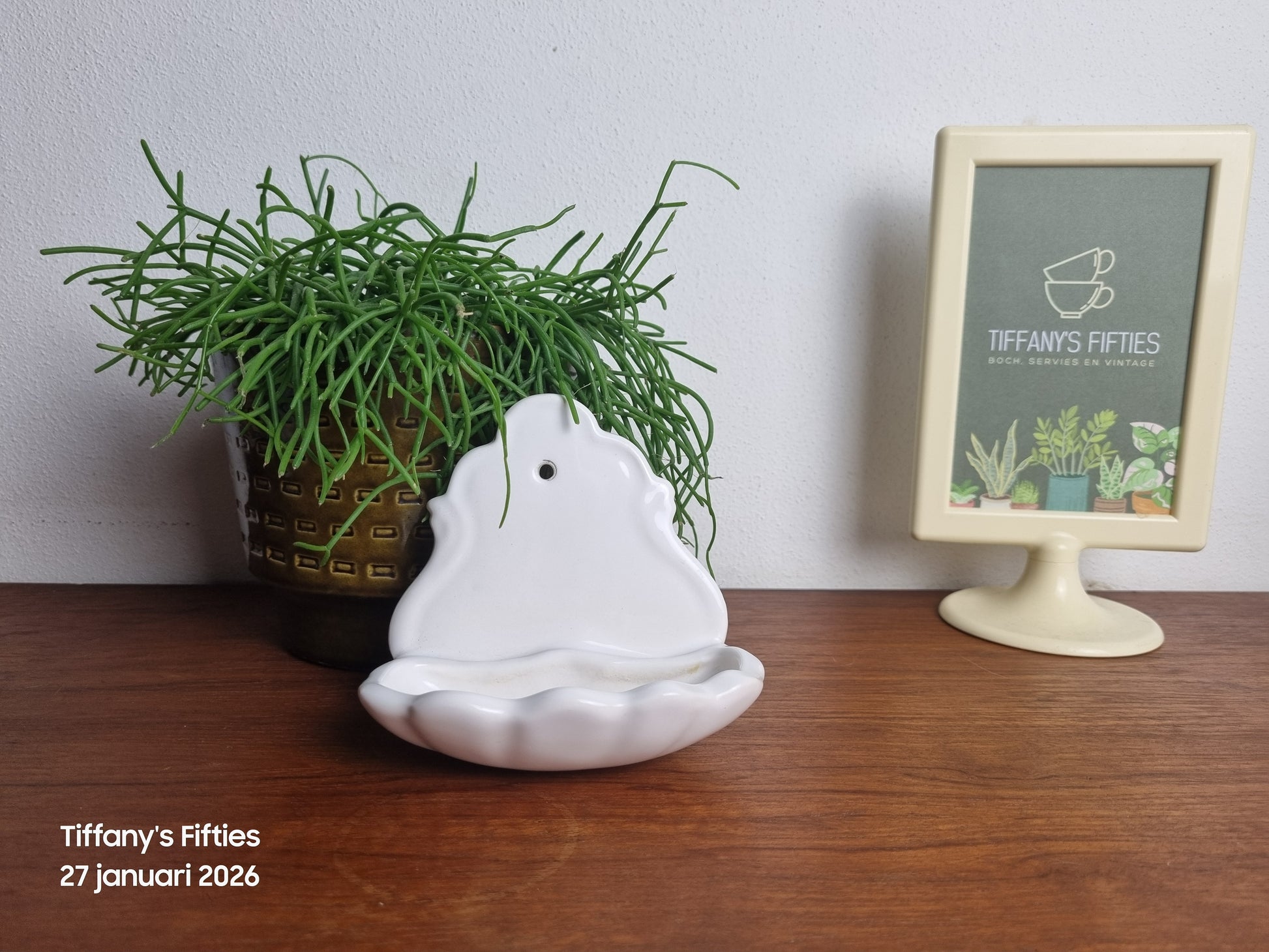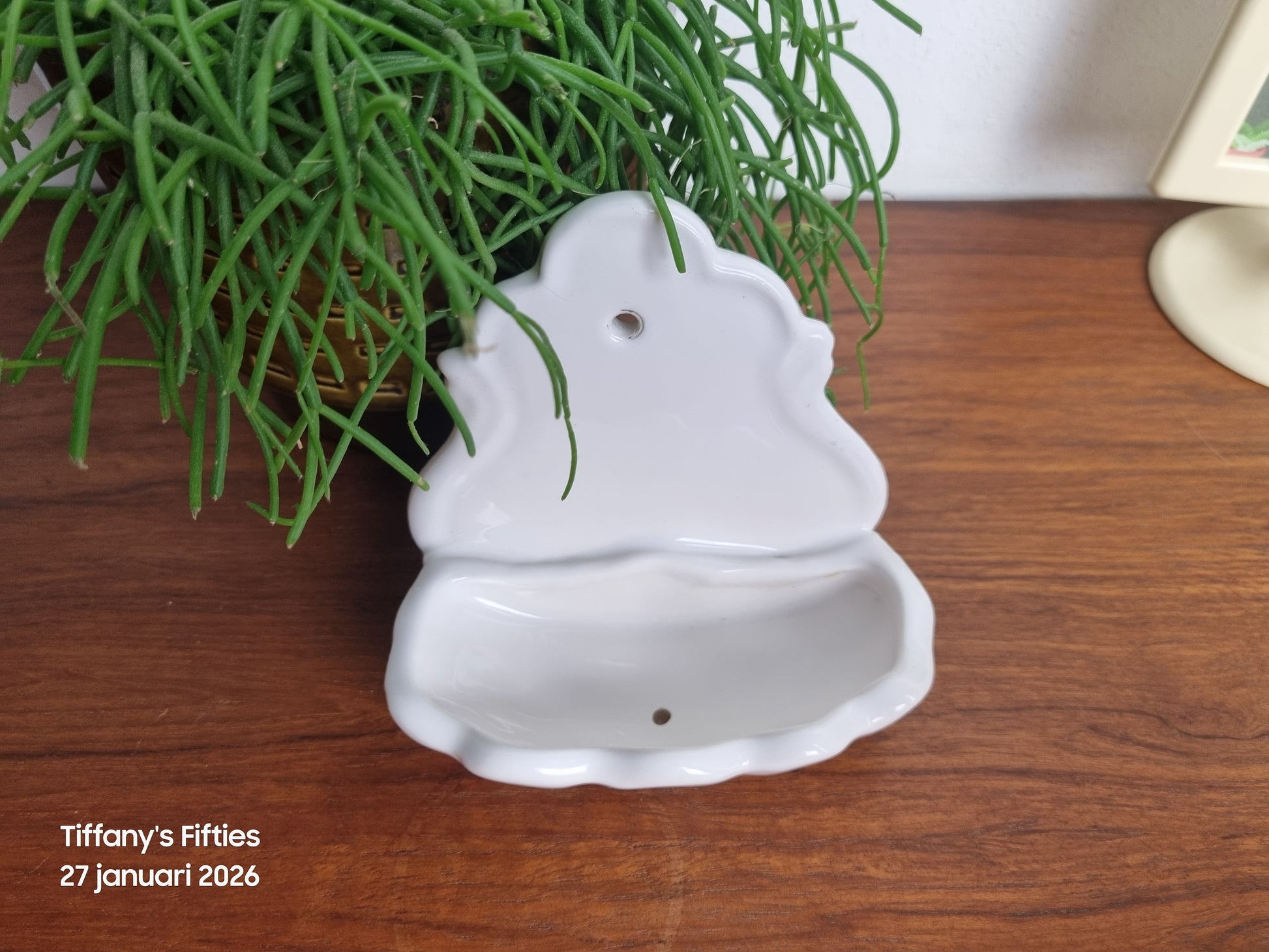 Zeepbakje van Quimper (France), uitgevoerd in wit geglazuurd aardewerk met een sierlijke, golvende vorm. Voorzien van drainagegaatjes en een ophangoog, waardoor het hangend gebruikt kan worden. Een klassiek Frans badkameraccessoire met een tijdloze, landelijke uitstraling.