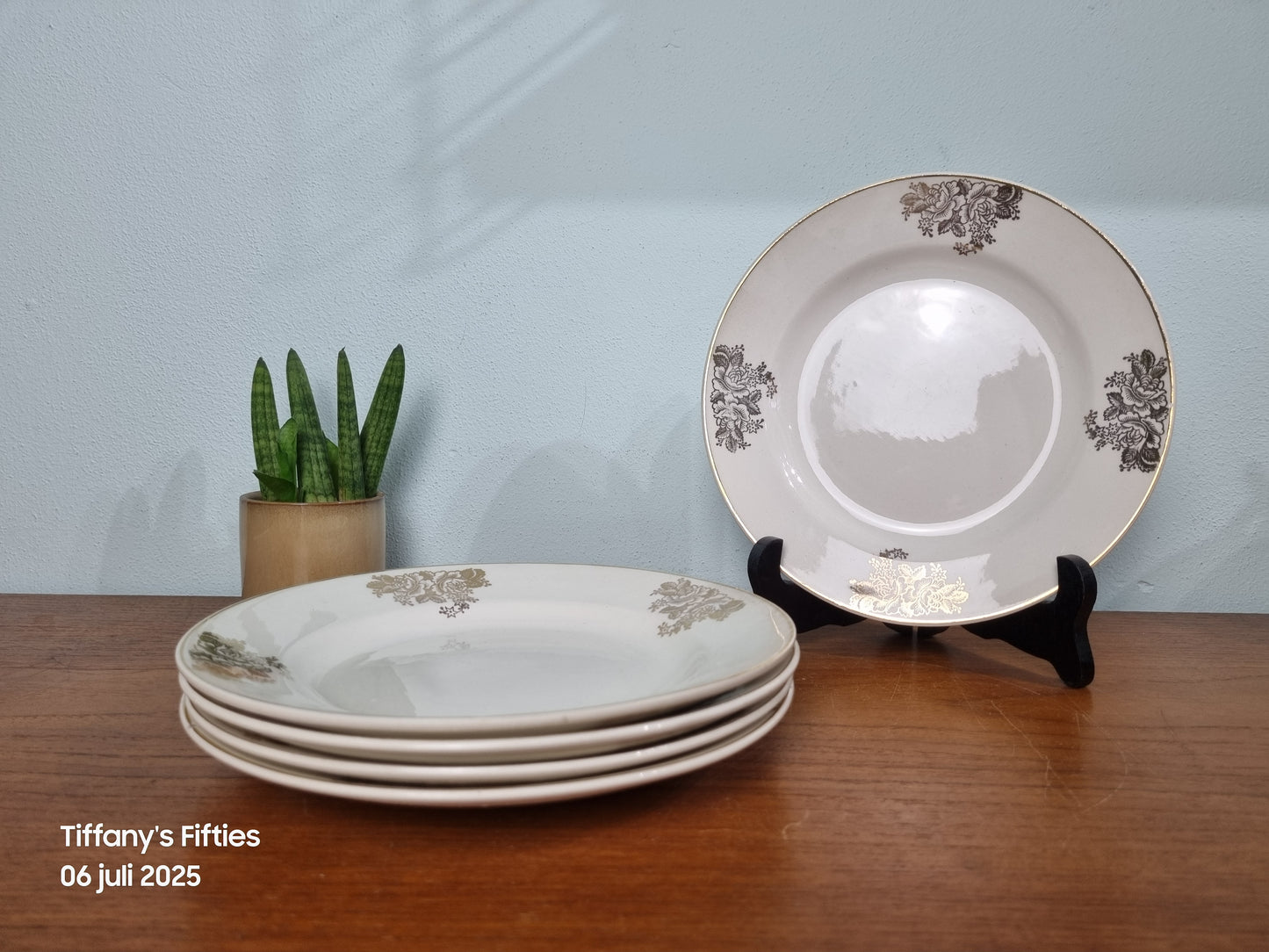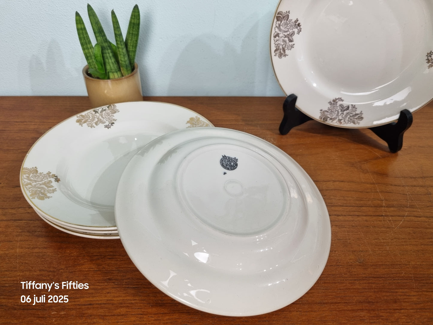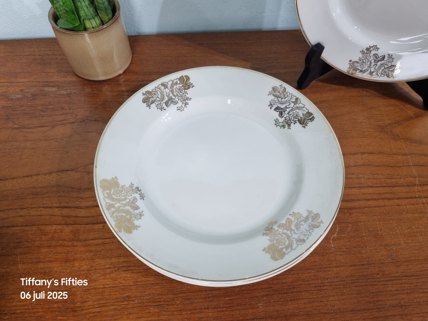 Deze charmante ontbijtborden stralen pure elegantie uit dankzij het klassieke bloemendecor in goud, subtiel aangebracht op een zachte roomwitte basis. De dunne goudrand accentueert de verfijnde uitstraling, perfect voor een feestelijk gedekte tafel.