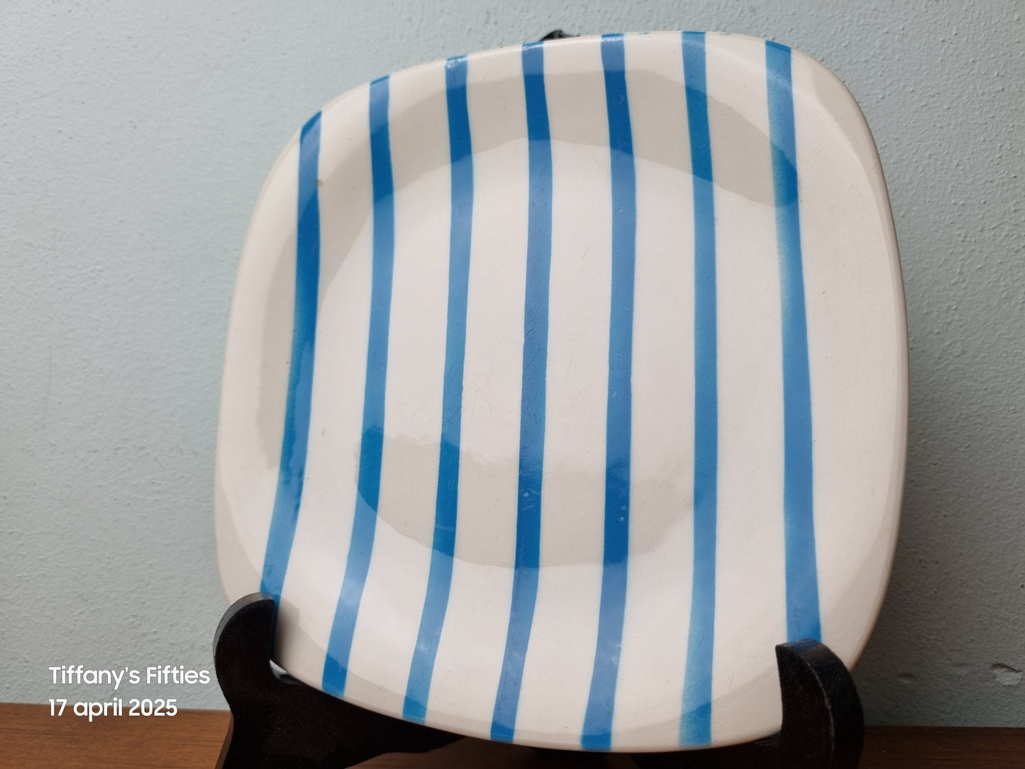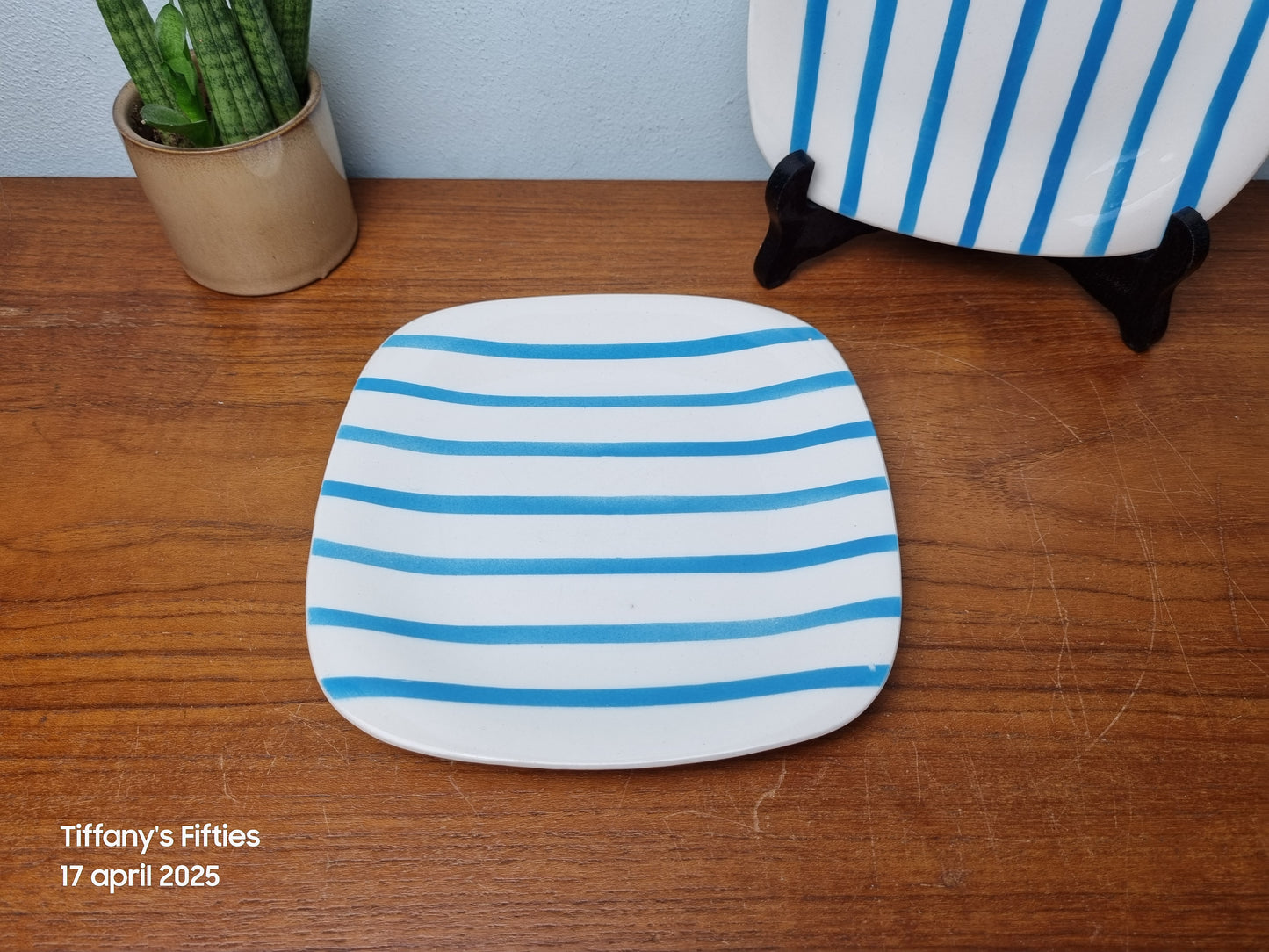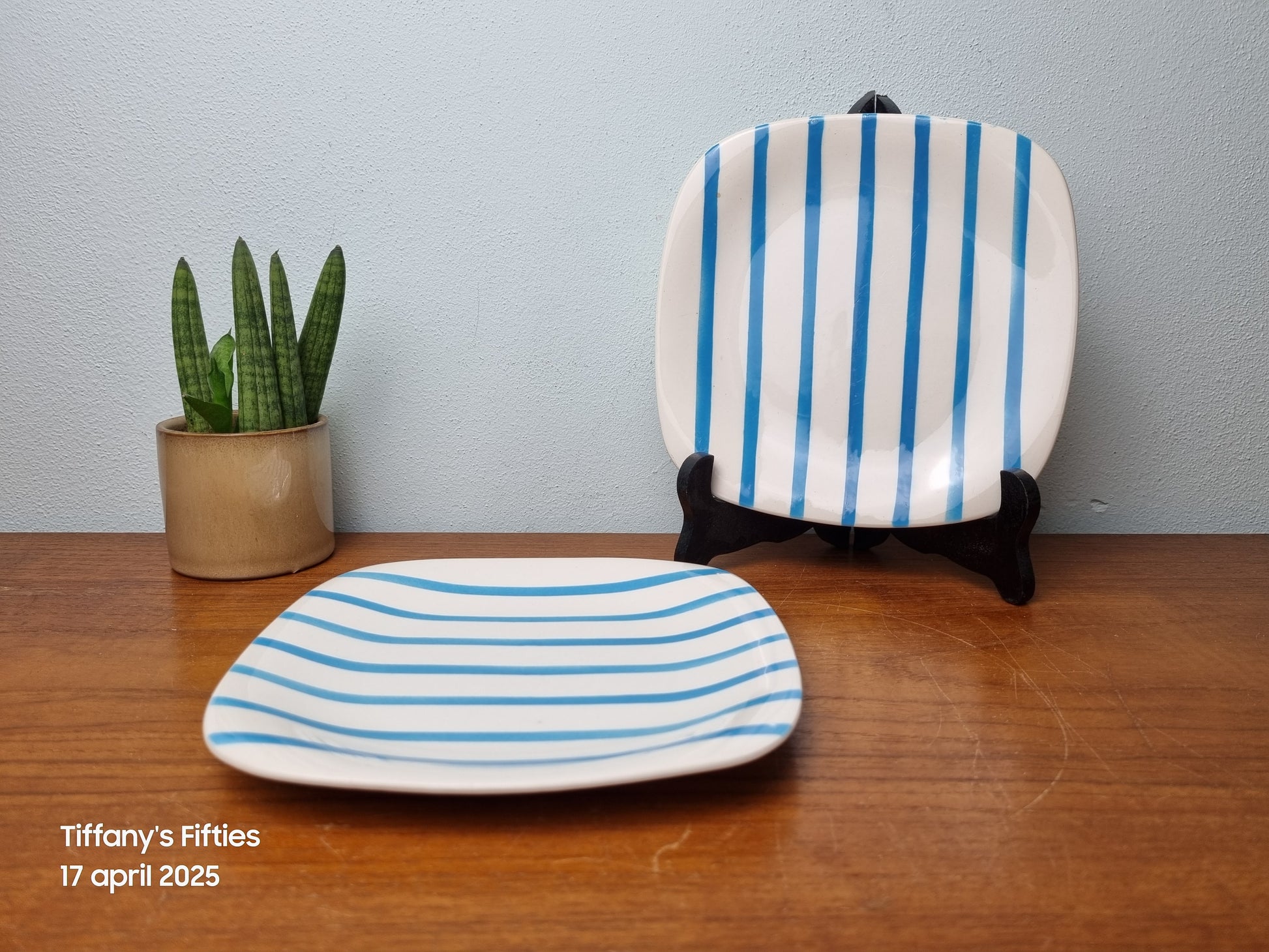 Strakke vintage dessertborden van Boch La Louvière in het opvallende Lignes Verticales-decor. De lichtblauwe handgeschilderde strepen contrasteren krachtig met de crèmekleurige basis, wat zorgt voor een modern en fris geheel met een vleugje retro flair.