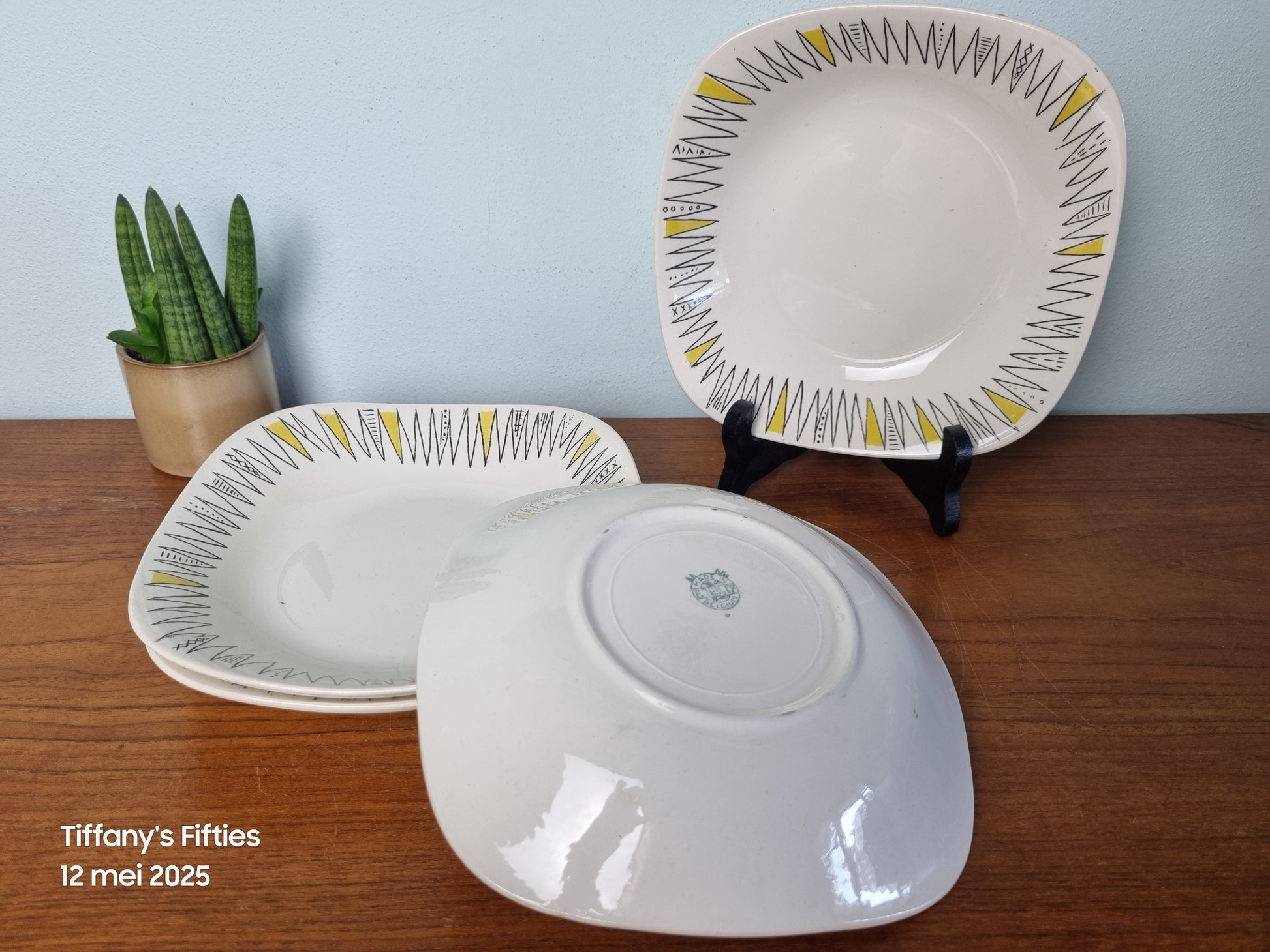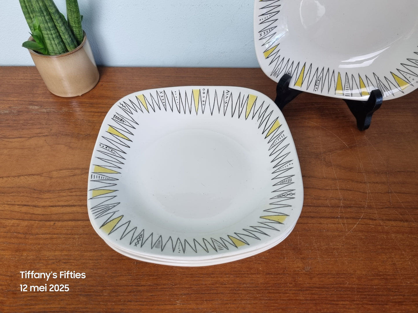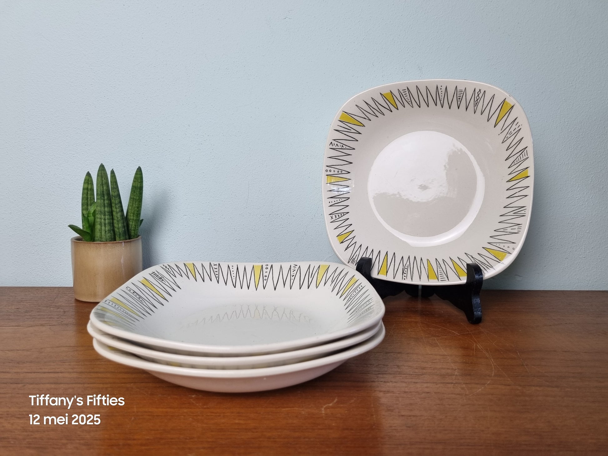 Opvallende vintage diepe borden met een speels grafisch patroon in zwart en geel. De borden hebben een vierkante, licht afgeronde vorm en zijn voorzien van een decoratief zigzagmotief langs de rand – typisch voor het expressieve design uit de jaren ’50.