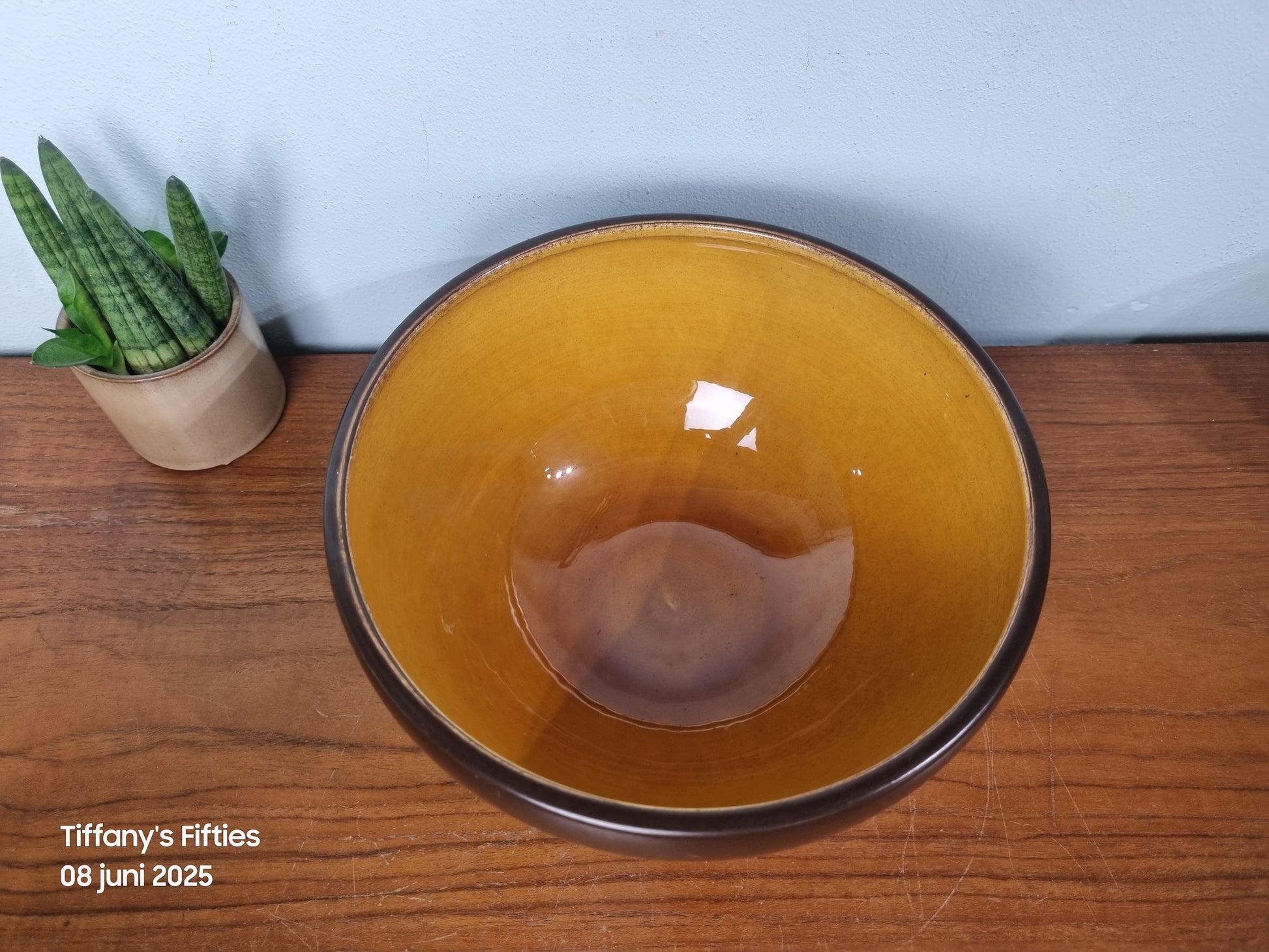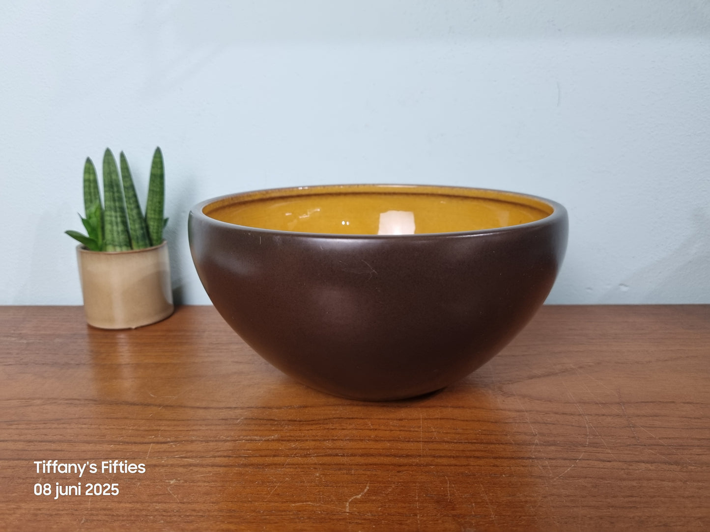 Stijlvolle vintage schaal van Huizen Holland in warme aardetinten. Deze keramieken kom is aan de buitenzijde afgewerkt in mat donkerbruin, terwijl de binnenzijde een glanzende mosterdgele glazuur heeft. De eenvoudige bolvorm en het kleurcontrast geven deze schaal een tijdloos, Scandinavisch geïnspireerd karakter.