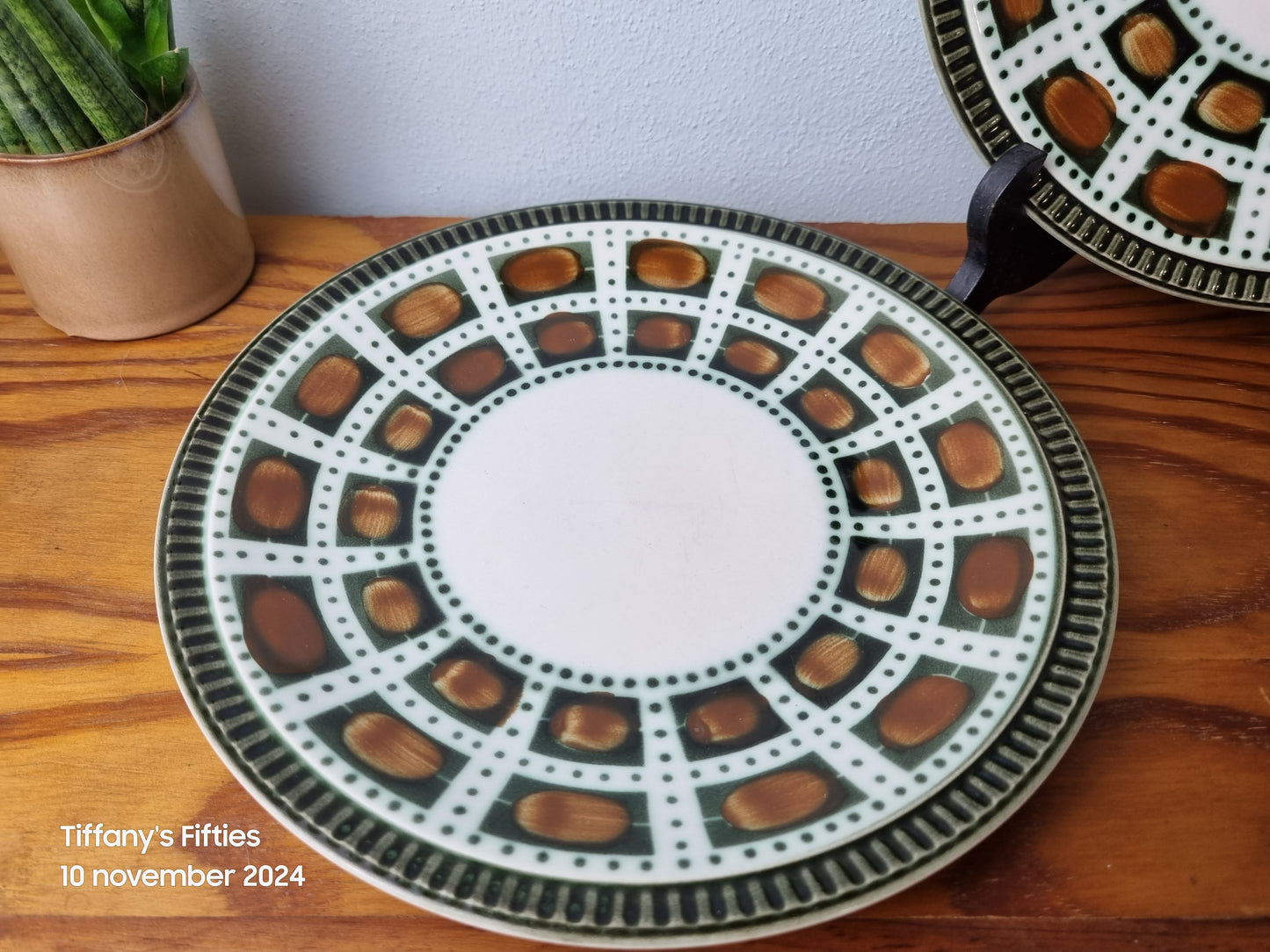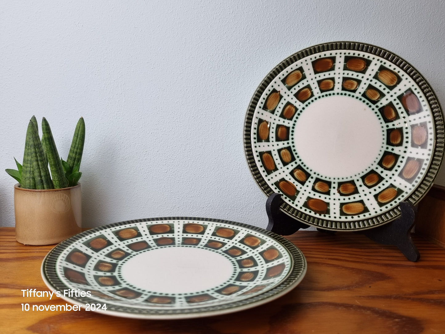 Mooie vintage dinerborden van Boch La Louviere met gekarteld randje model genaamd Delta met handgeschilderd decor Bernadette. Er zijn wat lichte gebruiksporen zichtbaar op de borden, verder in zeer goede staat, zonder schade. Diameter 23 cm.
